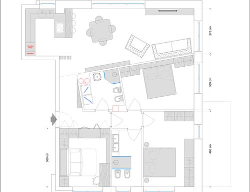 - La cucina dovrebbe prevedere anche una parete con pensili o altro per creare una sorta di chiusura rispetto al soggiorno. Le vostre idee o suggerimenti sono più che benvenuti.