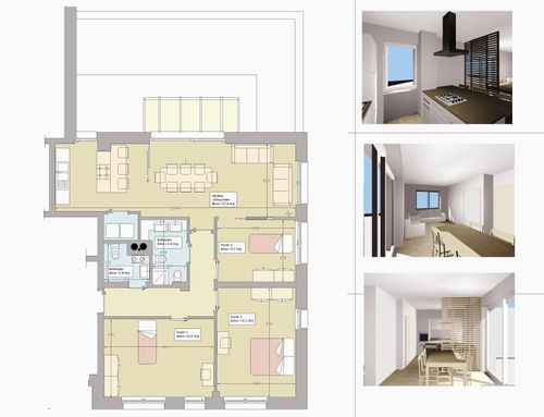 - The kitchen should have a island that culd also be used as dining table for 2/3 people. There should also be a kind of wall which separates the sight from the kictchen to the living room. Your ideas and suggestions on this are more than welcome.