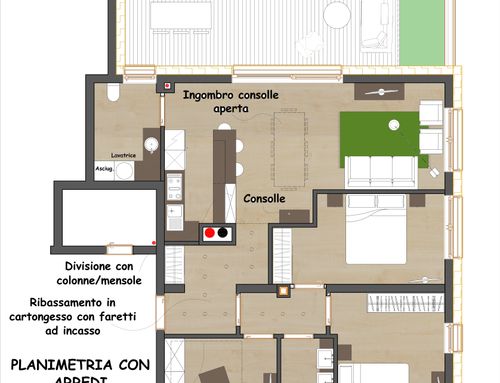 - il soggiorno deve prevedere uno spazio libero centrale dove poter aprire una consolle con 8/10 posti e lo spazio per 2 divani (da 2 e 3 posti) o in alternativa 1 divano a 3 posti e 2 poltrone con la televisione.