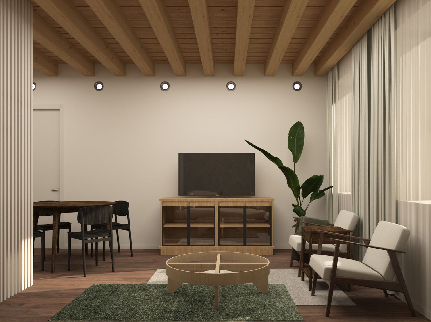 Il living è stato arredato con delle poltrone, dei tavolini e dei tappeti che seguono il mood della casa, posti davanti alla madia che contiene il modem e sulla quale ho posizionato la tv. Il tavolo tondo allungabile è stato poi collocato in prossimità delle prese elettriche per avere anche una comoda postazione lavoro.