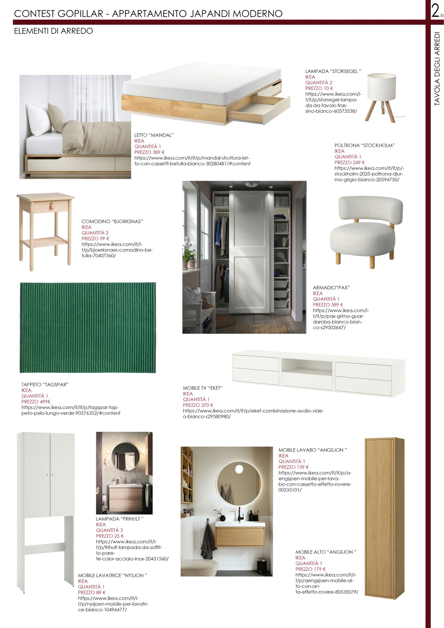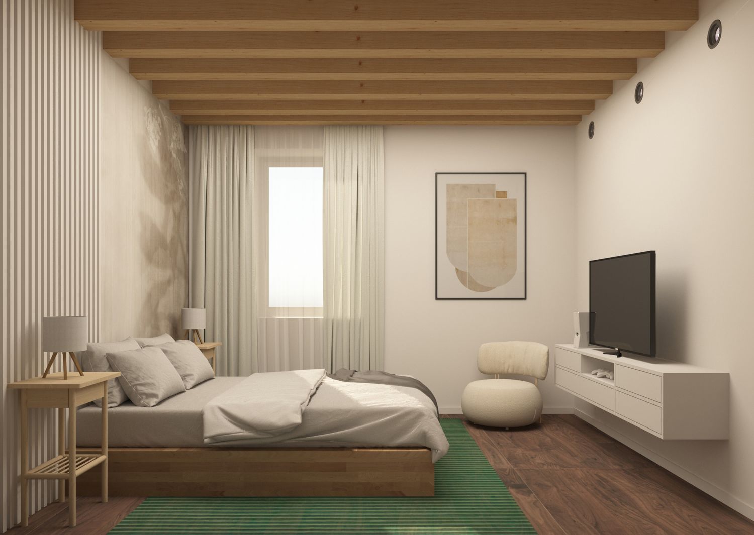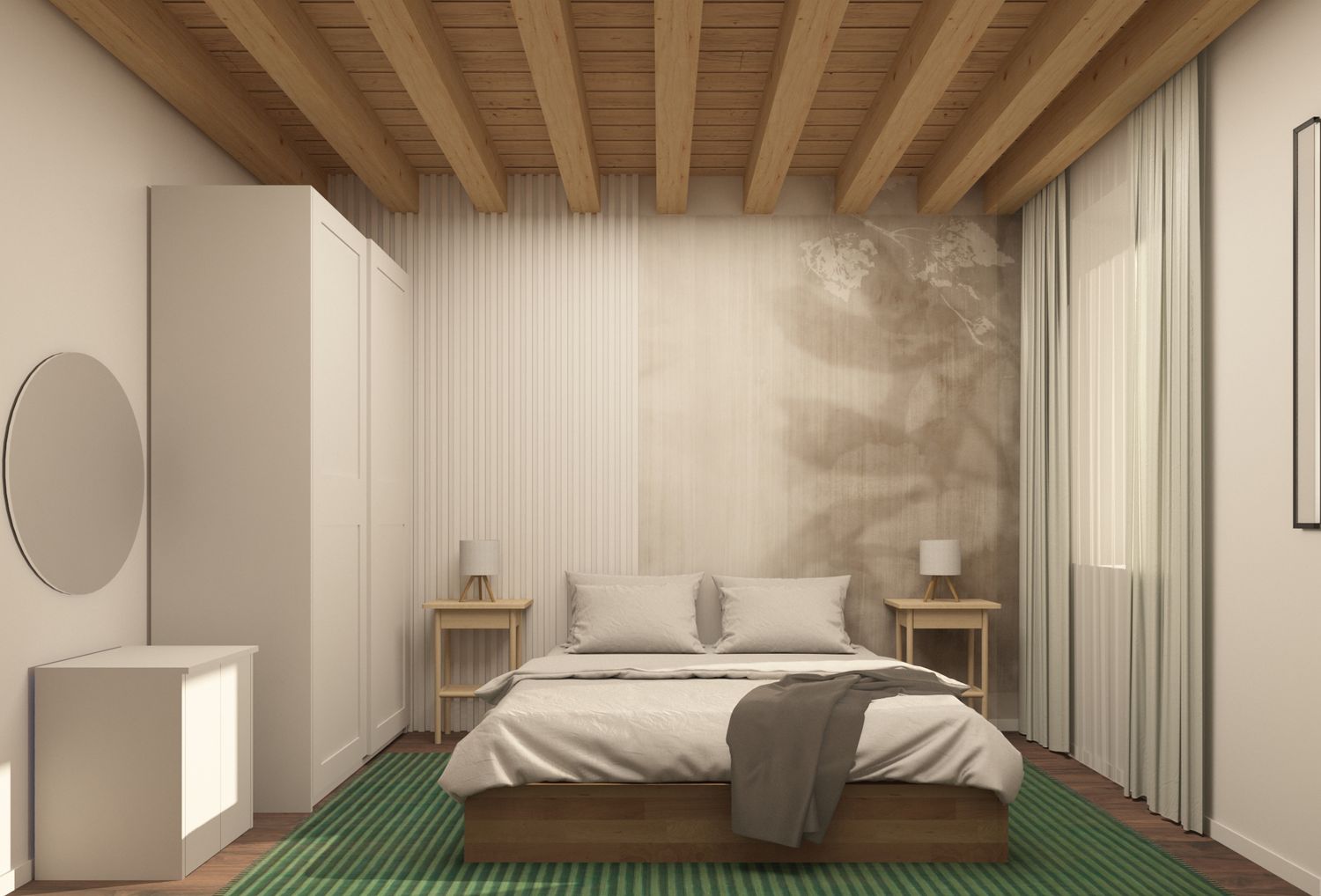 La camera da letto segue lo stile scelto per l'immobile, con gli elementi di arredo da Lei richiesti dai toni del bianco intervallati da complementi, invece, dai toni del verde. Anche alle spalle del letto (la cui base è dotata di cassetti) ho pensato di inserire la boiserie in listelli, con l'aggiunta del parato "illusion" sempre dell'azienda Glamora. Affianco all'armadio ho, inoltre, posizionato un mobiletto contenente il robottino per pulire i pavimenti e, per adattarmi alle misure di quest'ultimo, oltre alla esigenza di avere spazio davanti ad esso, ho pensato che sarebbe meglio realizzarlo di falegnameria.