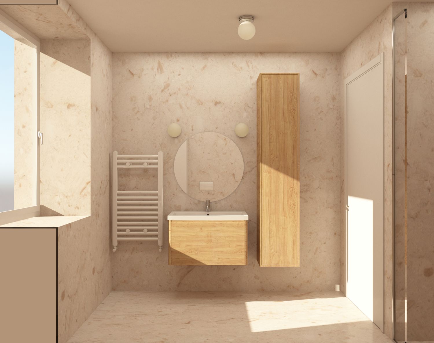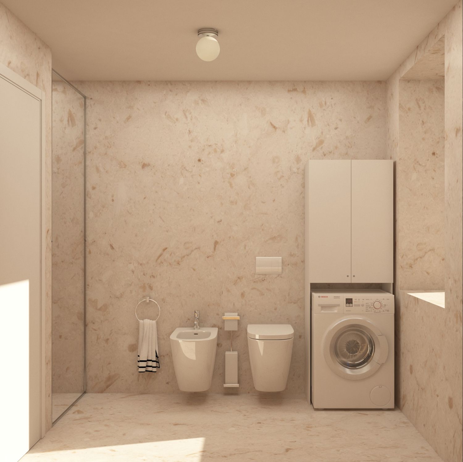 Per quanto concerne il bagno, ho scelto dei mobiletti contenitivi sia per il lavabo sia per la lavatrice, aggiungendo anche un pensile per aumentare la capienza. Ho rispettato il posizionamento degli impianti e ho aggiunto sia il vetro per la doccia sia le lampade per l'illuminazione in linea con le finiture cromate della rubinetteria.