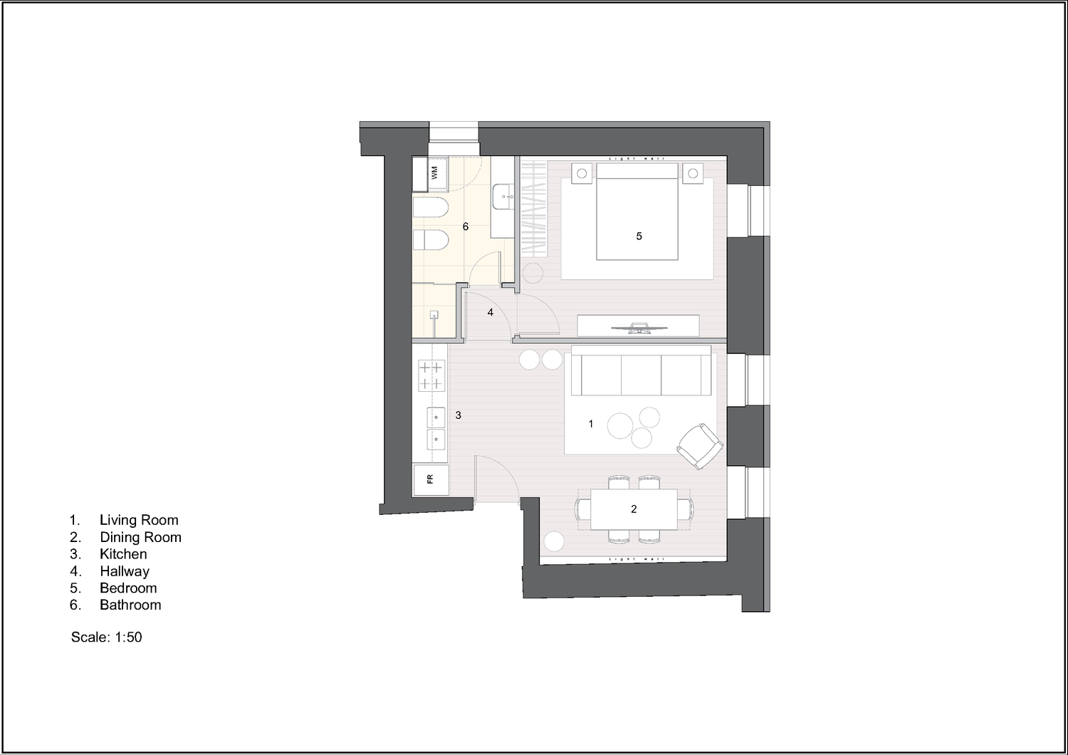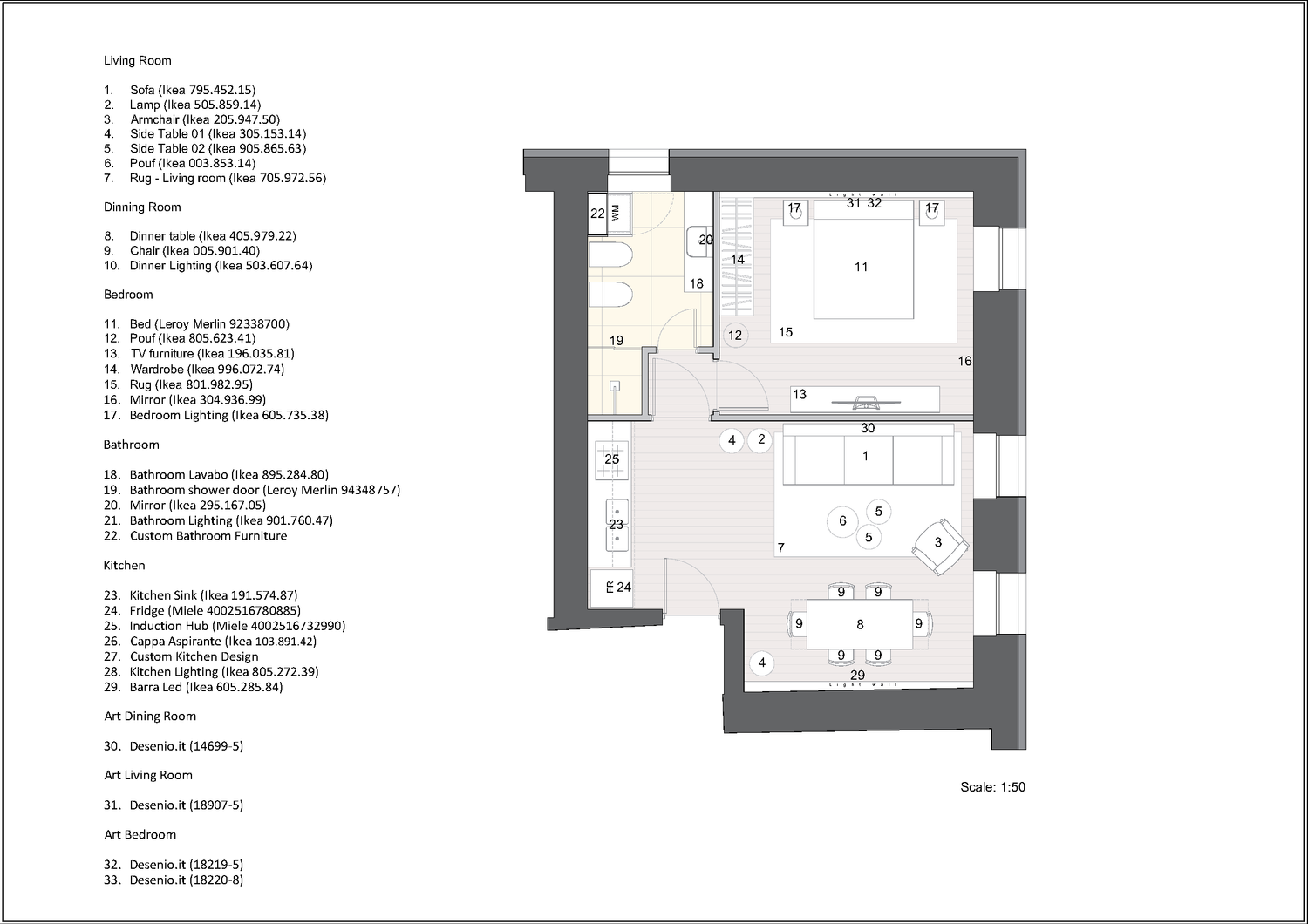L’arredamento, pulito e funzionale, è stato progettato per favorire il benessere e la tranquillità, invitando il residente a rallentare e godersi ogni momento in casa. I mobili sono stati selezionati con cura pensando alla versatilità: un divano letto permette di ospitare facilmente amici, mentre i tavolini da caffè possono essere riadattati in base alle esigenze dello spazio. Su richiesta del cliente, è stato specificato un tavolo da pranzo allungabile con doppia funzionalità perfetto sia per ricevere ospiti che per lavorare abbinato a sedie confortevoli che si armonizzano con il resto dell’arredamento.
