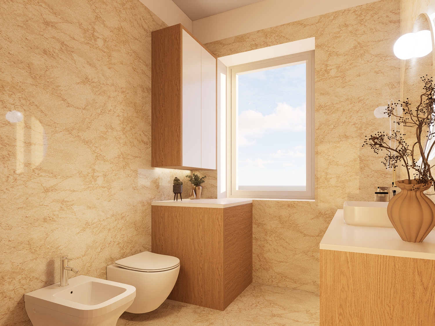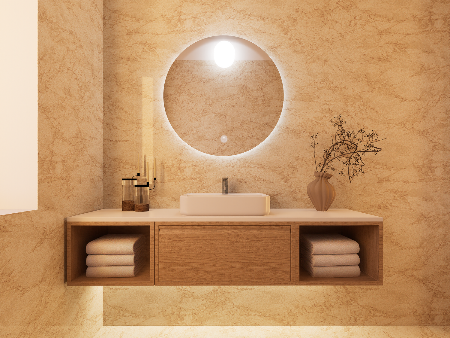 Nel bagno, lo stesso concetto si riflette attraverso l’unità visiva tra materiali, illuminazione e arredi. Le pareti color sabbia e i mobili in legno chiaro mantengono continuità e calore in tutto l’appartamento. Lo specchio circolare retroilluminato e la luce indiretta sotto il mobile lavabo creano un effetto delicato che valorizza le texture e rafforza la sensazione di calma. Ogni dettaglio è stato pensato con attenzione per offrire un’esperienza sensoriale rilassante e armoniosa, dove funzionalità ed estetica convivono in perfetta sintonia.