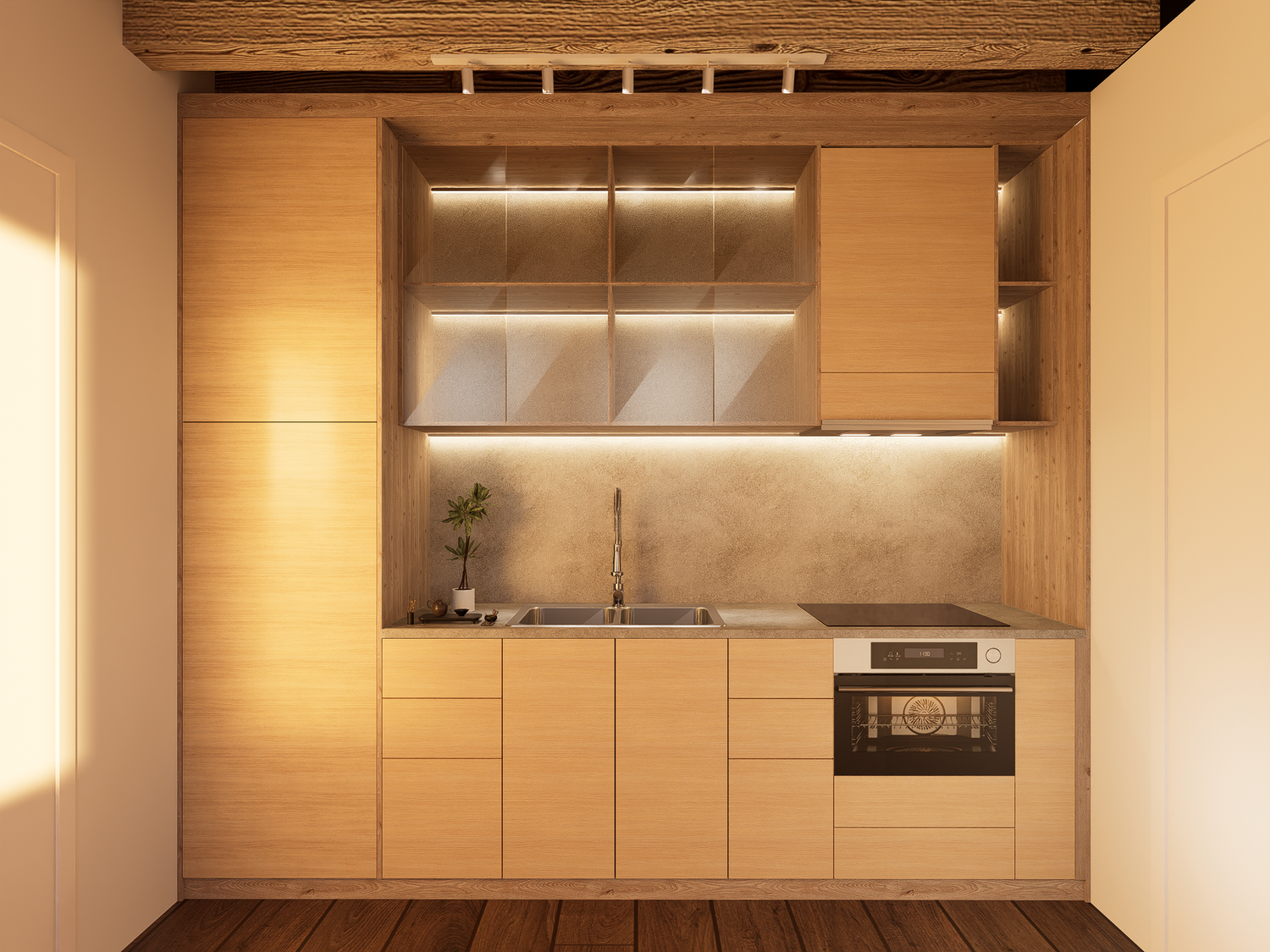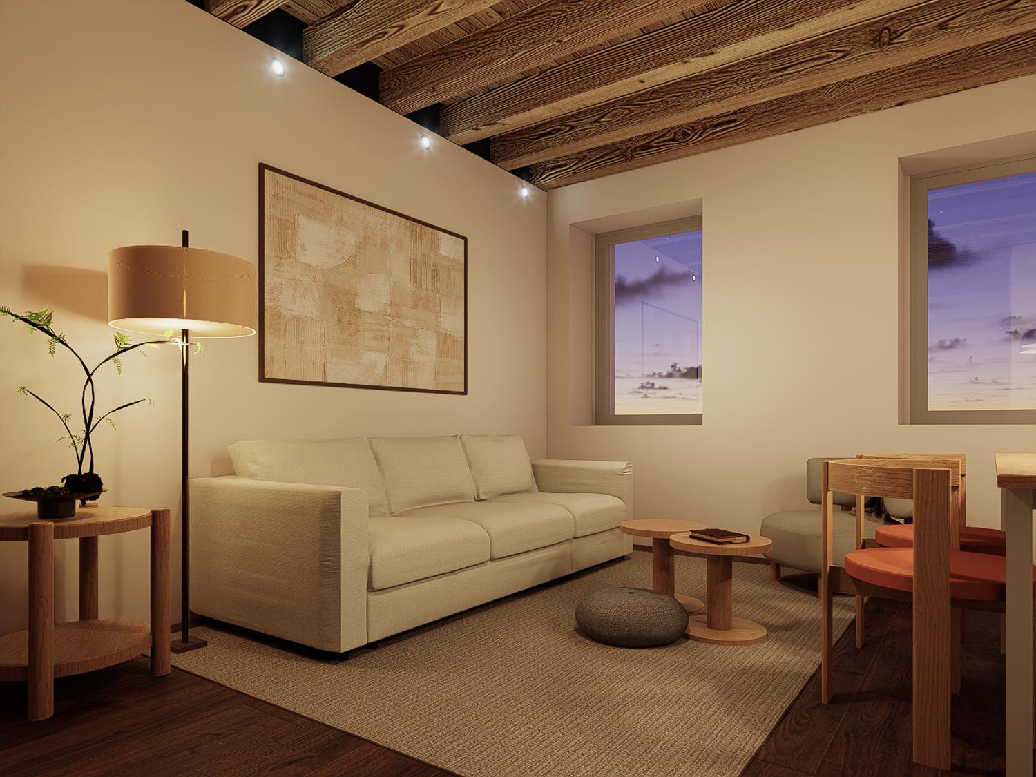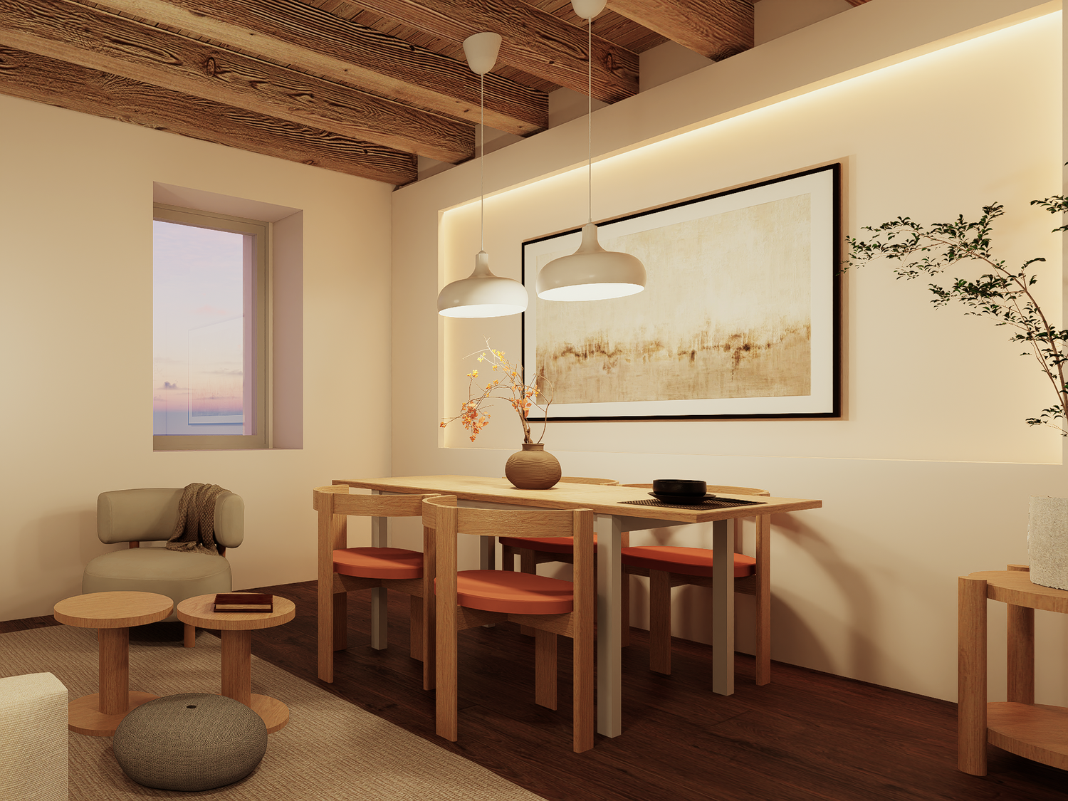 Un progetto di interior design che cerca di esprimere l’equilibrio tra il minimalismo scandinavo e la serenità giapponese, dando vita a un’estetica Japandi moderna. La palette di colori neutri crea un’atmosfera luminosa e accogliente, in perfetta armonia con il pavimento in legno e le travi a vista del soffitto, che aggiungono texture e calore naturale agli ambienti.