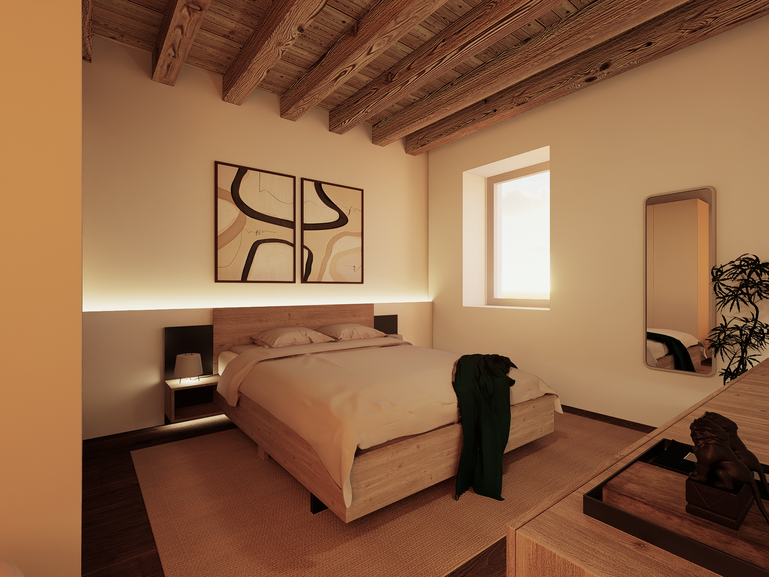 Per la camera da letto, abbiamo creato un’atmosfera accogliente ed equilibrata. La continuità del pavimento in legno e delle travi a vista dona calore allo spazio. La palette neutra rafforza la sensazione di serenità, mentre l’illuminazione indiretta dietro la testata del letto crea una luce soffusa e invitante perfetta per momenti di riposo e relax.