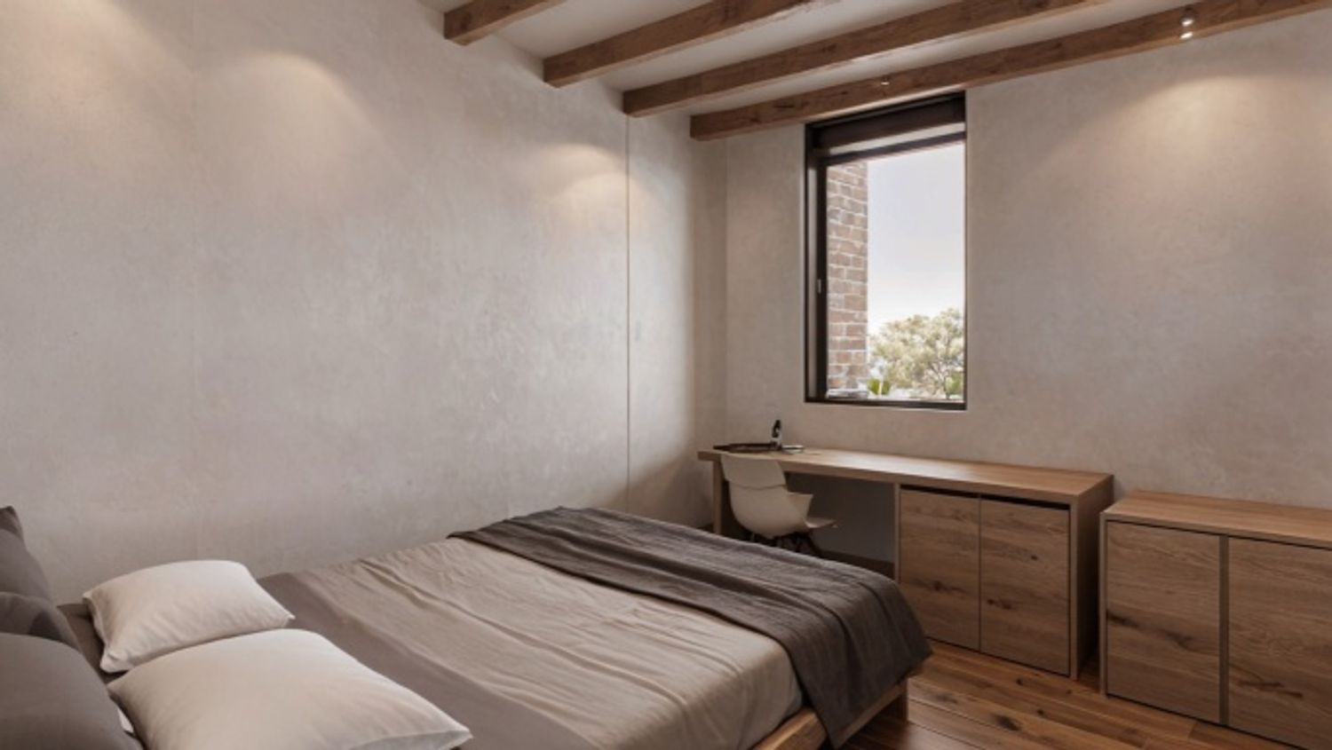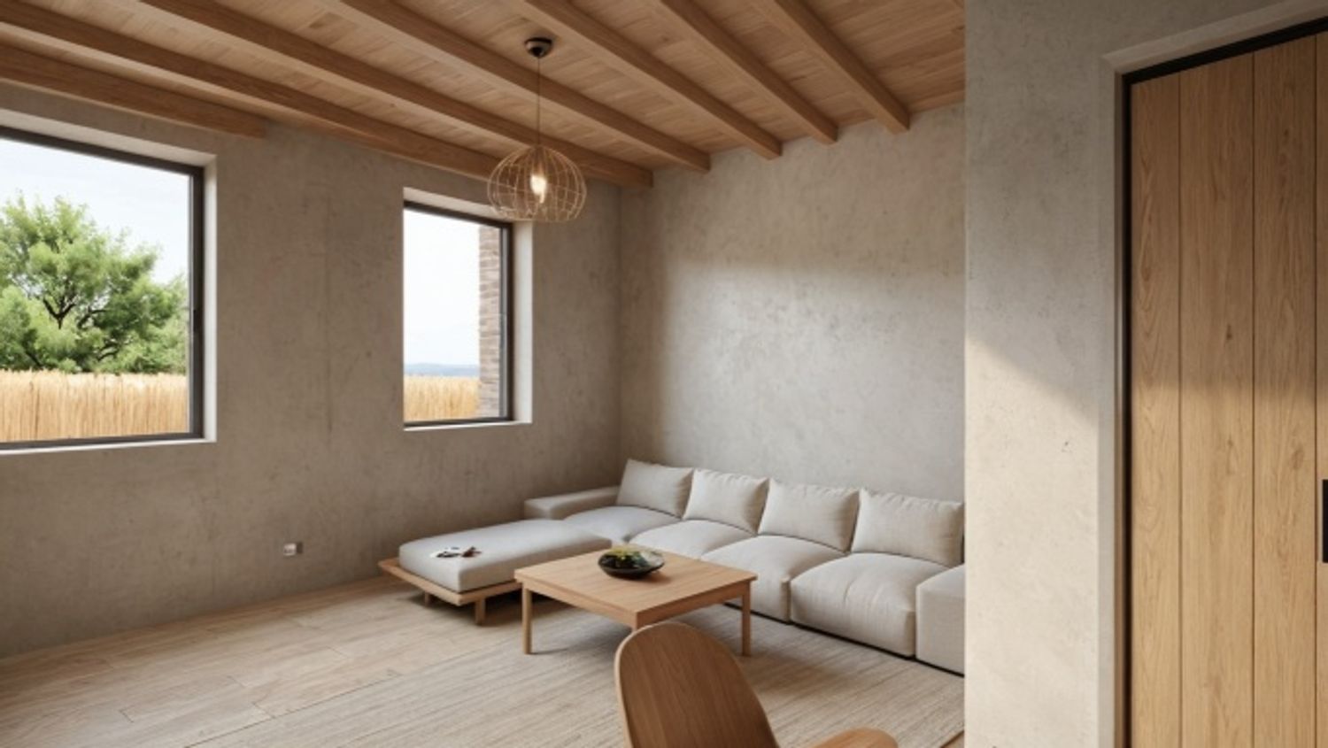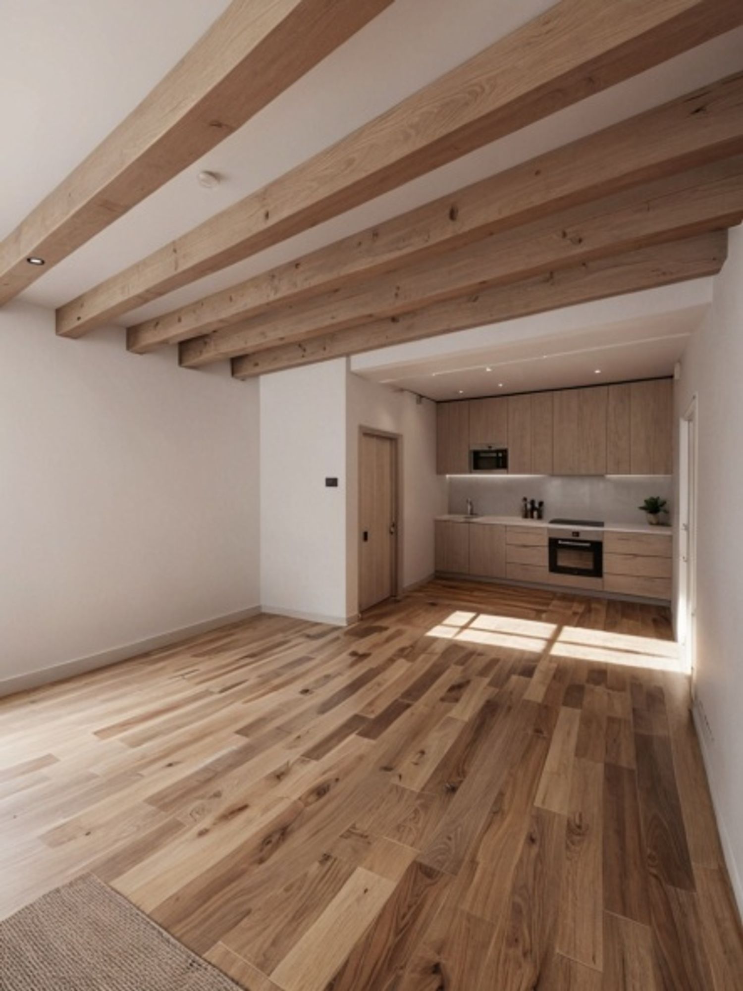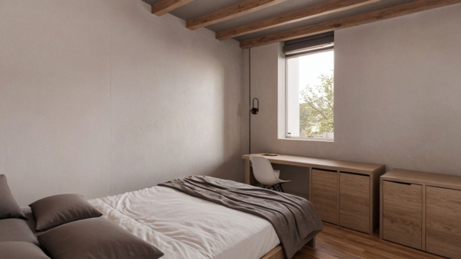 In this project, the existing interior — preserving original features such as exposed wooden beams and dark flooring — has been redesigned in a Japandi / Wabi-sabi minimal aesthetic. Low-profile furniture, natural materials like wood and linen, a calm neutral palette, and soft lighting create a serene, functional, and contemporary living environment. The open-plan living with kitchen, a tranquil bedroom, and a minimal, refined bathroom have been carefully planned to provide both comfort and visual harmony.
