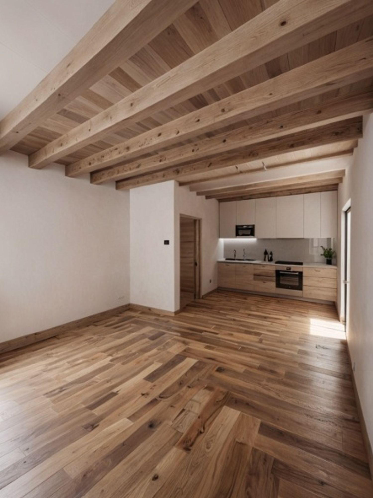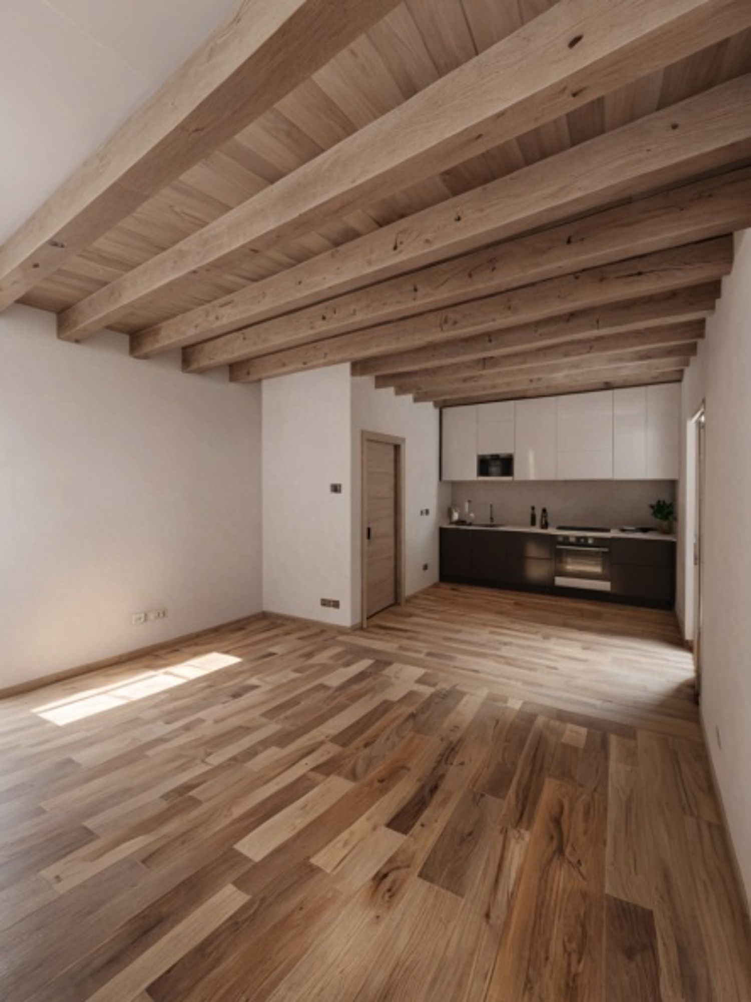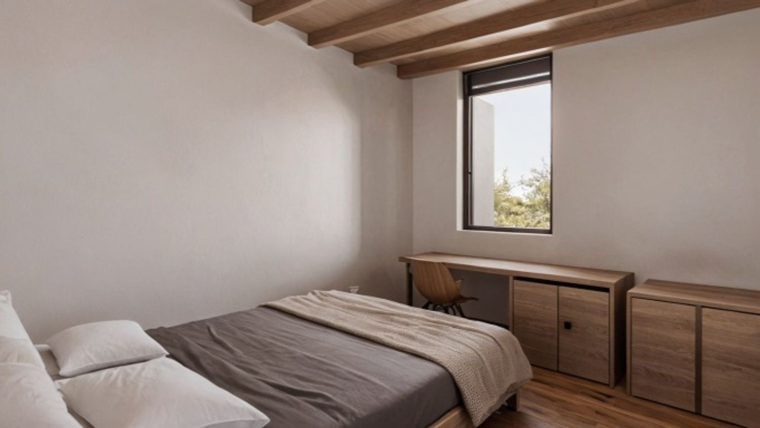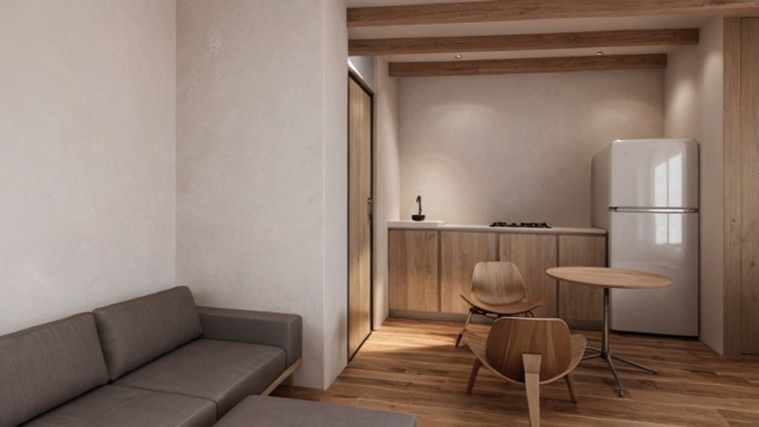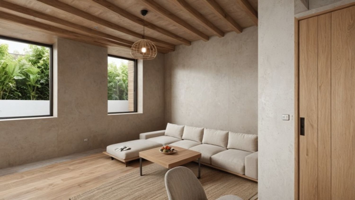 In this project, the existing interior — preserving original features such as exposed wooden beams and dark flooring — has been redesigned in a Japandi / Wabi-sabi minimal aesthetic. Low-profile furniture, natural materials like wood and linen, a calm neutral palette, and soft lighting create a serene, functional, and contemporary living environment. The open-plan living with kitchen, a tranquil bedroom, and a minimal, refined bathroom have been carefully planned to provide both comfort and visual harmony.