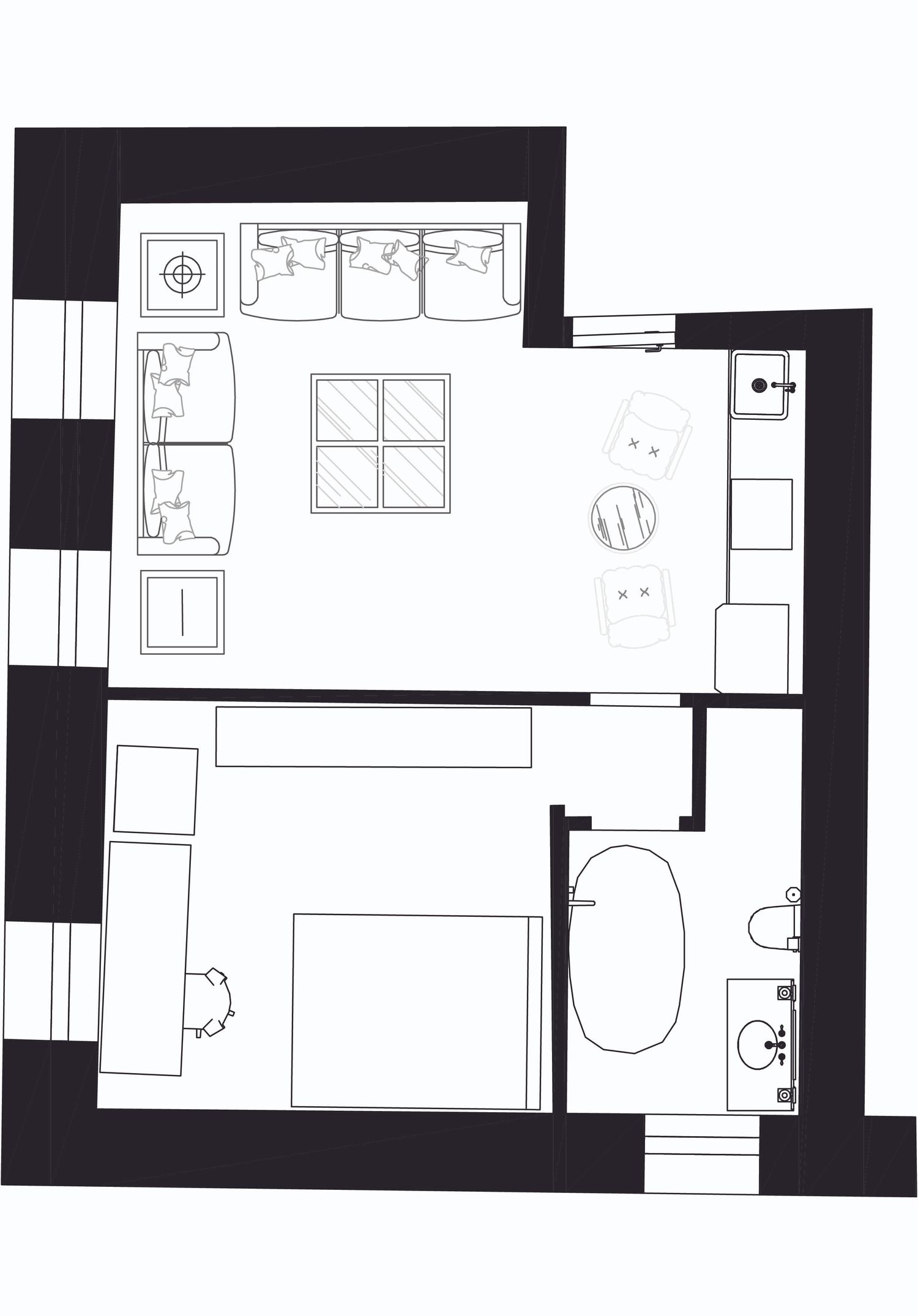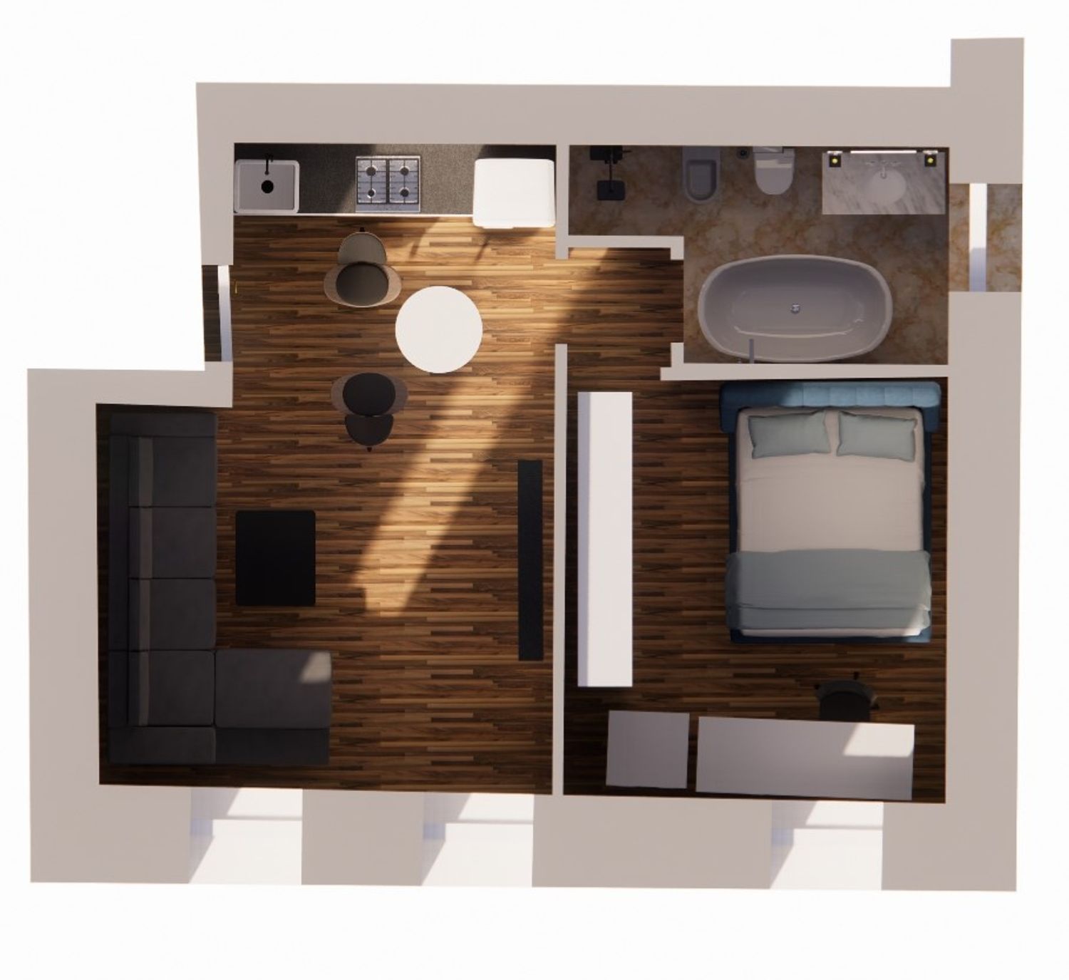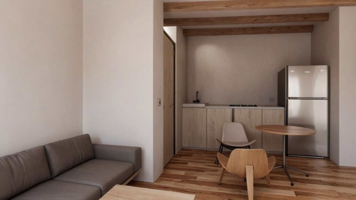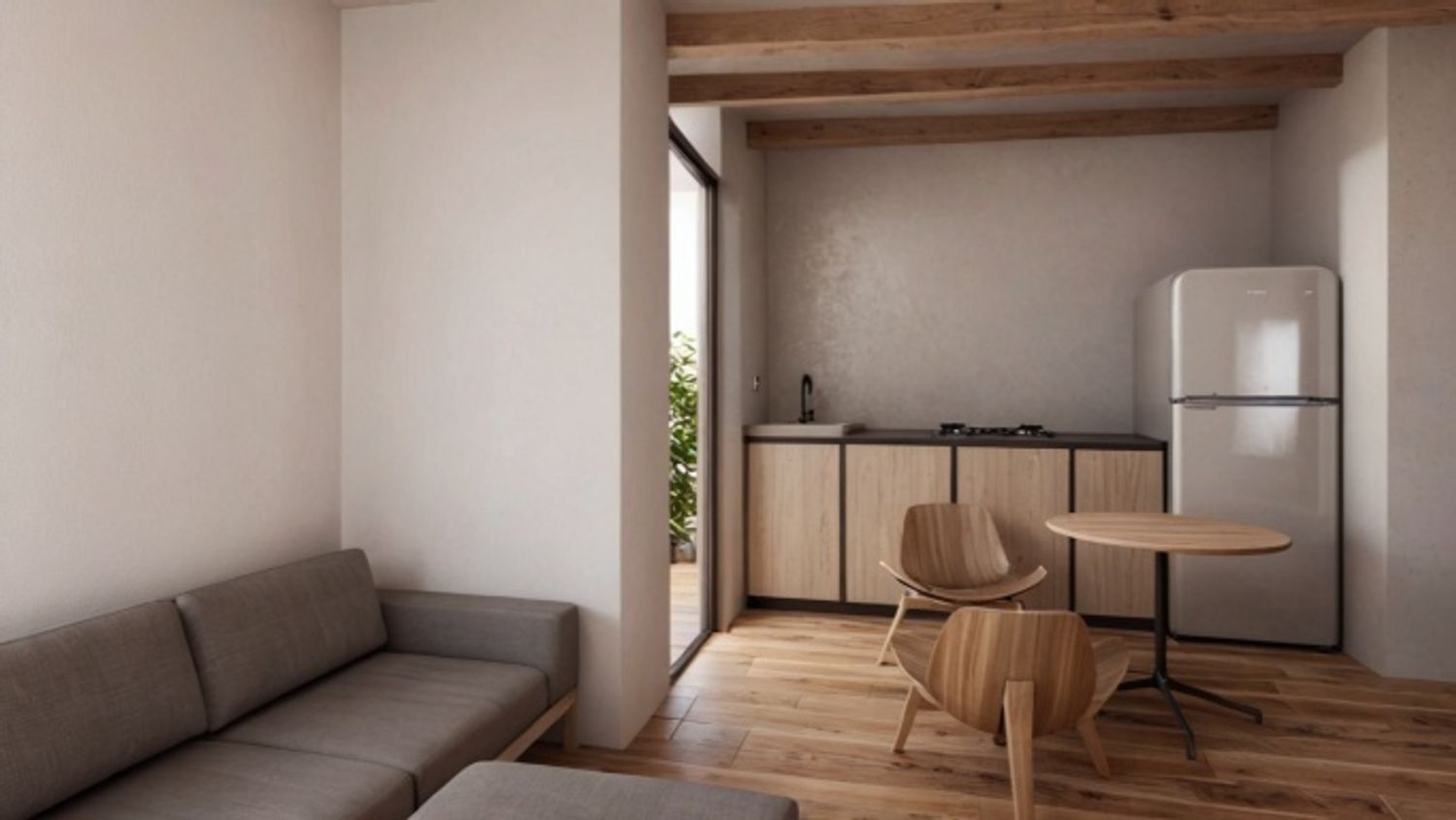 In this project, the existing interior — preserving original features such as exposed wooden beams and dark flooring — has been redesigned in a Japandi / Wabi-sabi minimal aesthetic. Low-profile furniture, natural materials like wood and linen, a calm neutral palette, and soft lighting create a serene, functional, and contemporary living environment. The open-plan living with kitchen, a tranquil bedroom, and a minimal, refined bathroom have been carefully planned to provide both comfort and visual harmony.