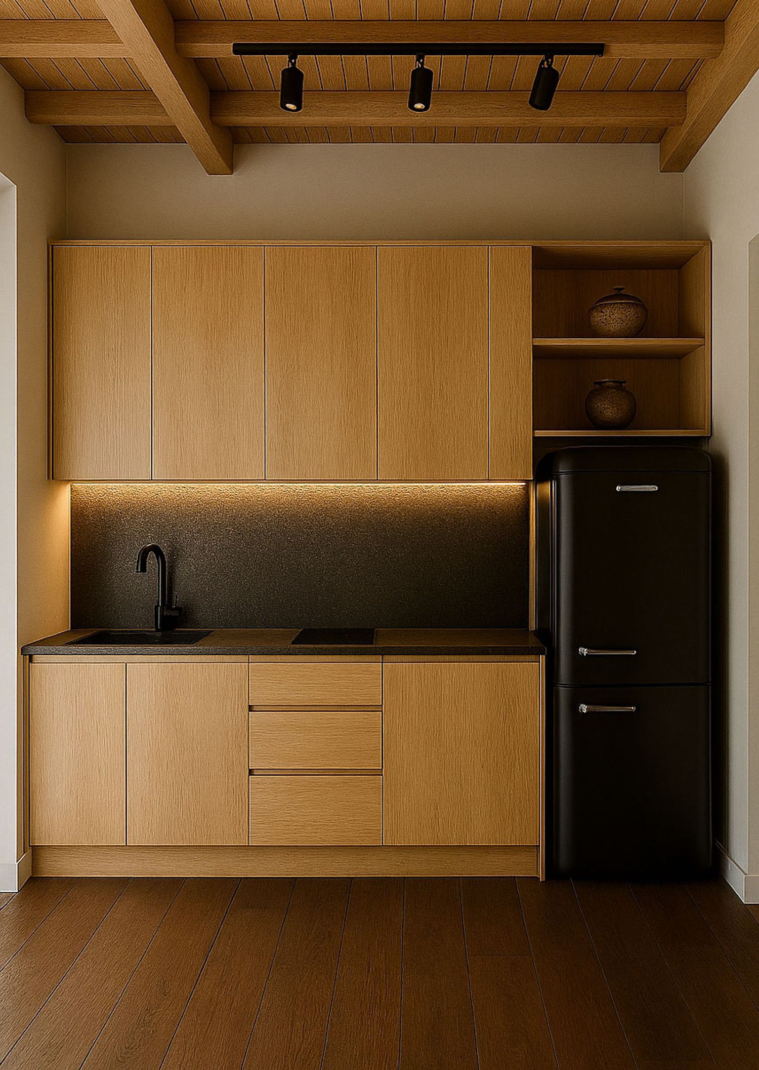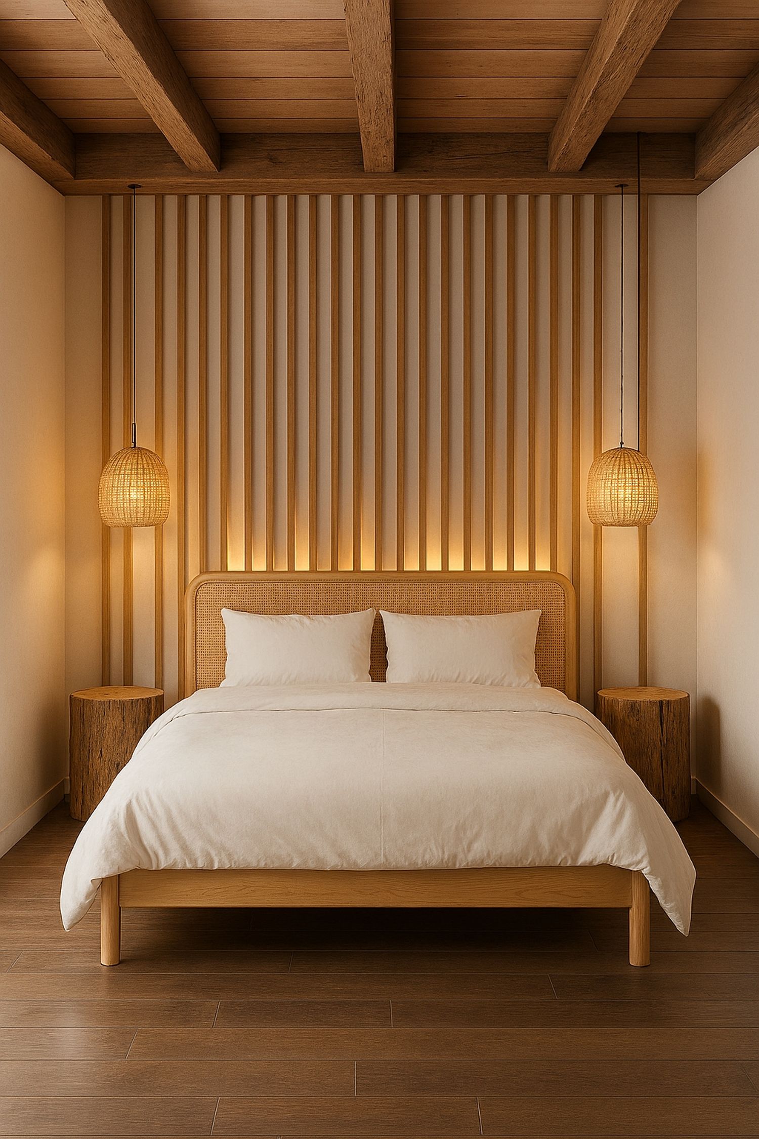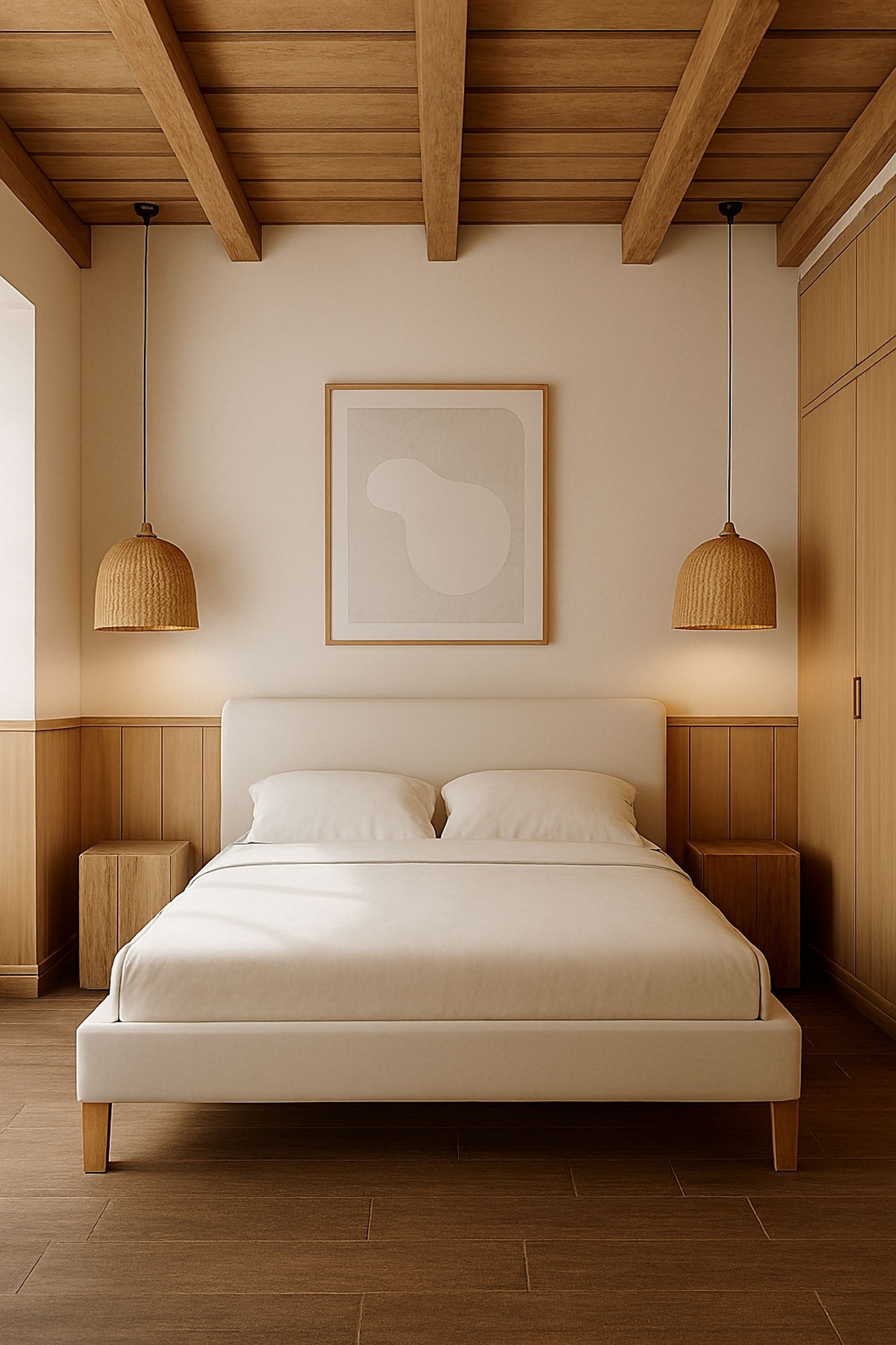 La camera da letto è in stile Japandi, con travi in legno e illuminazione integrata.