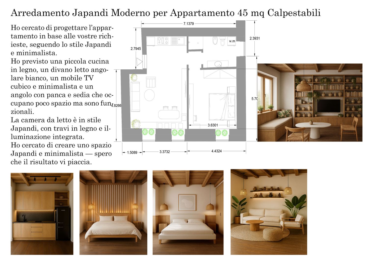 Ho cercato di progettare l’appartamento in base alle vostre richieste, seguendo lo stile Japandi e minimalista.