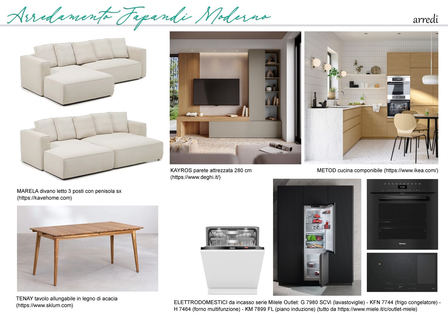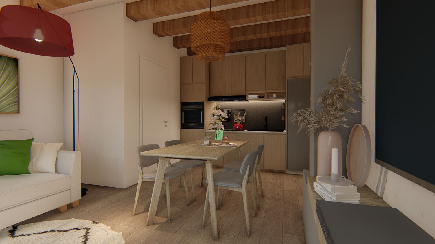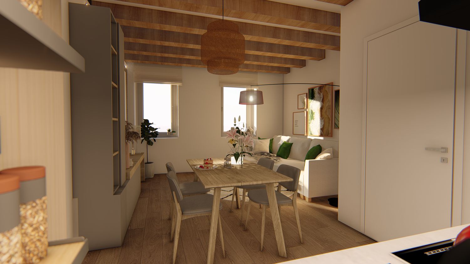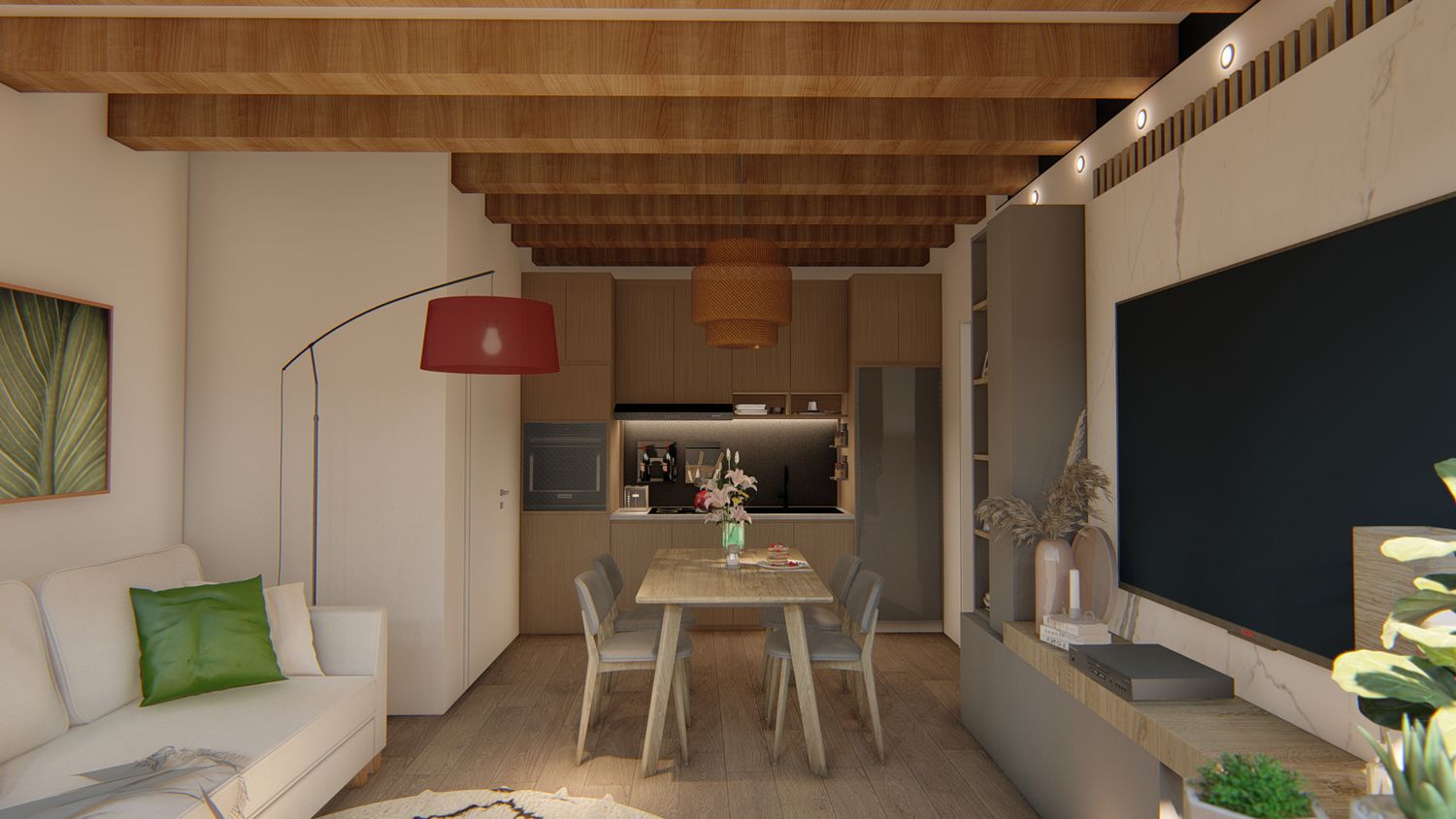 Proposta di arredo con due idee per la cucina: lineare con tavolo allungabile, o con piccola isola di servizio ed eventuale banco snack + tavolo estraibile. Colori neutri in accordo con lo stile japandi, aggiunta di qualche lampada a sospensione o da terra, in legno o tessuto.