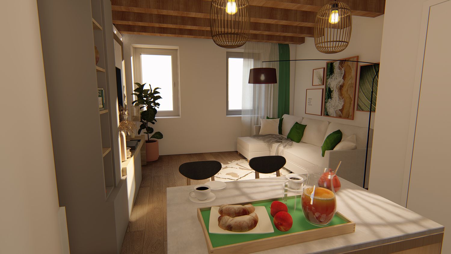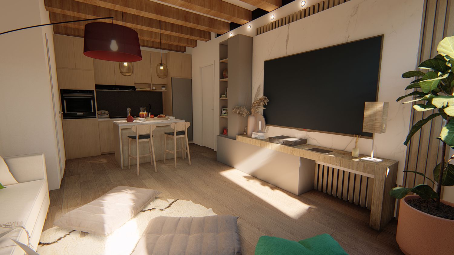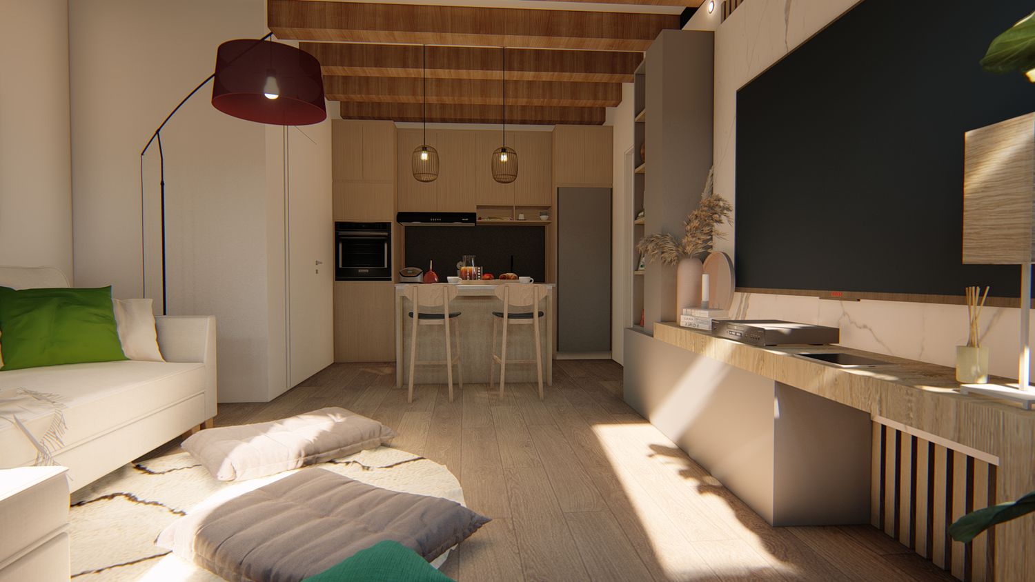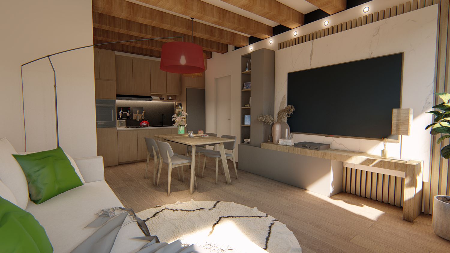 Proposta di arredo con due idee per la cucina: lineare con tavolo allungabile, o con piccola isola di servizio ed eventuale banco snack + tavolo estraibile. Colori neutri in accordo con lo stile japandi, aggiunta di qualche lampada a sospensione o da terra, in legno o tessuto.
