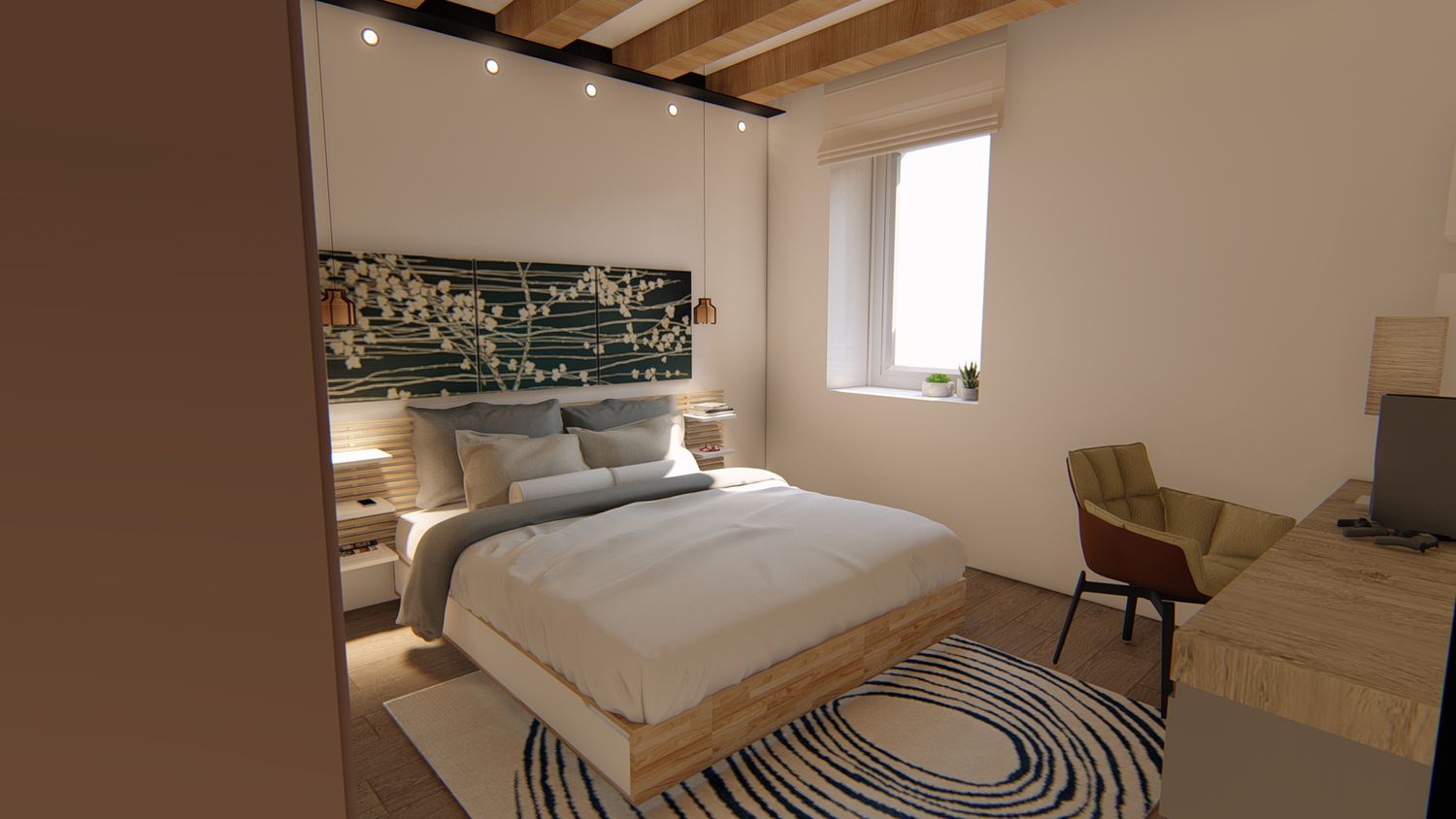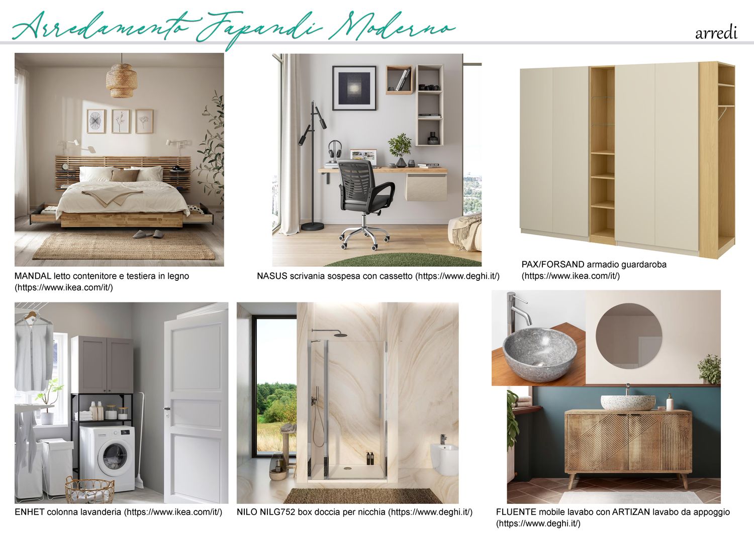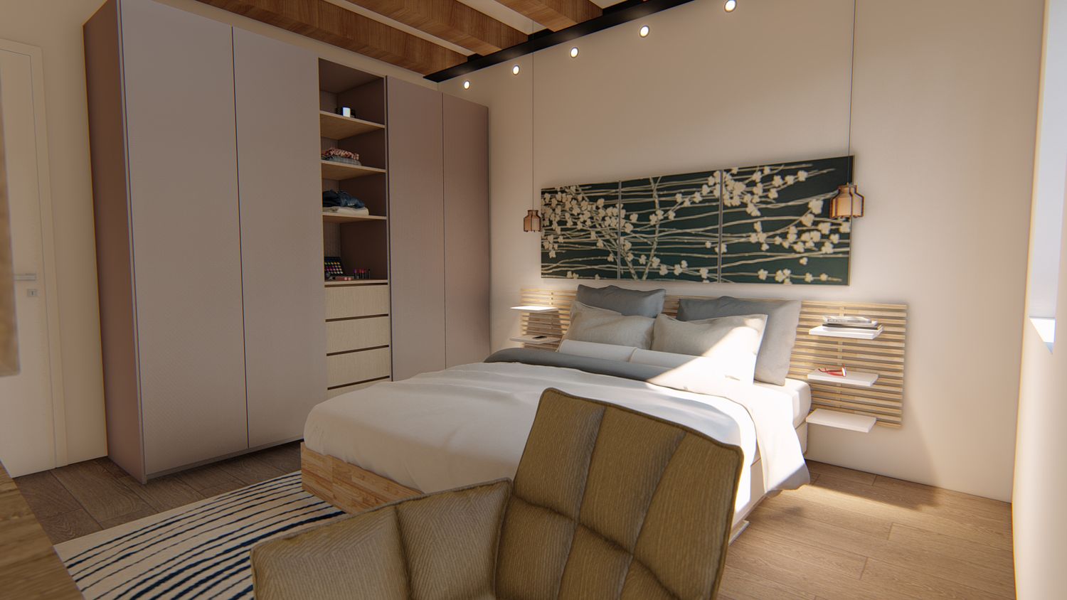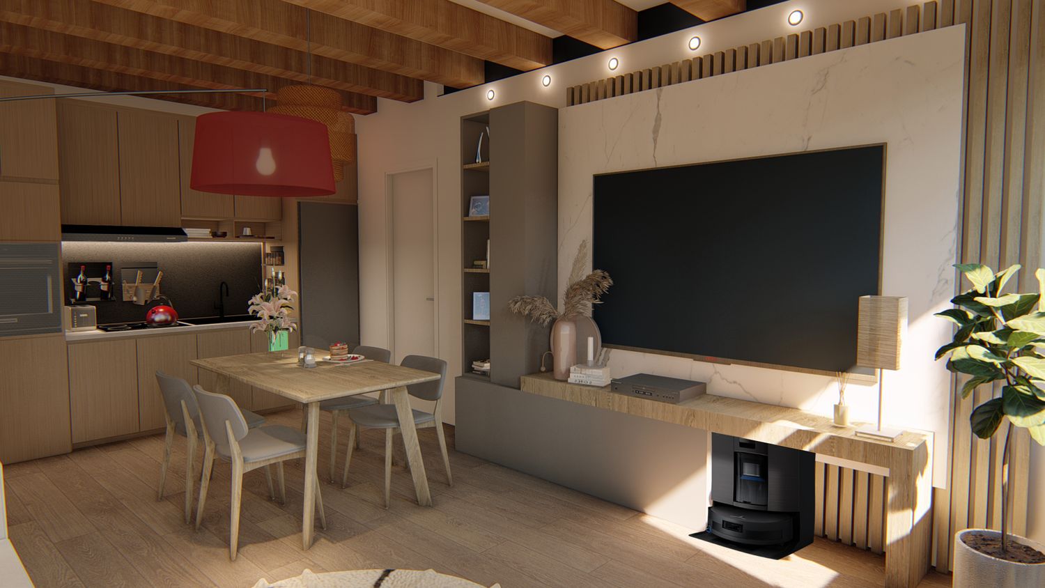 Proposta di arredo con due idee per la cucina: lineare con tavolo allungabile, o con piccola isola di servizio ed eventuale banco snack + tavolo estraibile. Colori neutri in accordo con lo stile japandi, aggiunta di qualche lampada a sospensione o da terra, in legno o tessuto.
