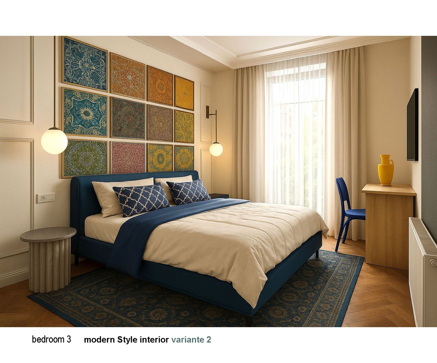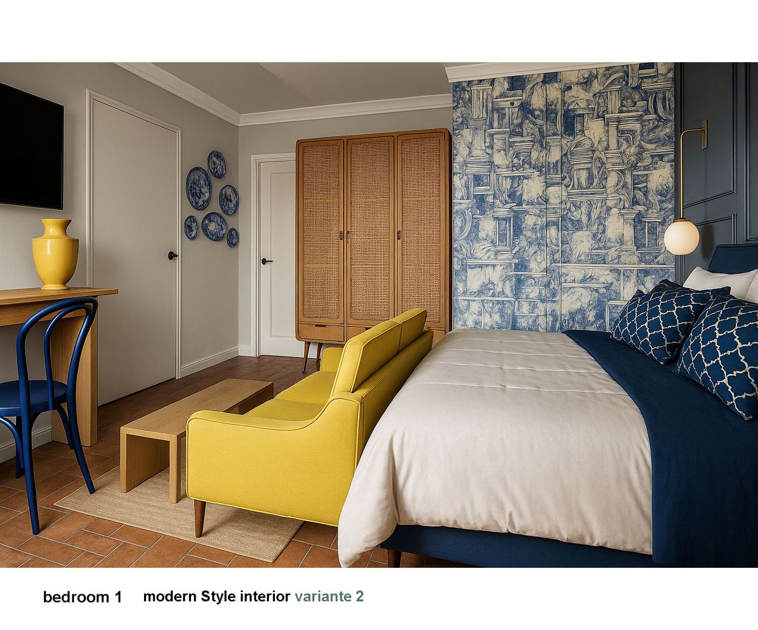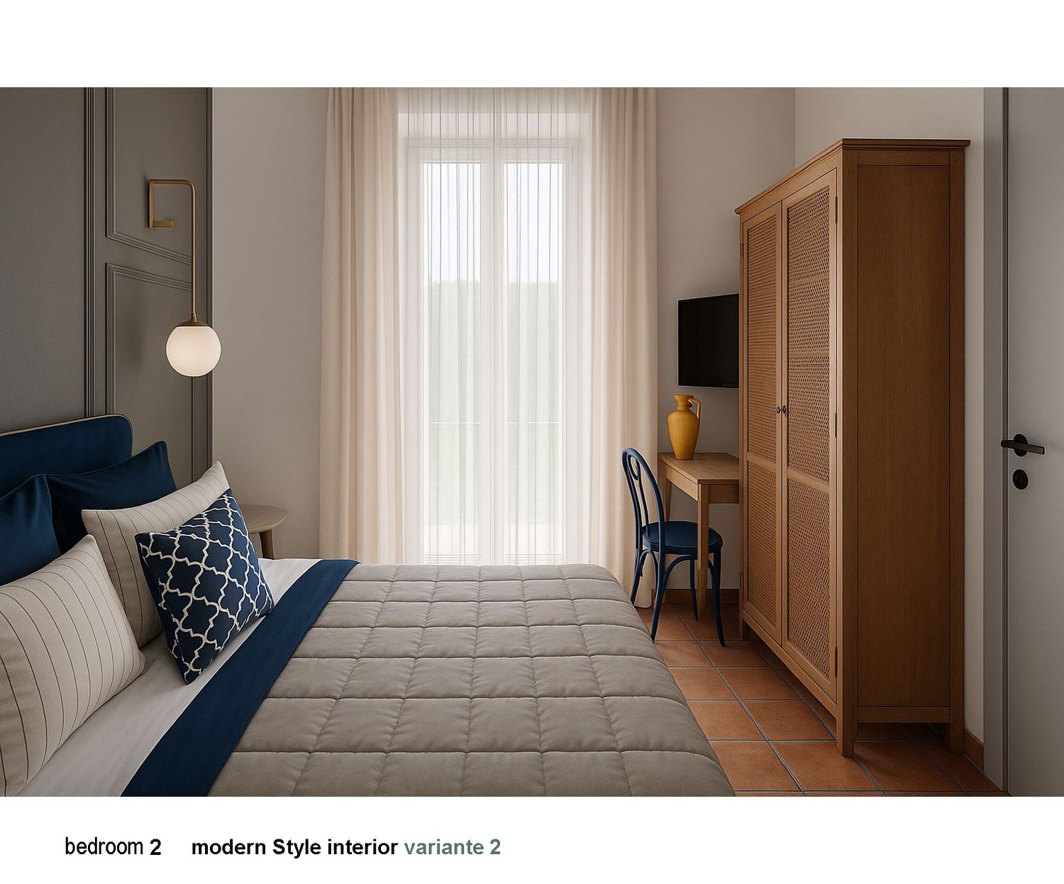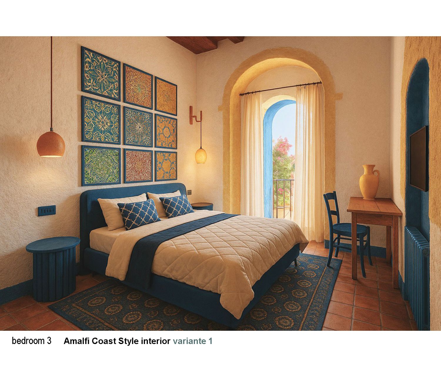 Nella progettazione di questo spazio per motivi alberghieri, la parola chiave è stata Amalfi. Per questo motivo, inizialmente è stata scelta la Variante 1 della stanza 3, una stanza che sembrasse al 100% Amalfi. Tuttavia, viviamo nel 2025 e le varianti successive degli interni sono minimaliste, moderne e contemporanee, MA ovviamente con tocchi dell'architettura di Amalfi, come potrebbe essere il rivestimento del pavimento in ceramica marrone, il rivestimento delle pareti con carta da parati dominata dal blu e abbinata ai letti blu, e la scelta di armadi in rattan non troppo grandi per non occupare troppo spazio. Nel frattempo, aggiungono bellezza all'ambiente anche le piastrelle in ceramica con motivi floreali sulle testiere dei letti. Ho proposto il collegamento tra la stanza 4 e la stanza 3 con una porta in modo da creare uno spazio familiare, che utilizzerà il bagno 3, e in questo modo non c'è bisogno di creare un nuovo bagno.