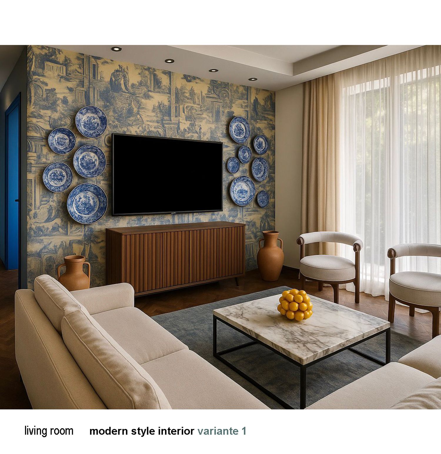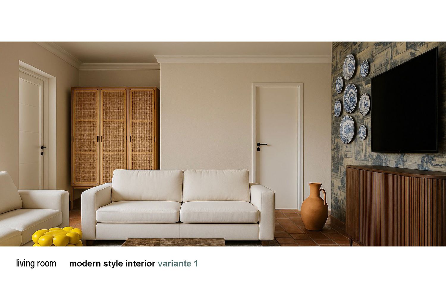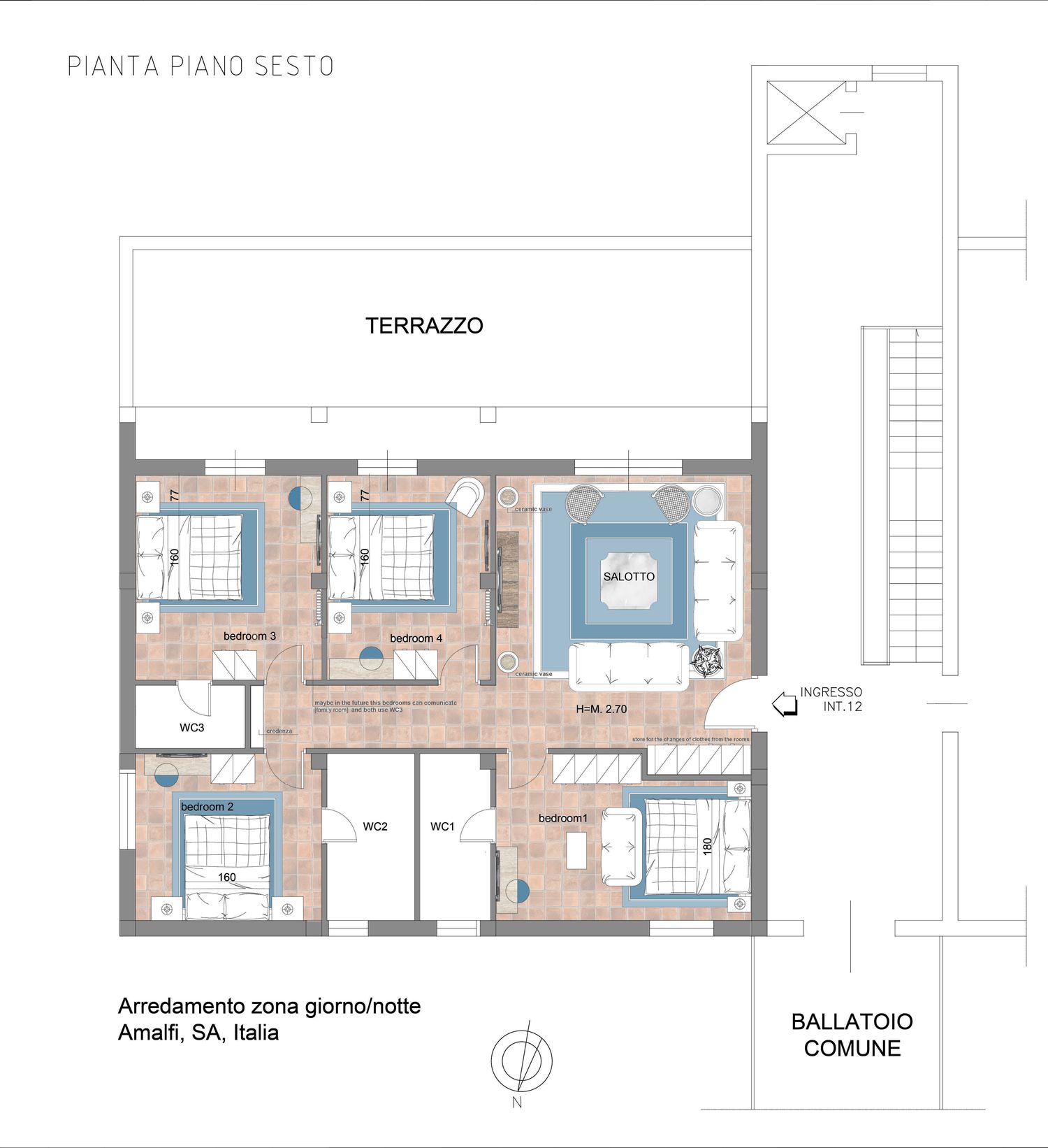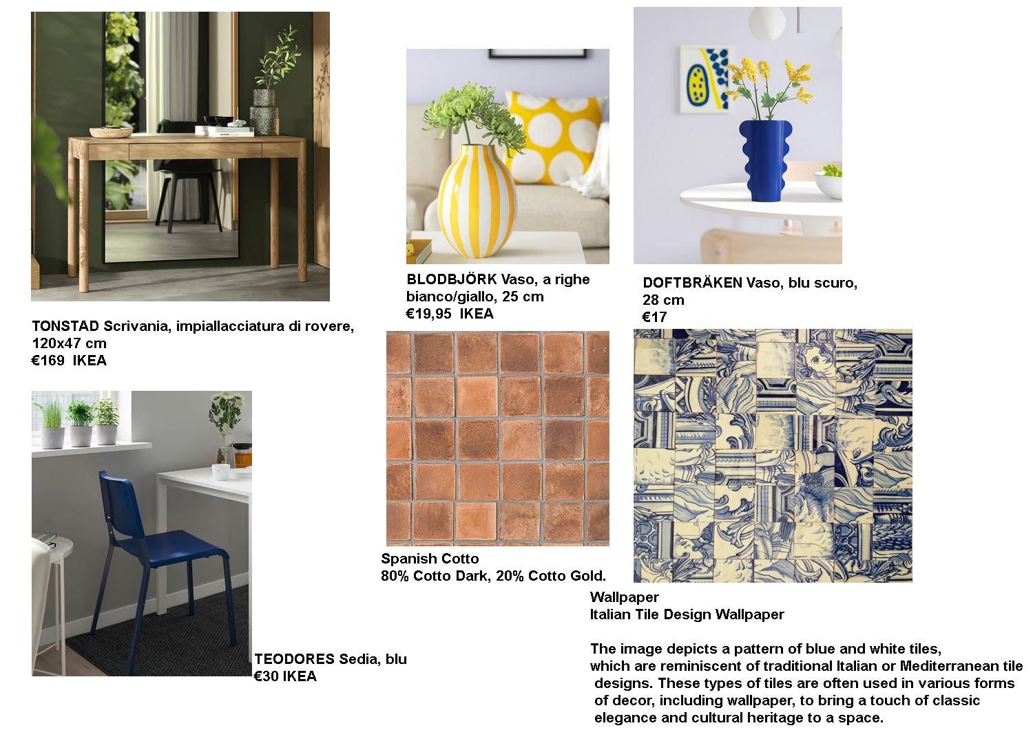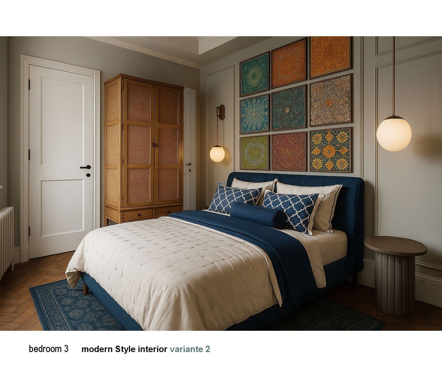 Nella progettazione di questo spazio per motivi alberghieri, la parola chiave è stata Amalfi. Per questo motivo, inizialmente è stata scelta la Variante 1 della stanza 3, una stanza che sembrasse al 100% Amalfi. Tuttavia, viviamo nel 2025 e le varianti successive degli interni sono minimaliste, moderne e contemporanee, MA ovviamente con tocchi dell'architettura di Amalfi, come potrebbe essere il rivestimento del pavimento in ceramica marrone, il rivestimento delle pareti con carta da parati dominata dal blu e abbinata ai letti blu, e la scelta di armadi in rattan non troppo grandi per non occupare troppo spazio. Nel frattempo, aggiungono bellezza all'ambiente anche le piastrelle in ceramica con motivi floreali sulle testiere dei letti. Ho proposto il collegamento tra la stanza 4 e la stanza 3 con una porta in modo da creare uno spazio familiare, che utilizzerà il bagno 3, e in questo modo non c'è bisogno di creare un nuovo bagno.