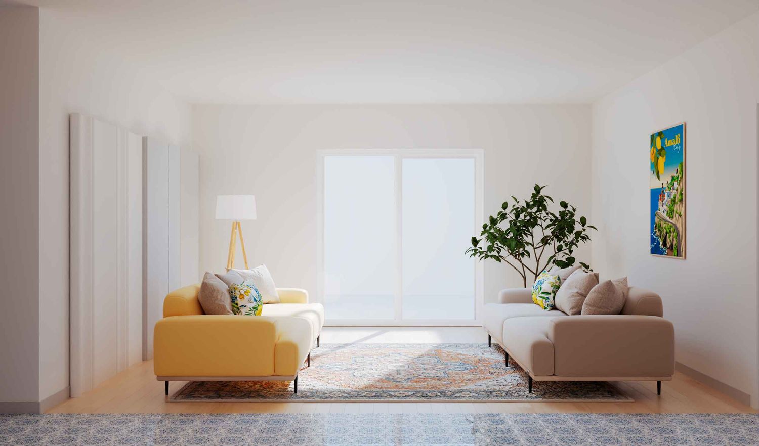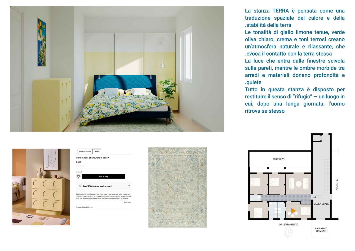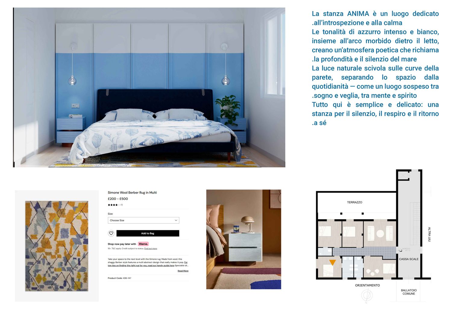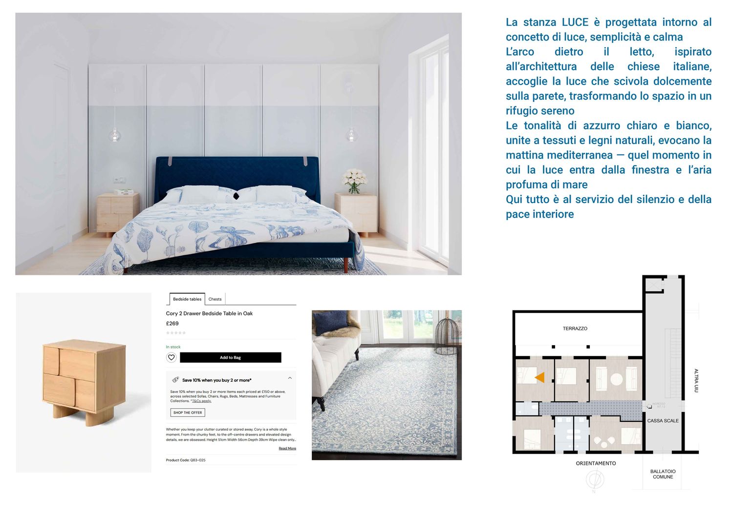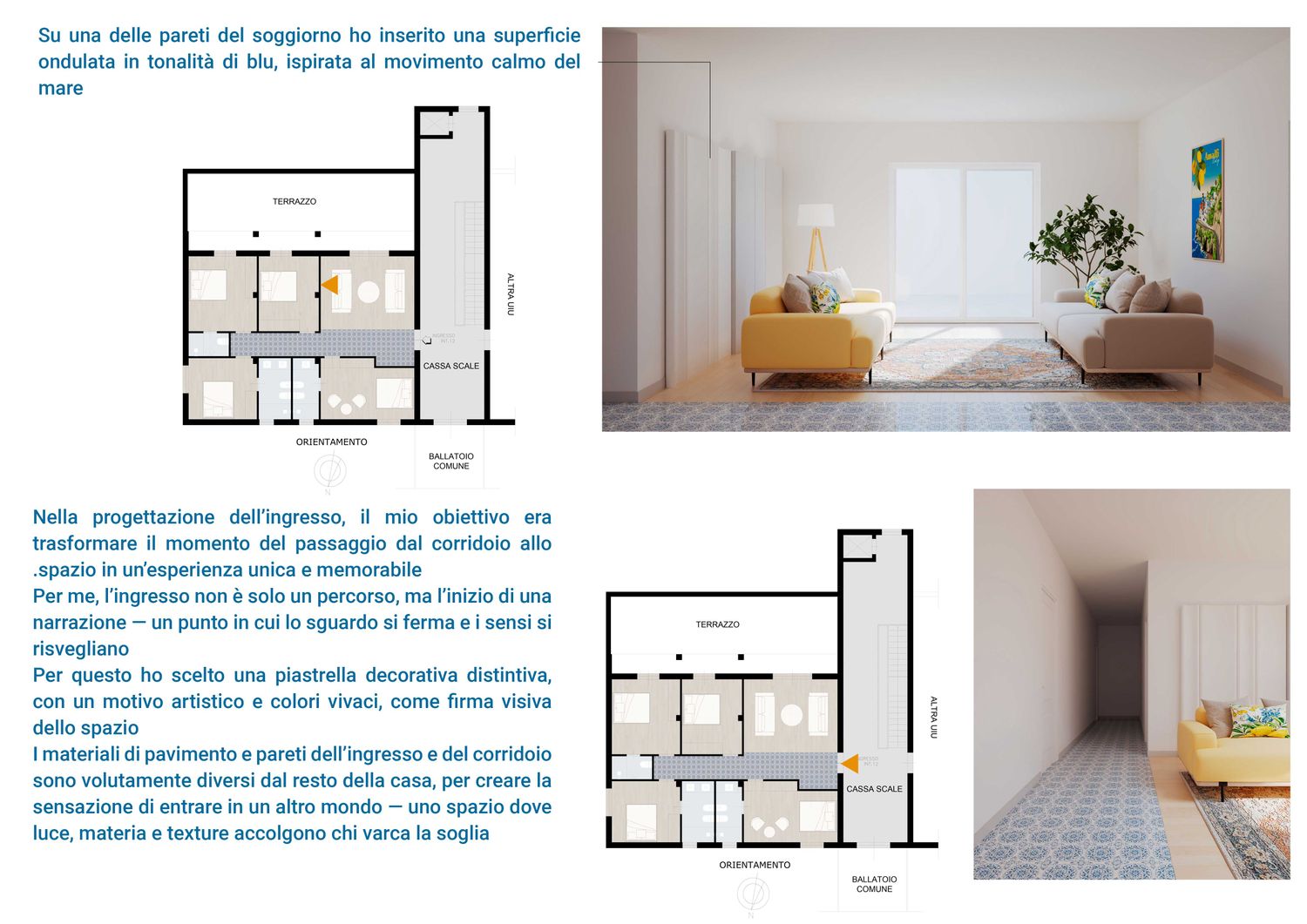 Nelle camere, i colori sono semplici ma vivi: l’azzurro dei letti come il mare, il verde oliva come le foglie bagnate degli ulivi, e il giallo limone come la luce del pomeriggio sul mare. Nel soggiorno, il lino naturale e il legno chiaro creano un ambiente accogliente e nobile, mentre all’ingresso, la piastrella decorativa diventa la firma del progetto, un saluto ispirato alla grazia dell’Italia e alla dolcezza del Mediterraneo.