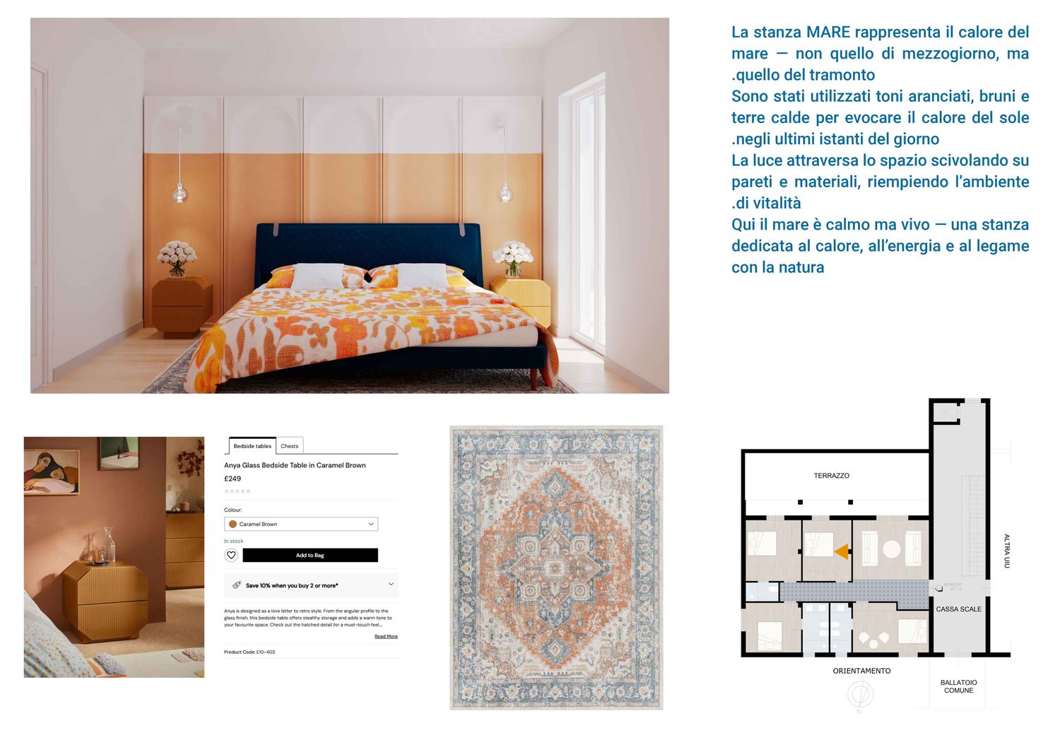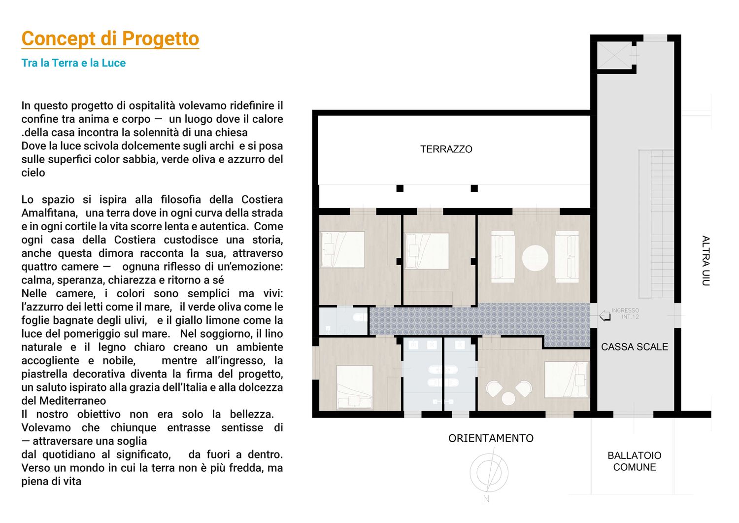 Lo spazio si ispira alla filosofia della Costiera Amalfitana, una terra dove in ogni curva della strada e in ogni cortile la vita scorre lenta e autentica. Come ogni casa della Costiera custodisce una storia, anche questa dimora racconta la sua, attraverso quattro camere — ognuna riflesso di un’emozione: calma, speranza, chiarezza e ritorno a sé.