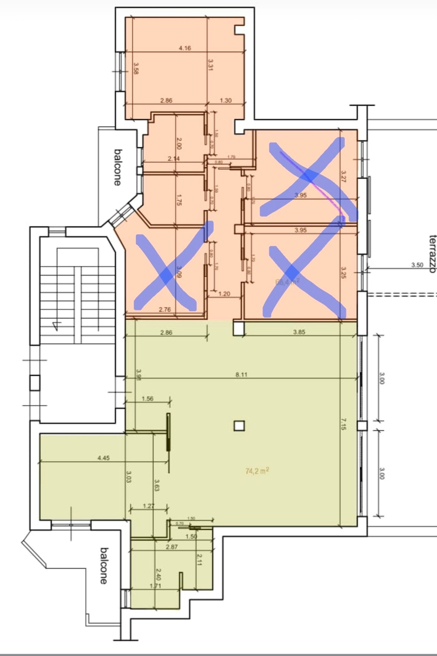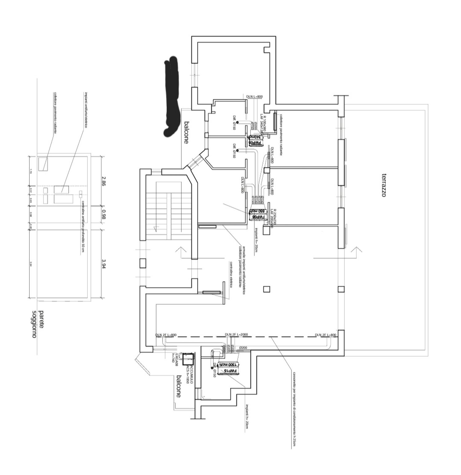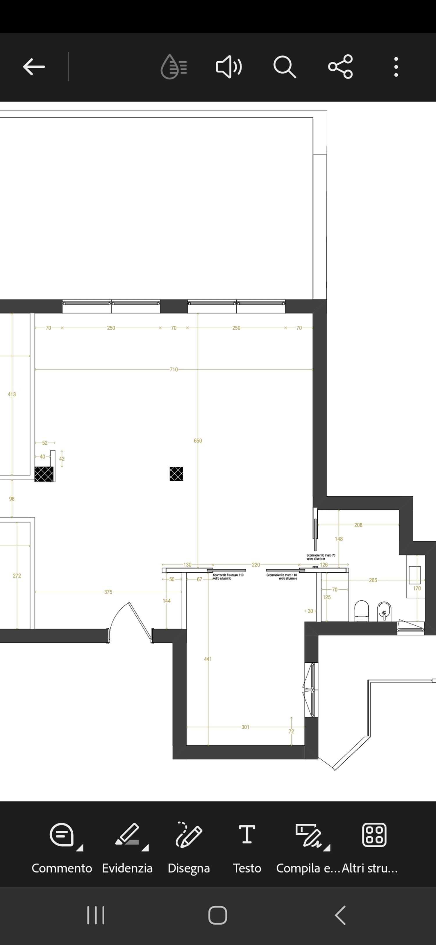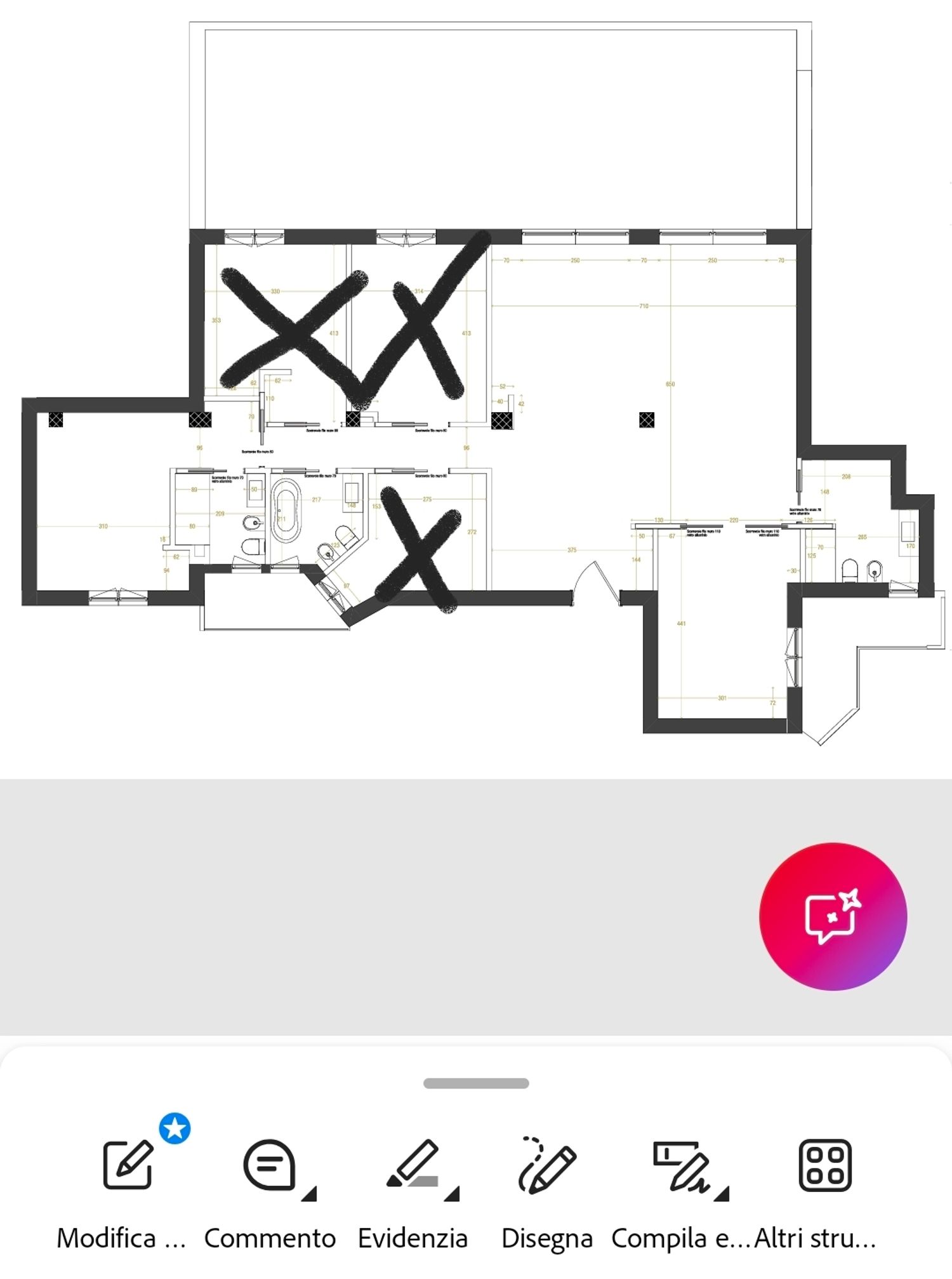 Amiamo i colori caldi con elementi naturali (legno, effetto pietra, marmo e travertino) con qualche tocco di colore e il cannettato. Nei bagni e in cucina vogliamo evitare il parquet. Stiamo valutando però l'idea di posarlo nei bagni della zona notte. Nel bagno della zona giorno sarà predisposto sul lato sinistro una piccola lavanderia, e in cucina piano e lavello verranno collocati sul lato destro. Abbiamo predisposto il riscaldamento radiante e scaldasalviette elettrici sui bidet. Le porte filo muro scorrevoli saranno alte 240 cm e ci sarà un impianto canalizzato nella zona giorno è collocato lungo la parete di destra salone-bagno-cucina e nella zona notte invece è collocato nel corrido con uno spessore di 40cm circa. Nel bagno con la vasca (semi-addossata alla parete da 160) il lavabo è sulla parete obliqua e i sanitati sulla sinistra.
