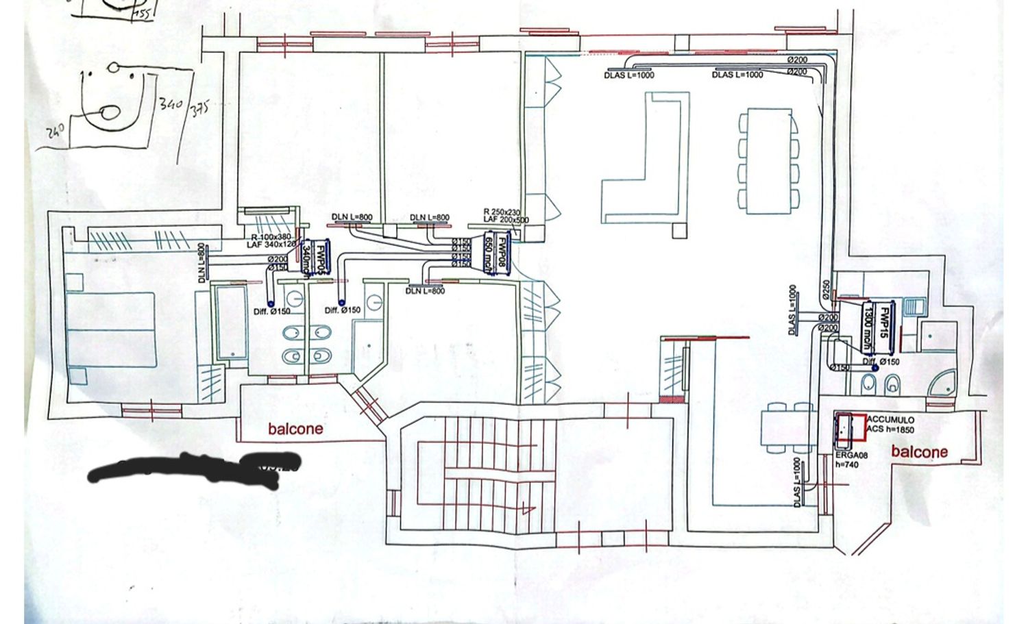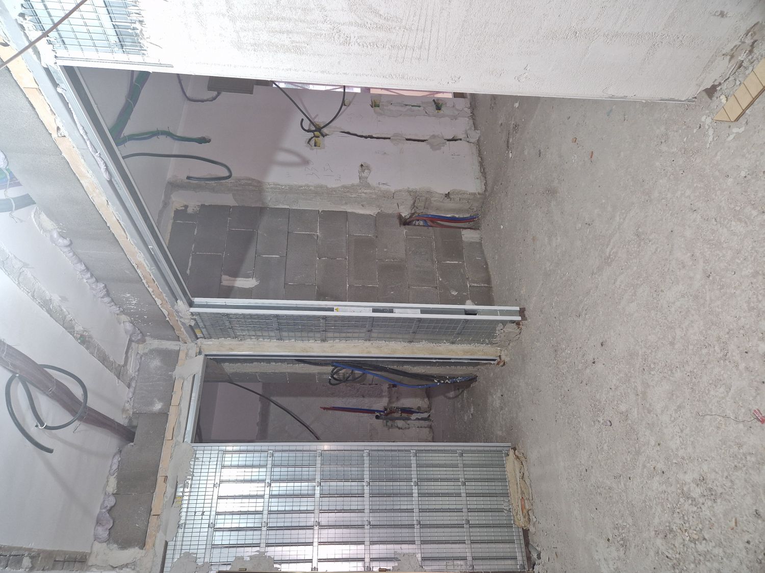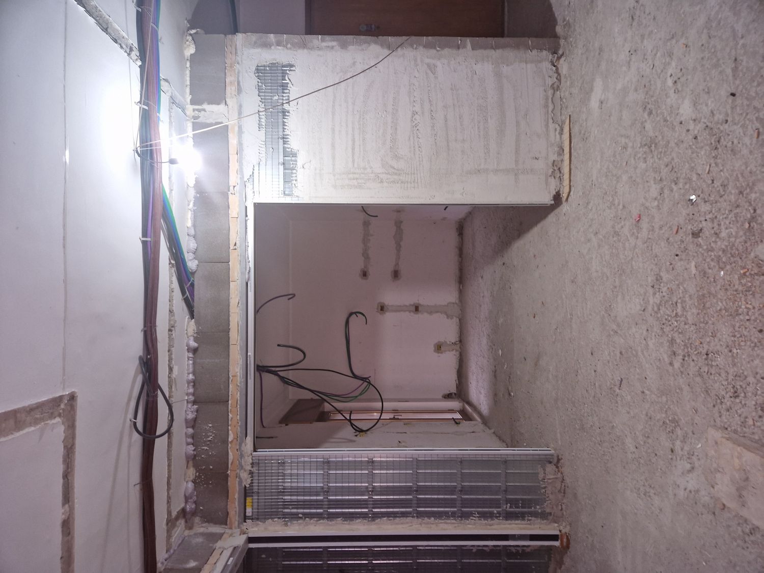 Hemos instalado calefacciĂłn radiante y toalleros elĂ©ctricos junto al bidĂ©. Las puertas correderas a ras de pared tendrán una altura de 240 cm y el sistema de climatizaciĂłn por conductos en la zona de dĂa estará situado a lo largo de la pared derecha (salĂłn–baño–cocina). En la zona de noche, el sistema de conductos está ubicado en el pasillo, con un espesor aproximado de 40 cm.