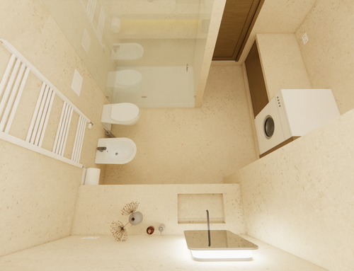 We love warm colours and natural materials (wood, stone effect, marble, and travertine), with some touches of colour and fluted/caned textures. In the bathrooms and the kitchen, we want to avoid using parquet. However, we are considering the option of using it in the night-area bathrooms. In the guest bathroom, a small laundry area will be placed on the left side, while in the kitchen the worktop and sink will be located on the right side.