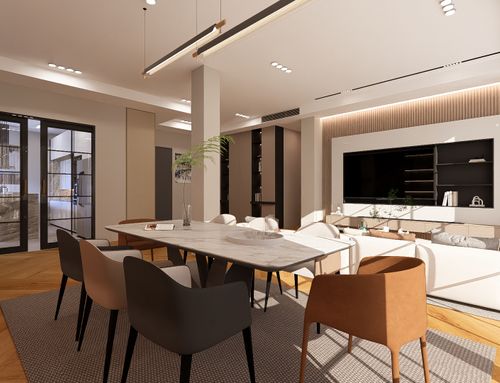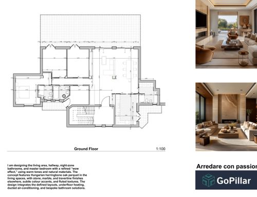 We are looking for ideas to furnish our living area. We are currently working with an architect, but unfortunately their aesthetic taste has not impressed us, and they haven’t fully understood our style and preferences. We have decided to install a Hungarian herringbone oak parquet floor. We are asking for furnishing proposals and a “wow effect” design for the living area, the hallway, and the bathrooms in the night zone, including the master bedroom.