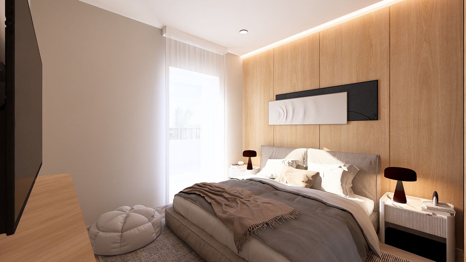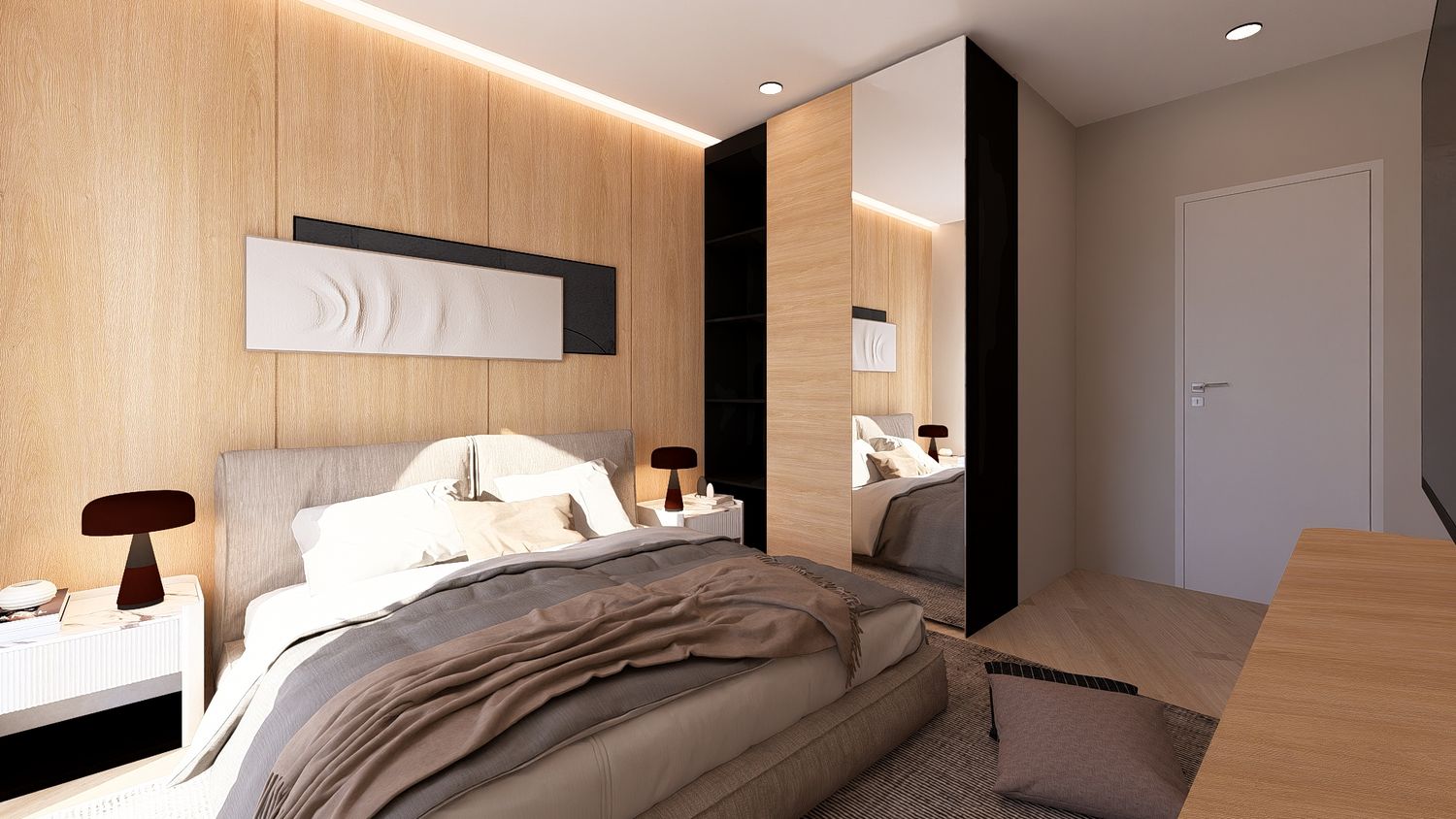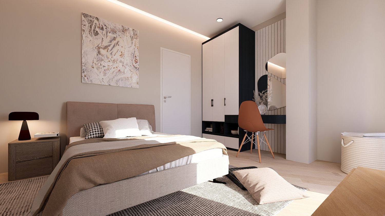 Camera da letto: ha un design minimalista lussuoso e impressionante, con particolare attenzione alla funzionalità.
