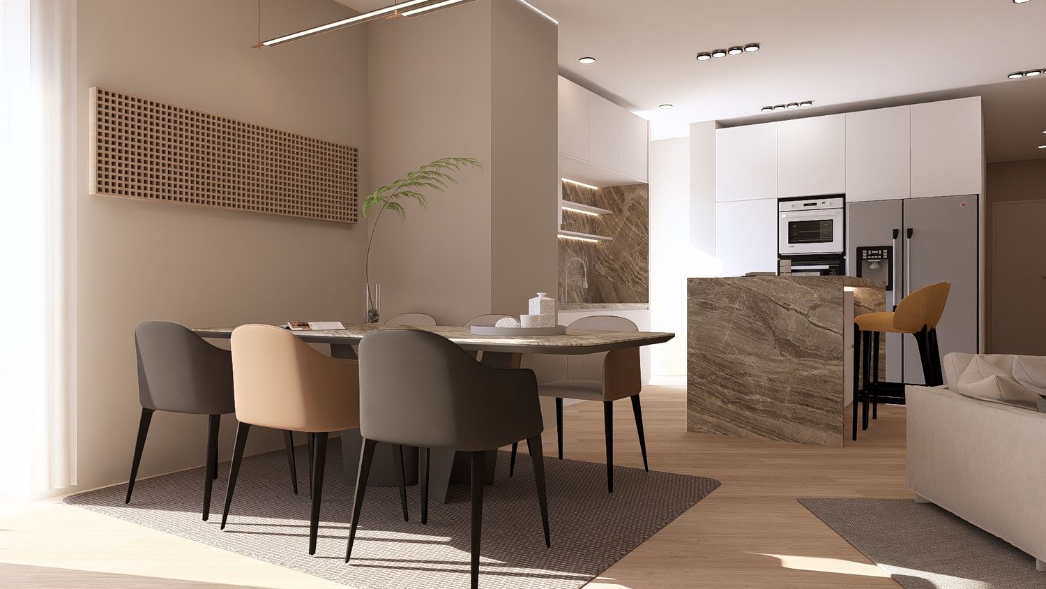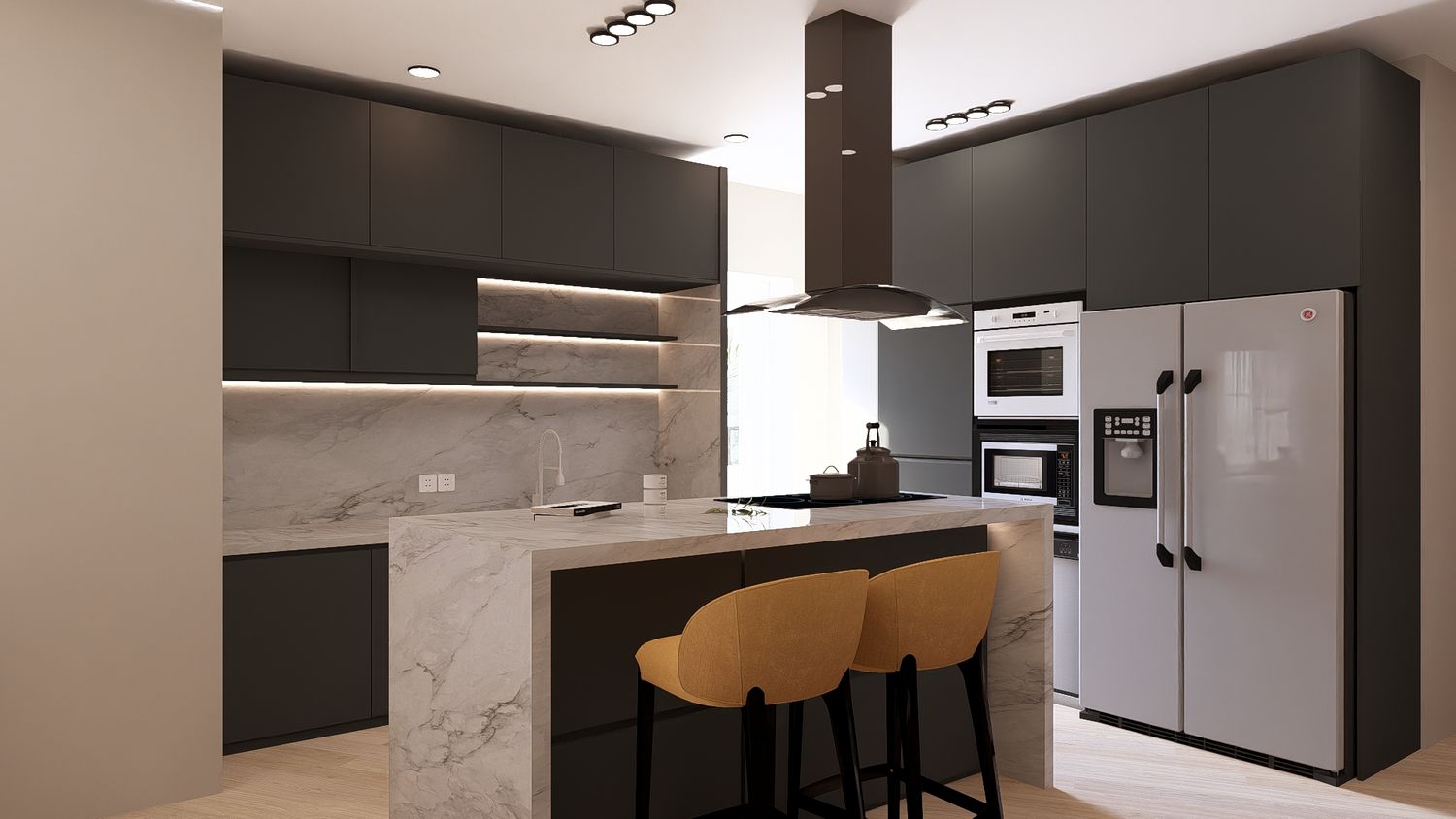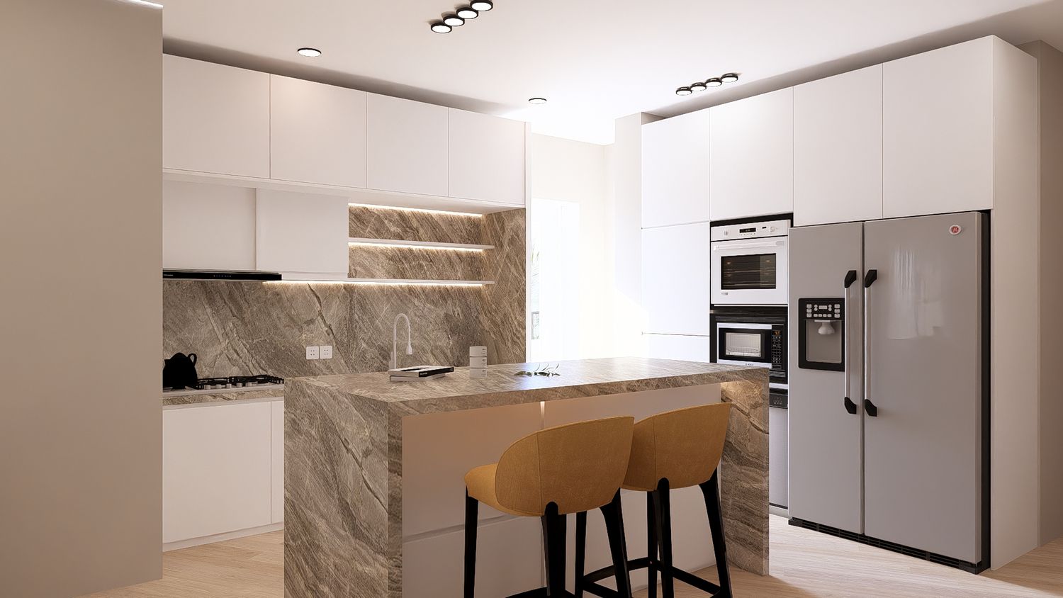 Cucina elegante e funzionale: sviluppata entro i punti tecnici esistenti, con penisola in pietra naturale e illuminazione LED integrata.