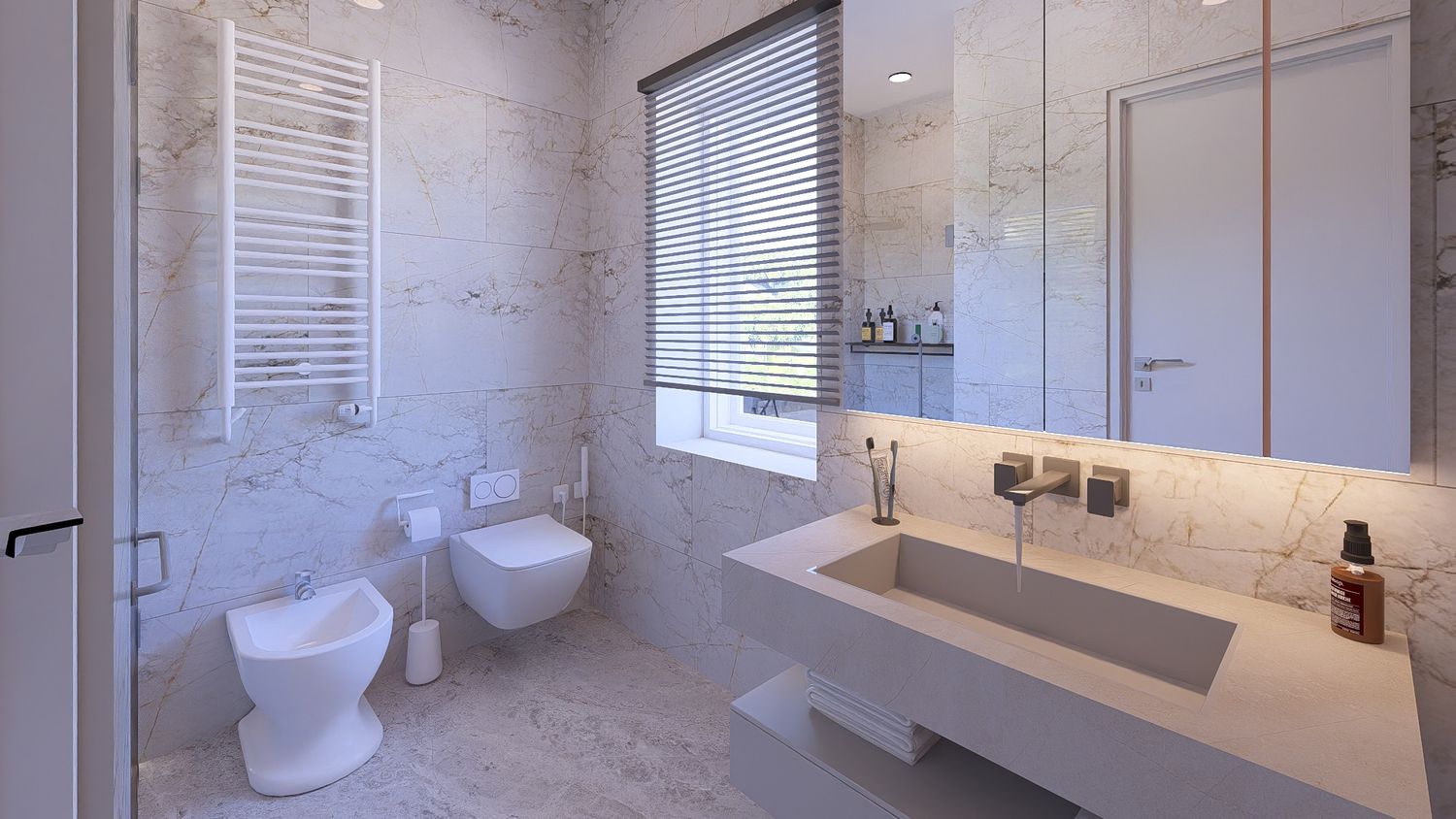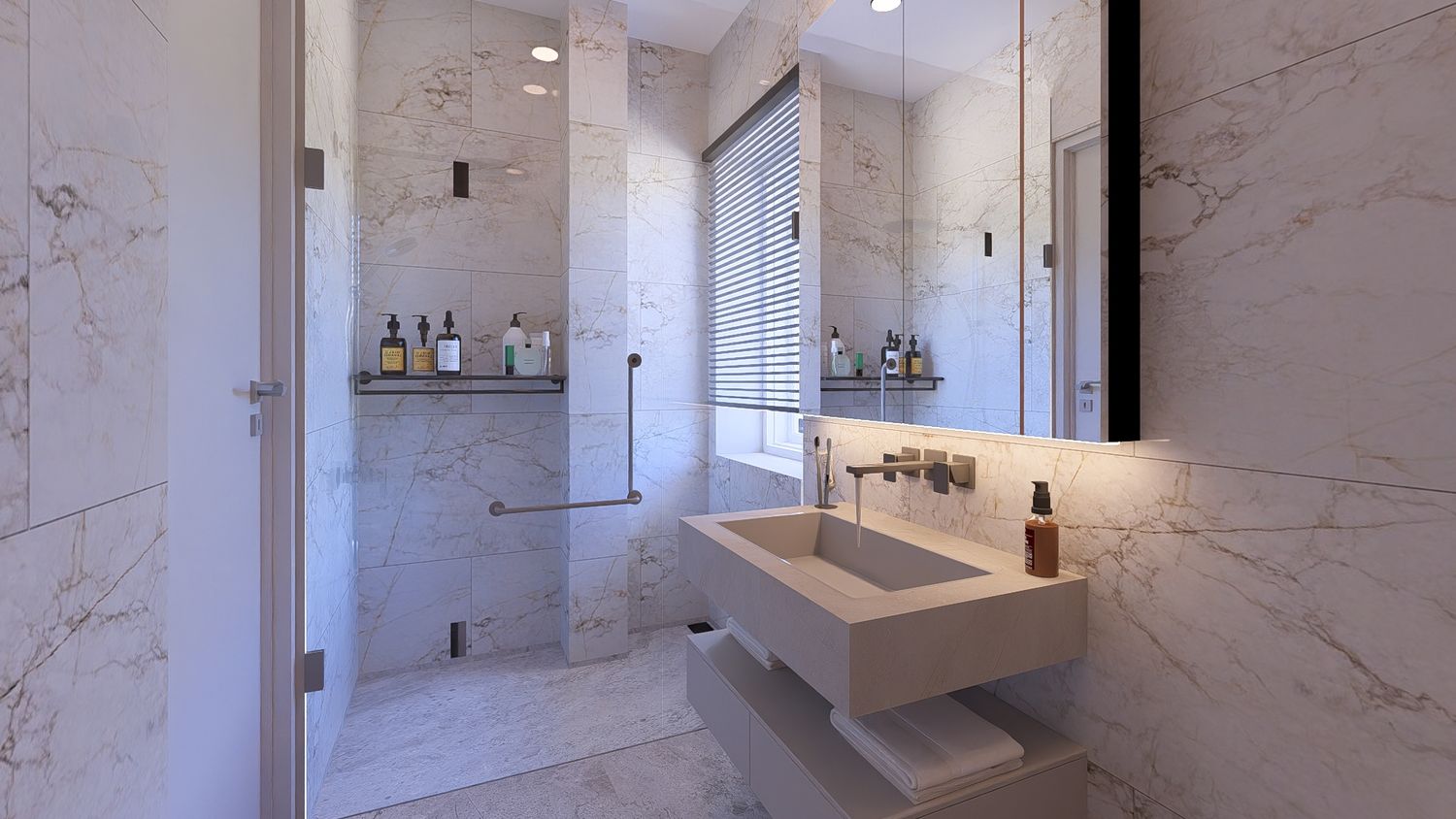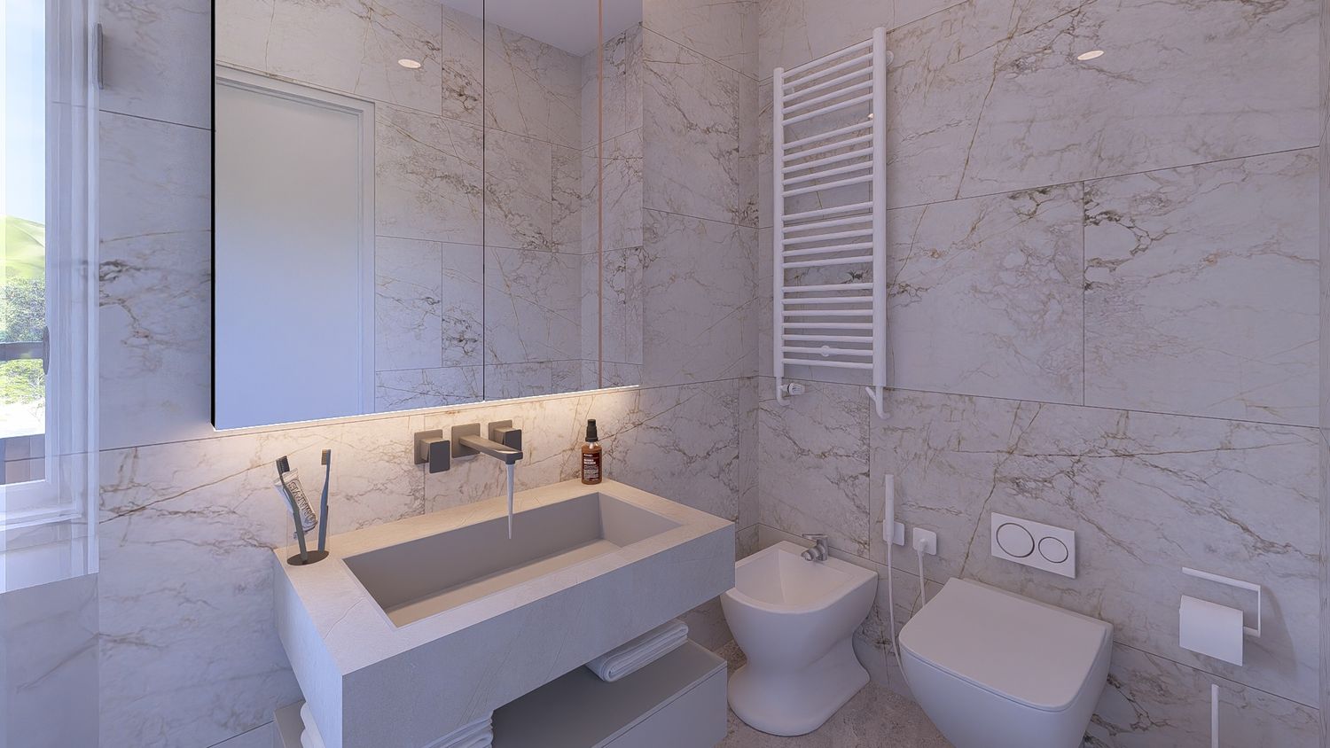 Zona notte e bagni: mantenuti nella configurazione originale, con finiture in marmo chiaro e luce soffusa per eleganza e comfort.