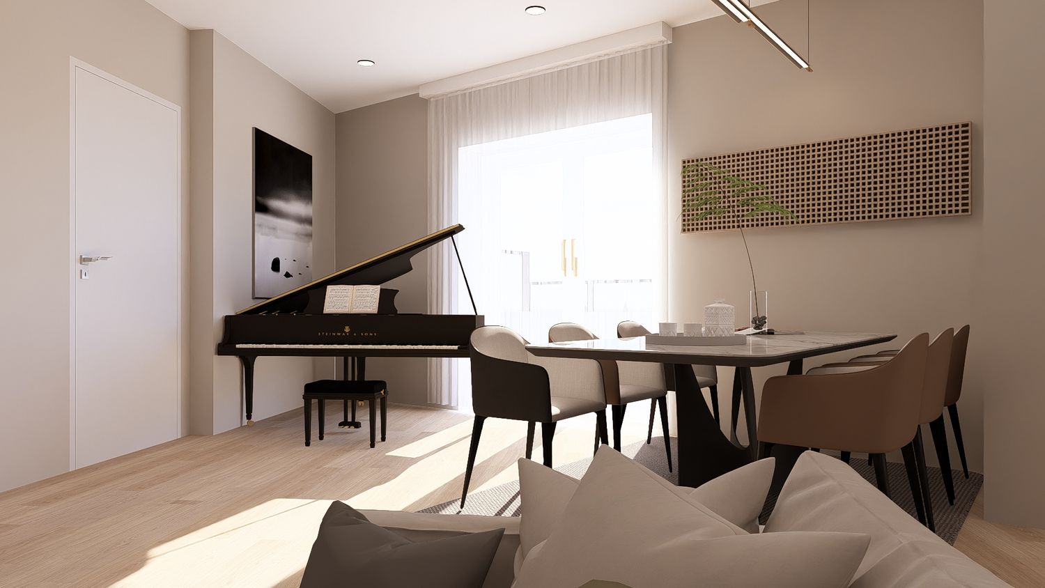Area musica: il pianoforte diventa elemento centrale e scenografico, in perfetta sintonia con la zona pranzo.