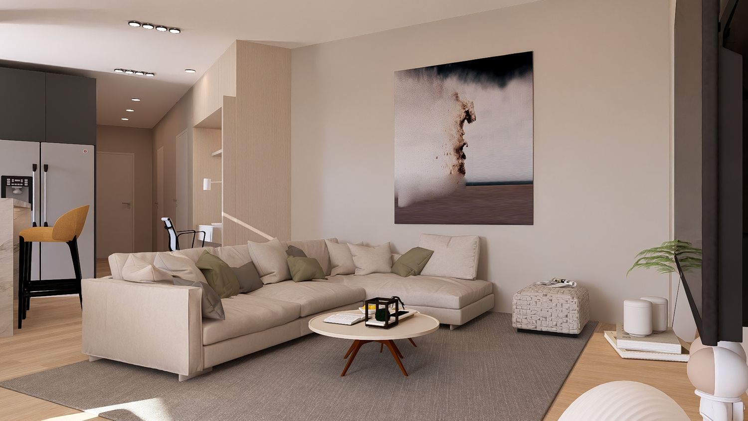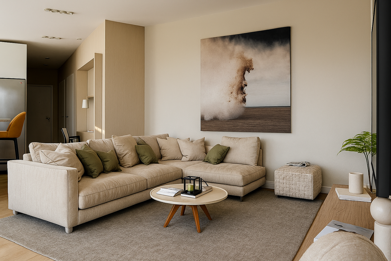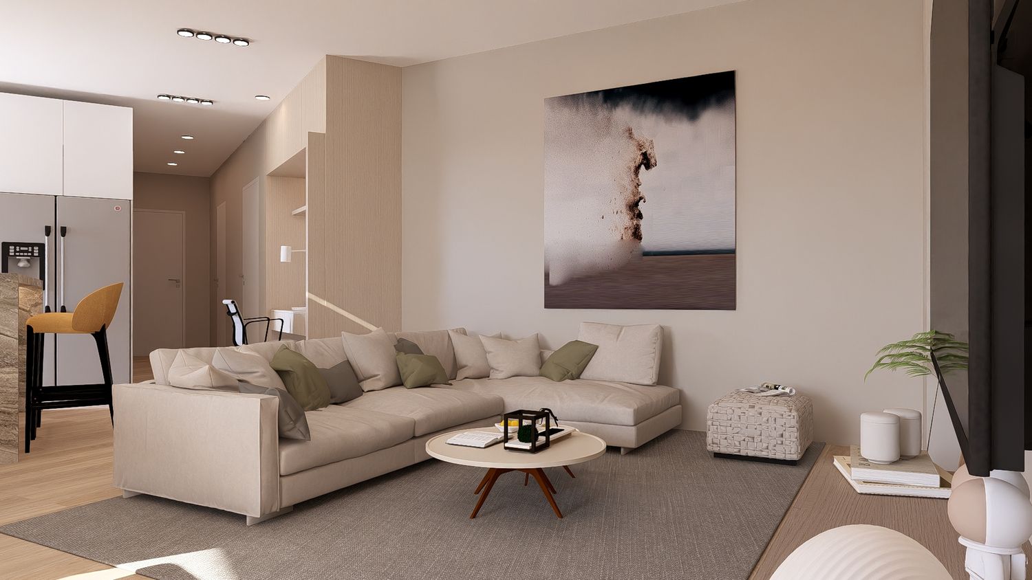 Armonia interno–esterno: continuità visiva tra soggiorno e terrazza grazie a materiali e colori coerenti.