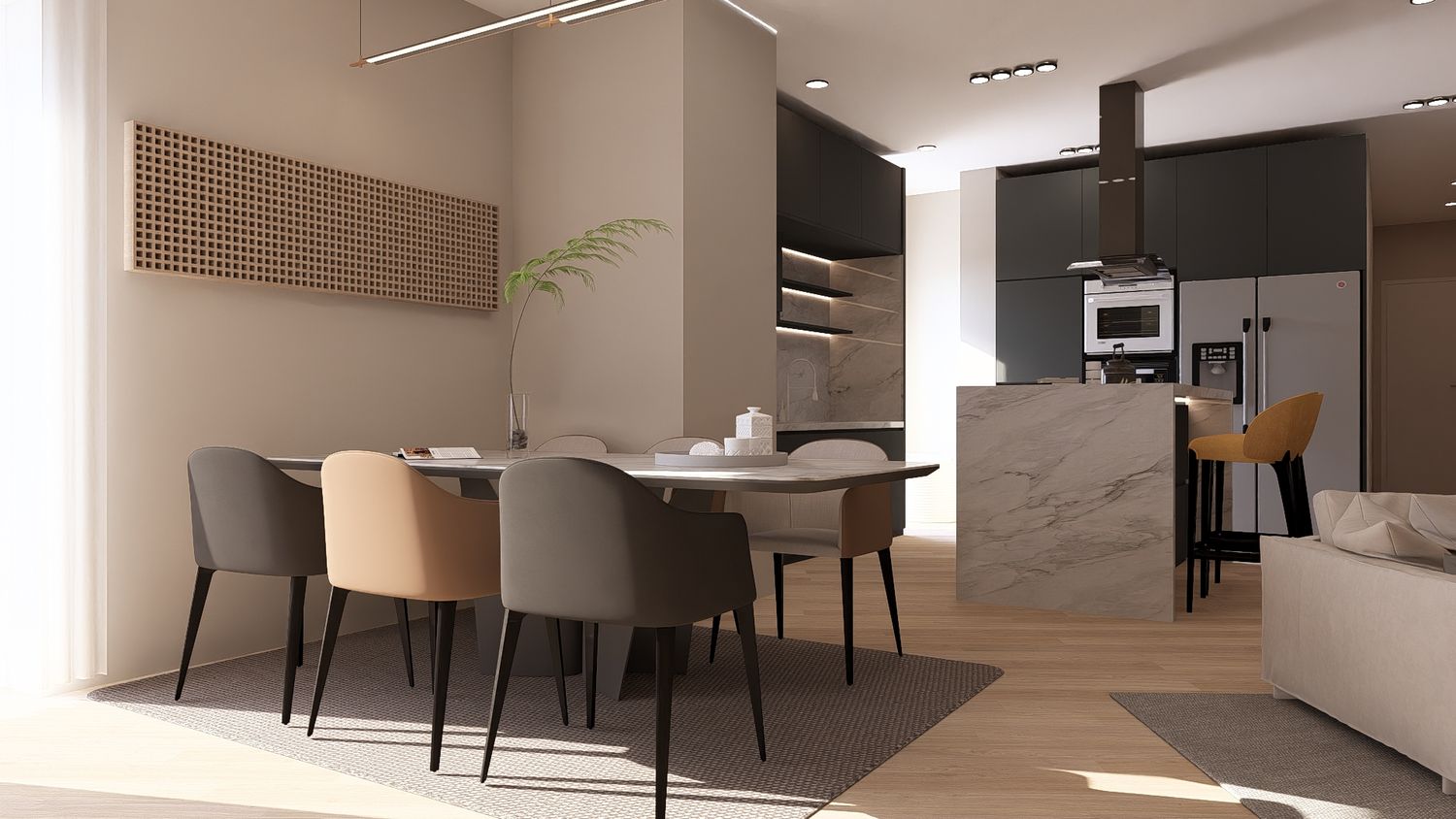 Zona giorno open-space: cucina, pranzo e living integrati in un ambiente fluido e accogliente, ideali per relax e convivialità.