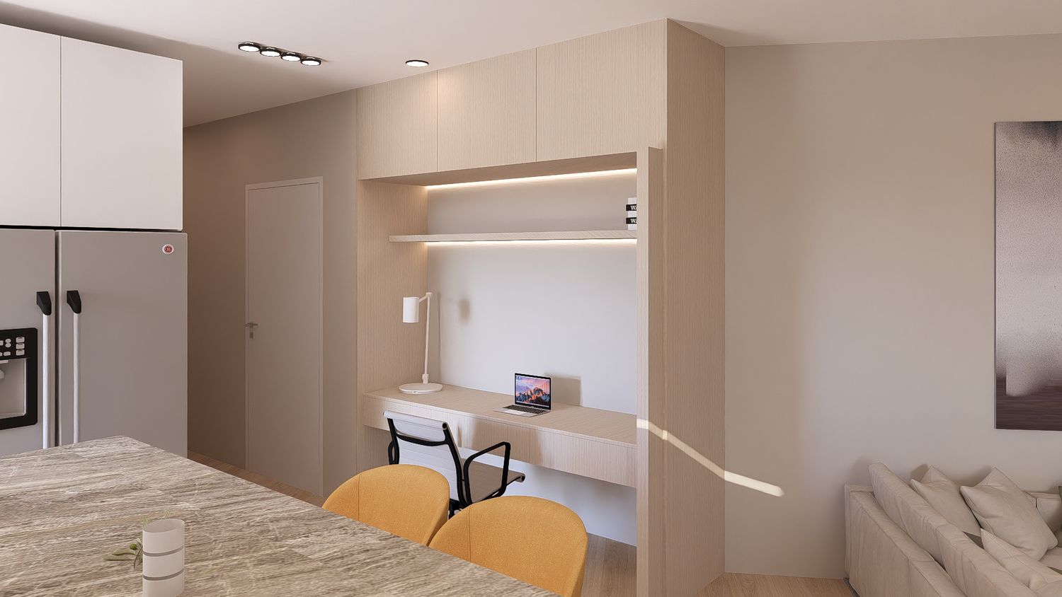 Workstation compatta: angolo lavoro discreto e integrato, nascosto quando non utilizzato.