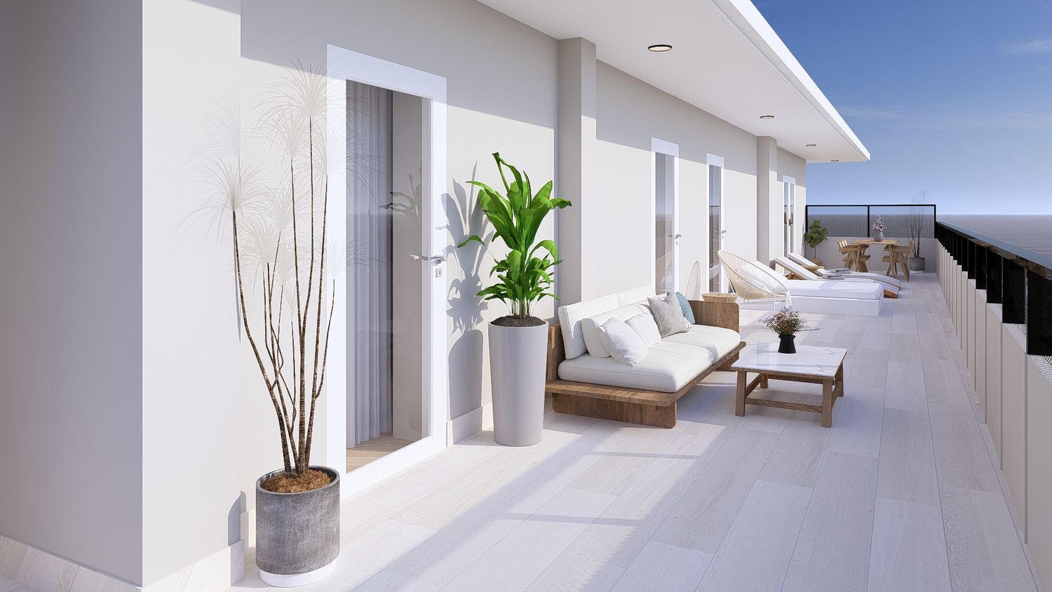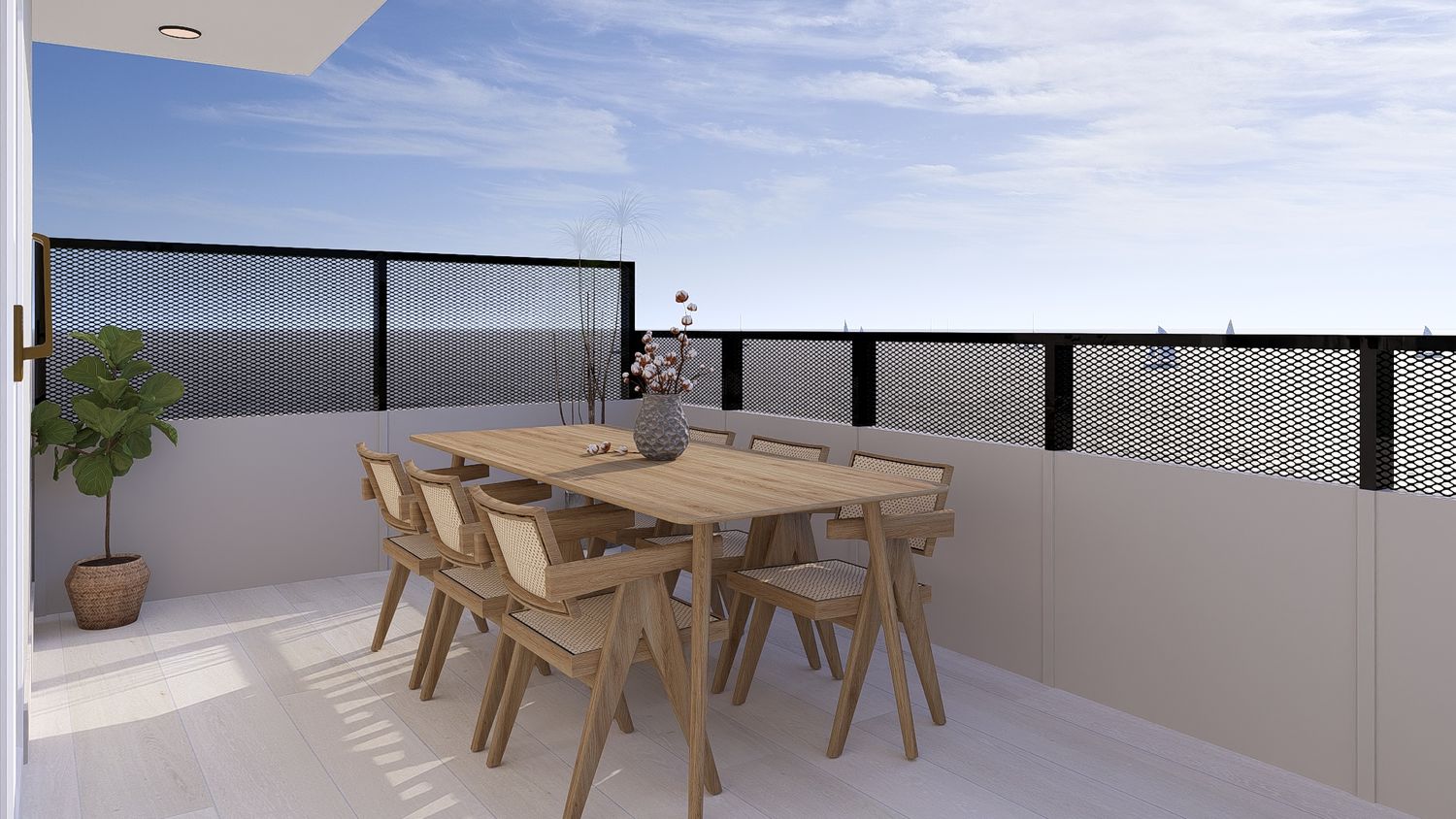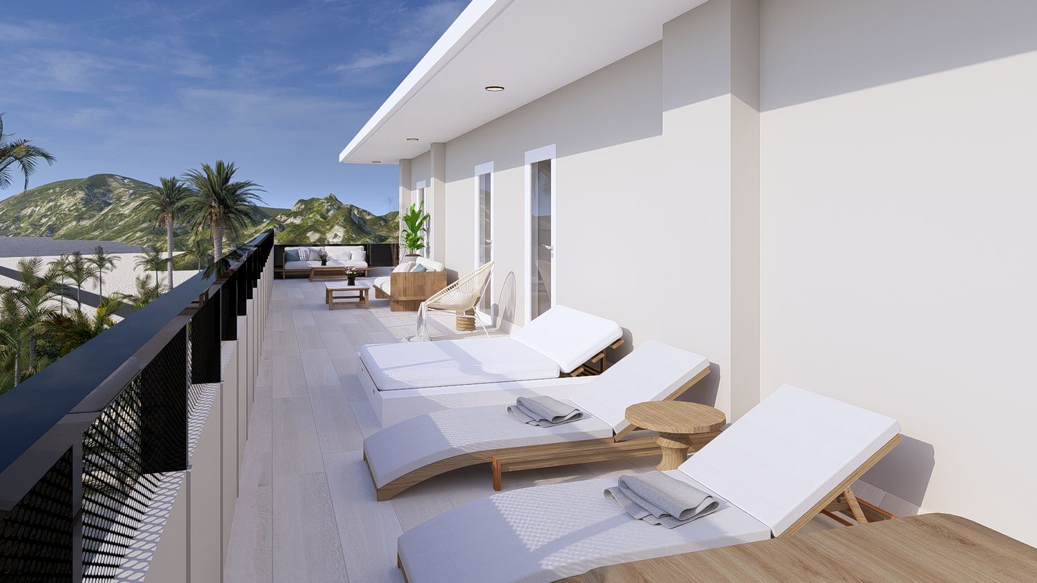 Terrazza panoramica: arredi minimal in legno e tessuti chiari per continuità estetica e uso tutto l’anno.