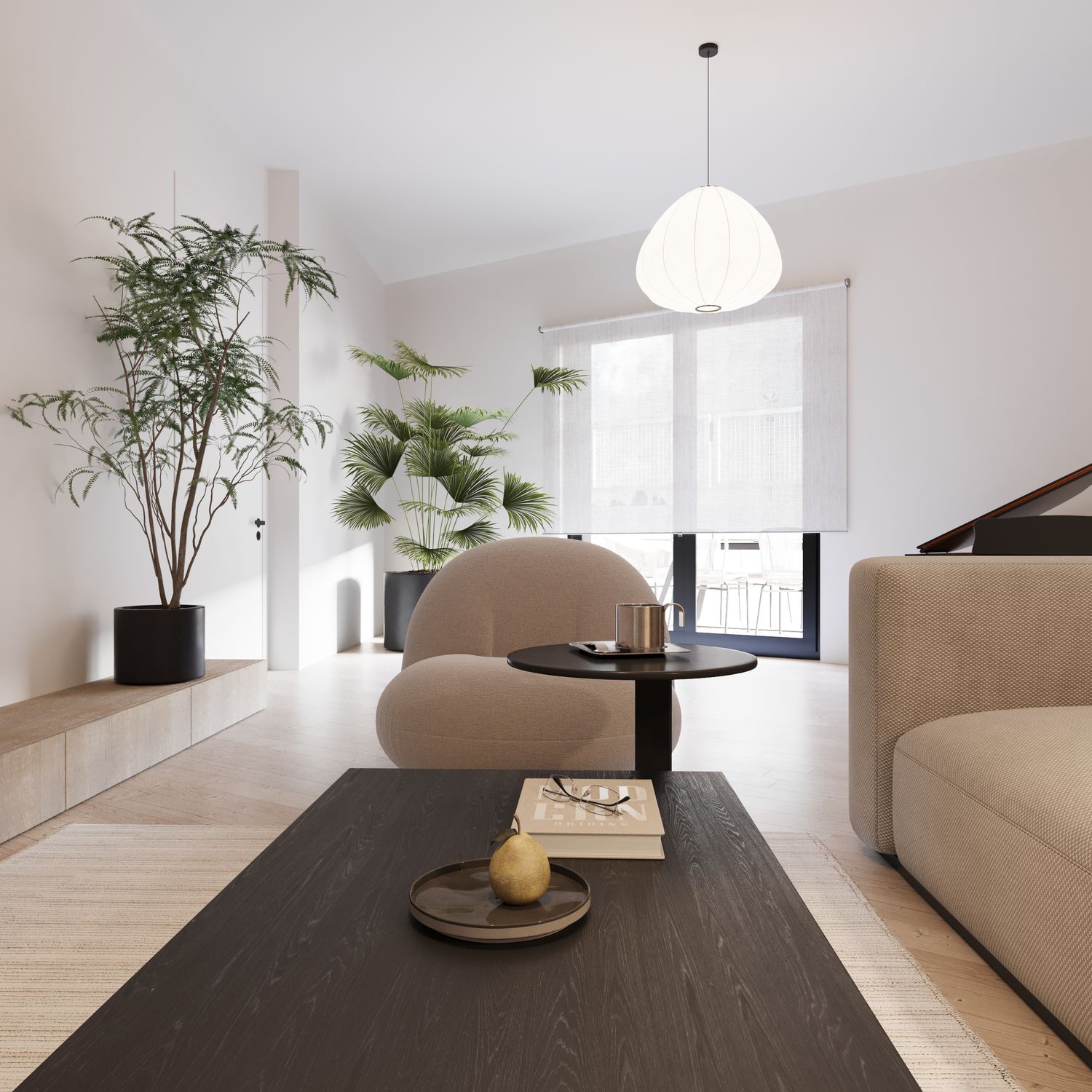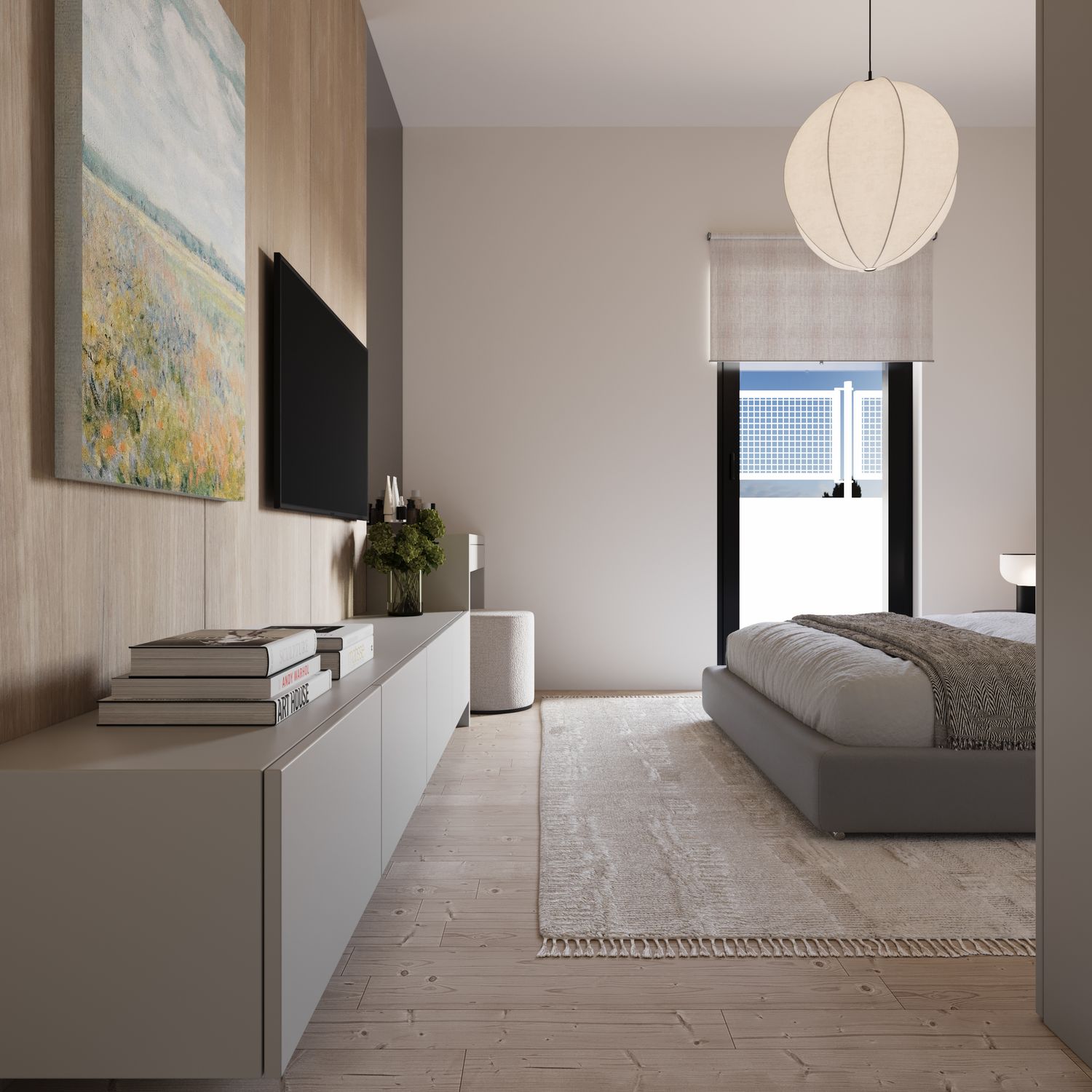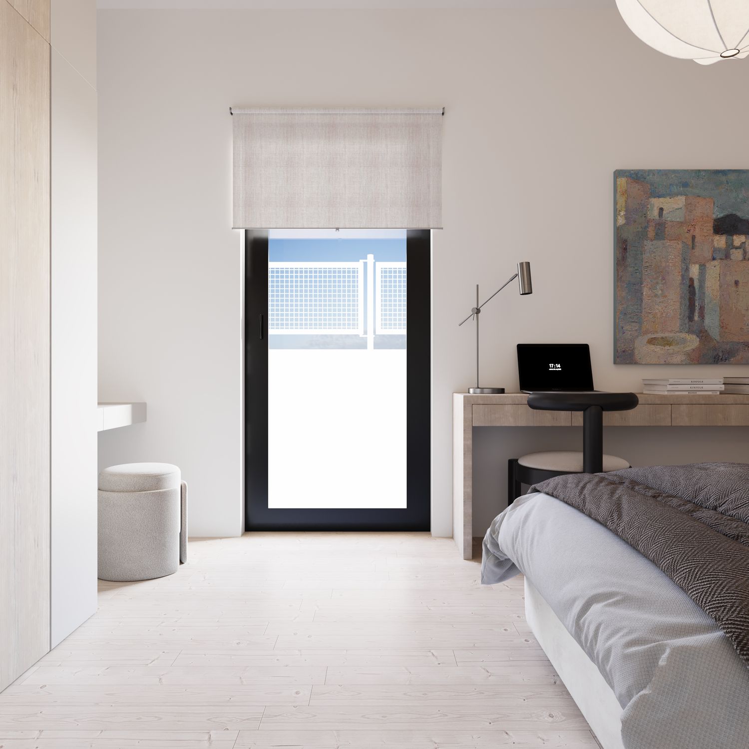 To maintain visual continuity between the indoor areas and the terraces, I’ve used light linen shades in a tone very similar to the wall color. This way, even when the shades are drawn, their soft texture and light color prevent them from acting as a strong visual divider between the interior and exterior spaces.