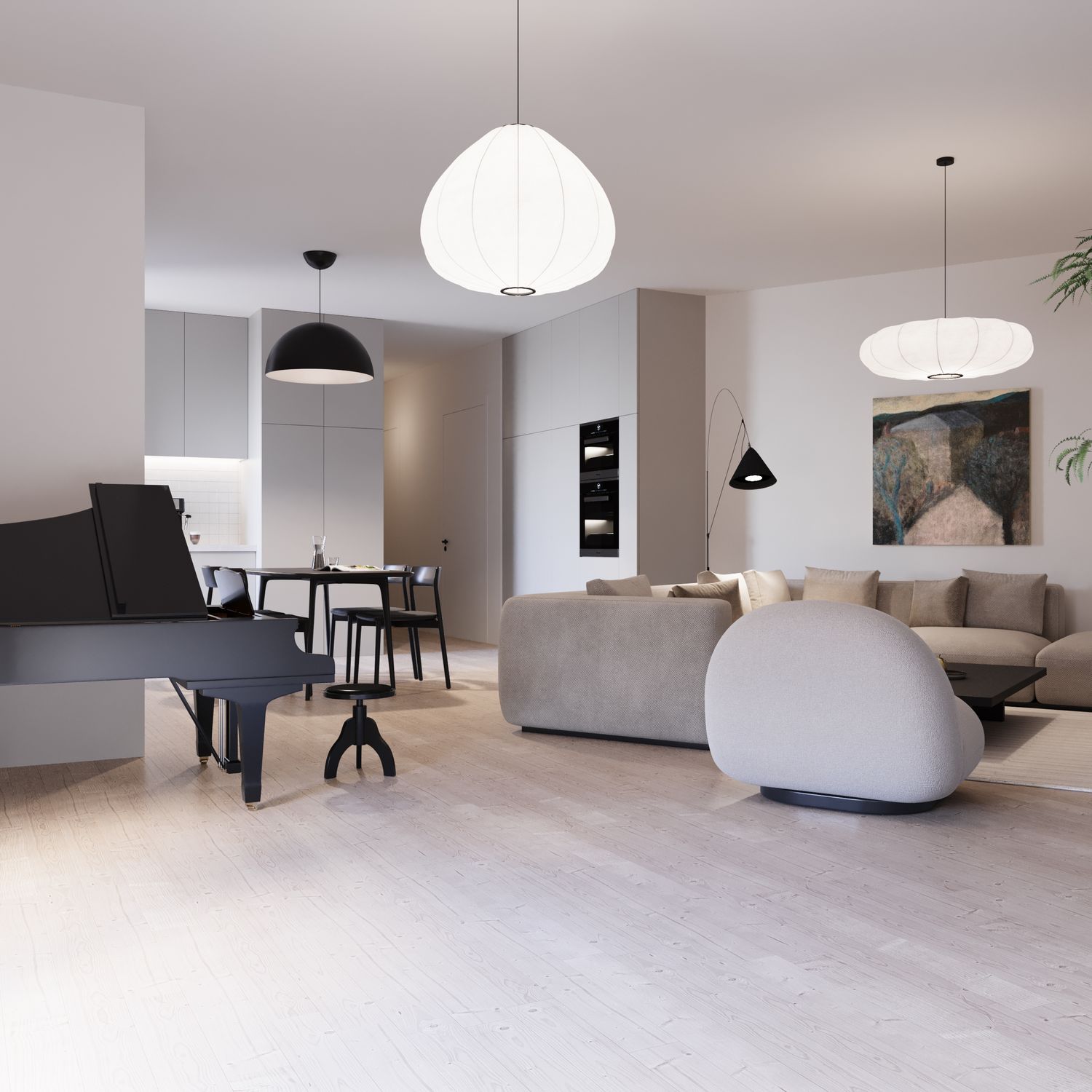 In this setup, the four main central areas of your home, the kitchen, dining area, living room, and the piano space, remain visually distinct but are well connected to each other.