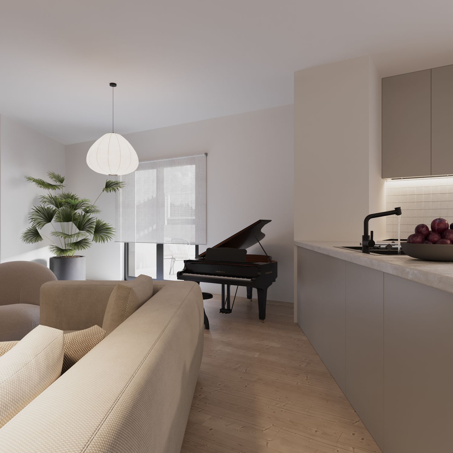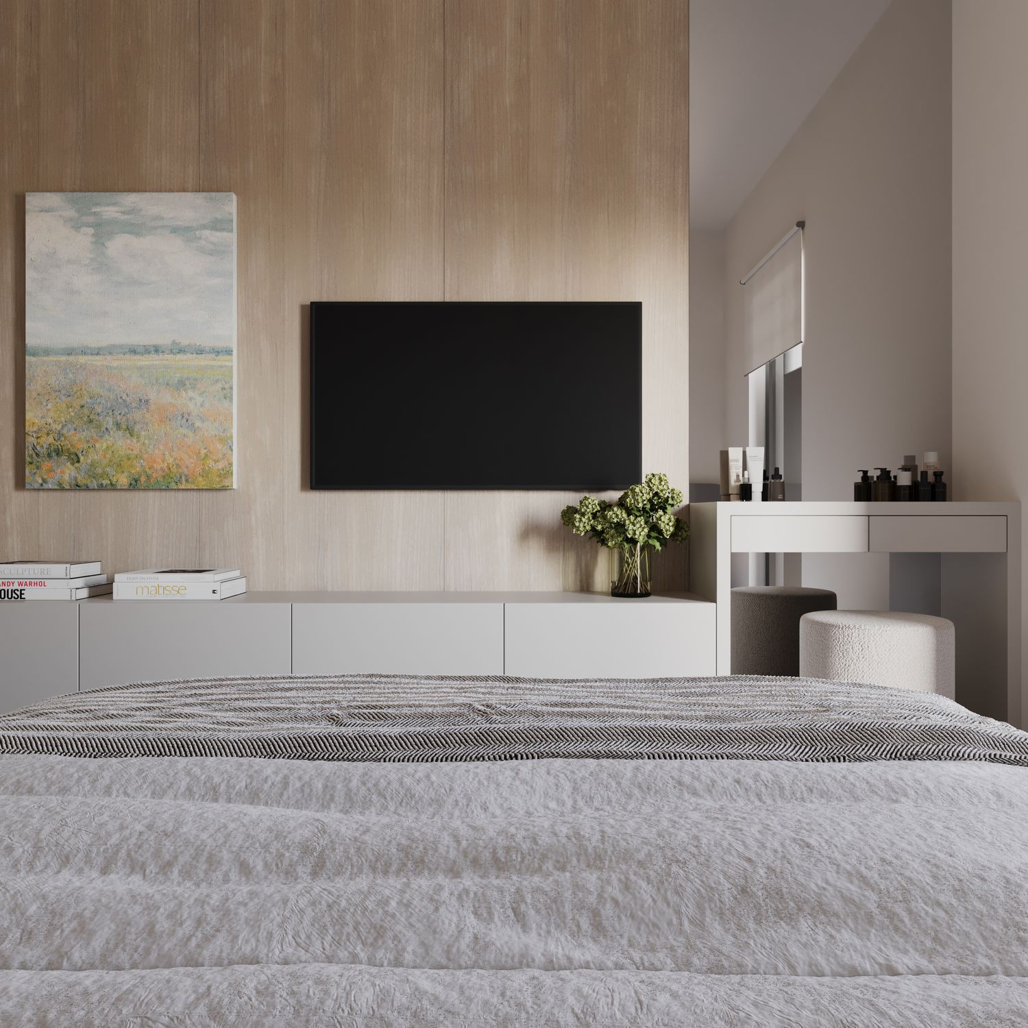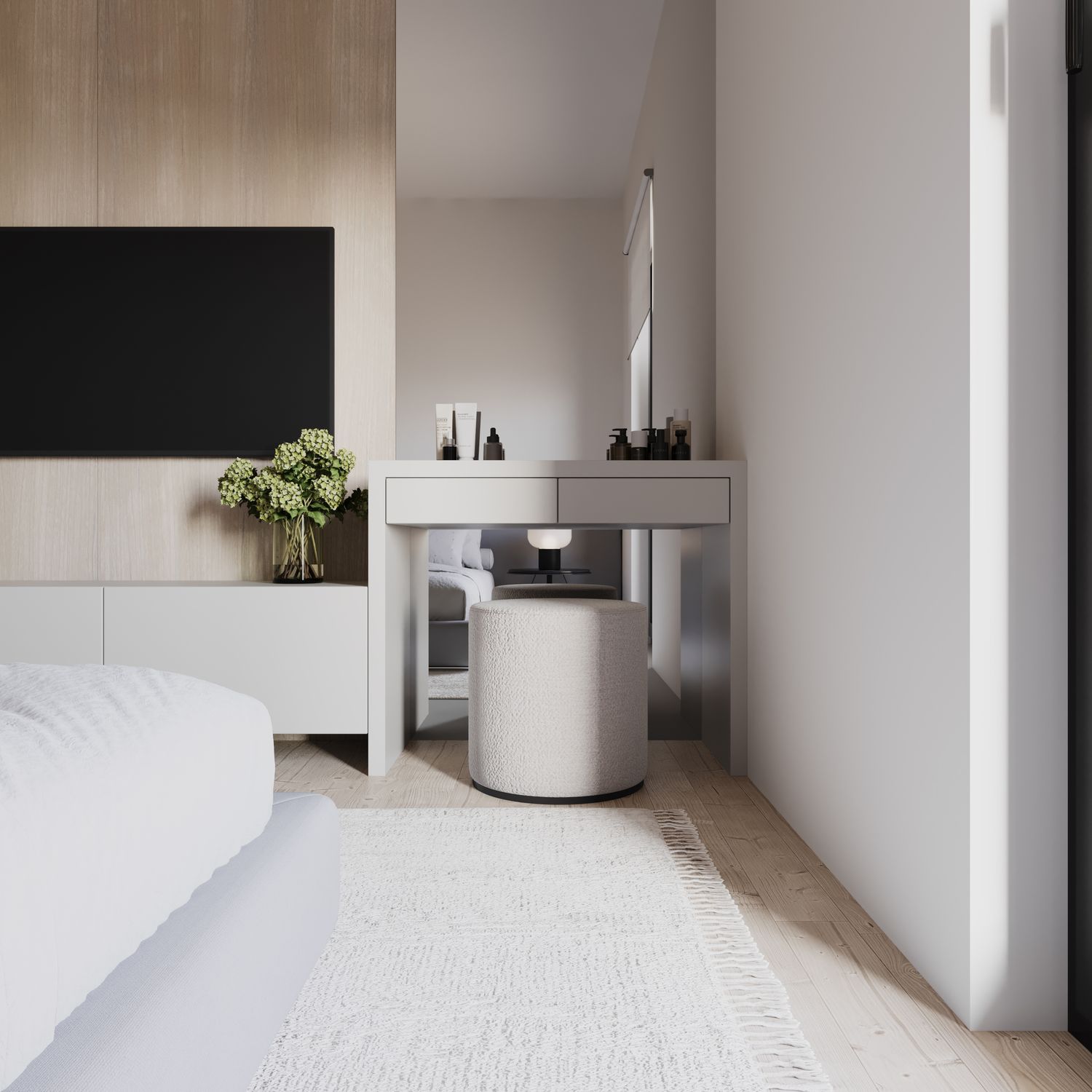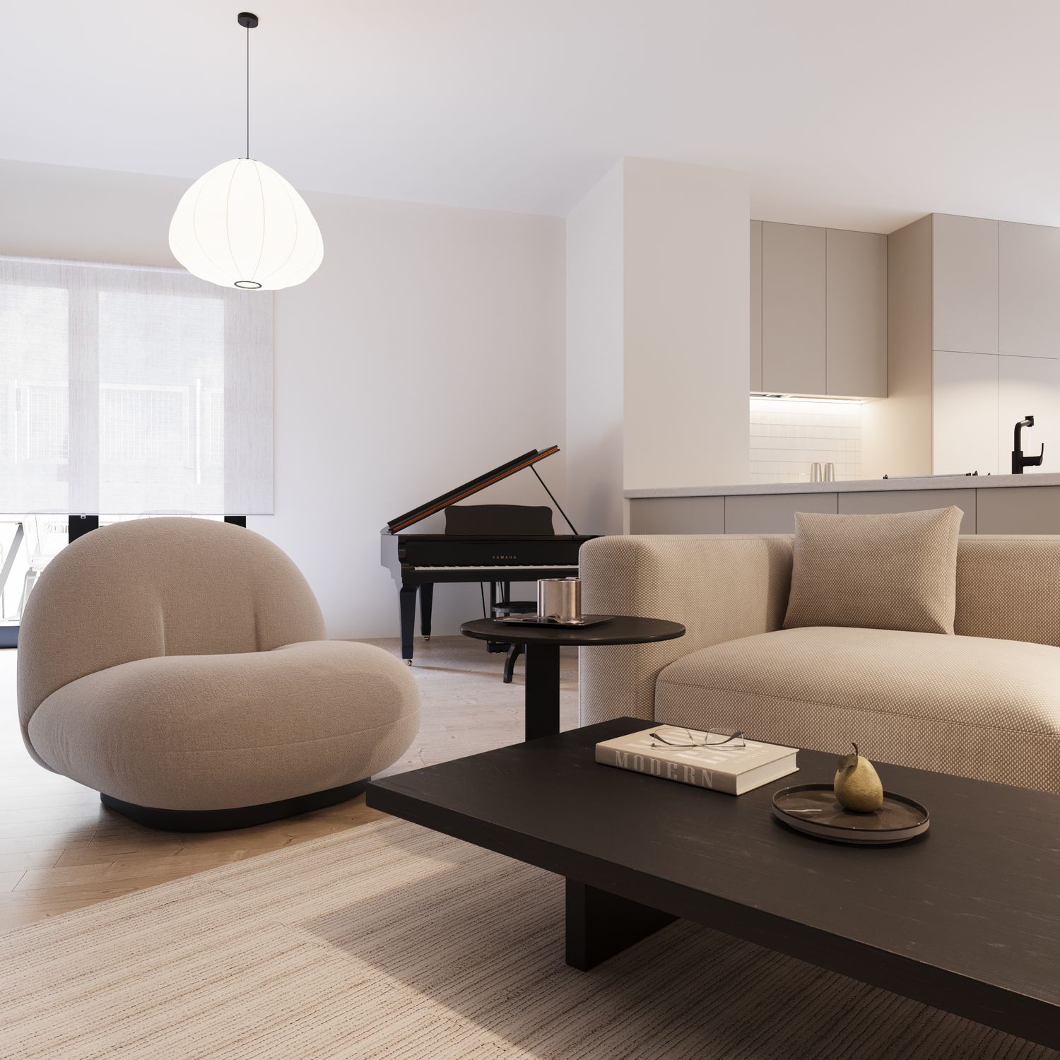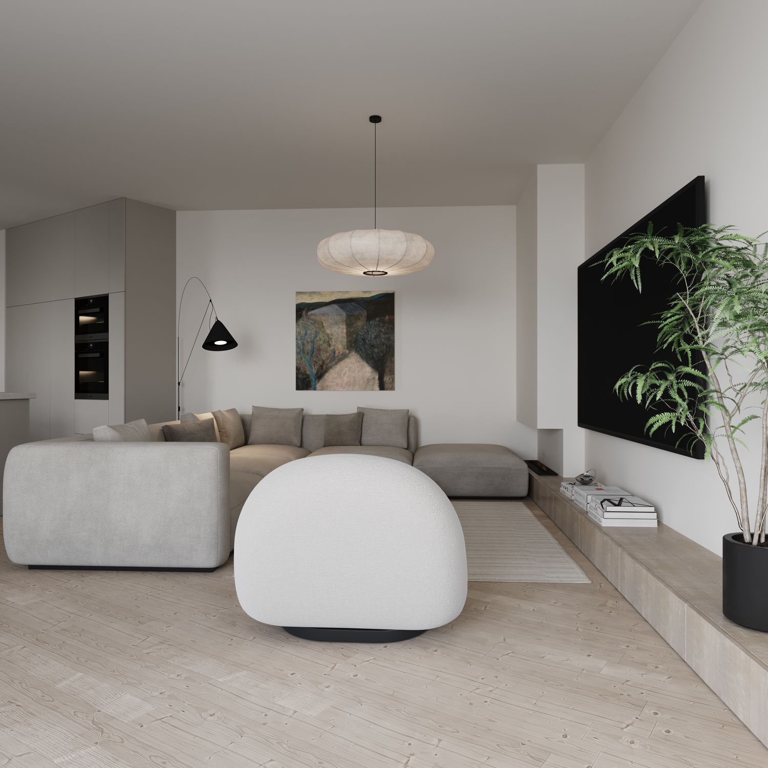 My suggestion for the color of the parquet or laminate flooring is to make it slightly lighter, so the space feels more modern, brighter, and airier. The floor color has a strong impact on the overall atmosphere, and darker tones tend to make the space feel heavier. To achieve a lighter look, there’s no need to replace the flooring, you can simply use a whitewash technique to brighten it up.