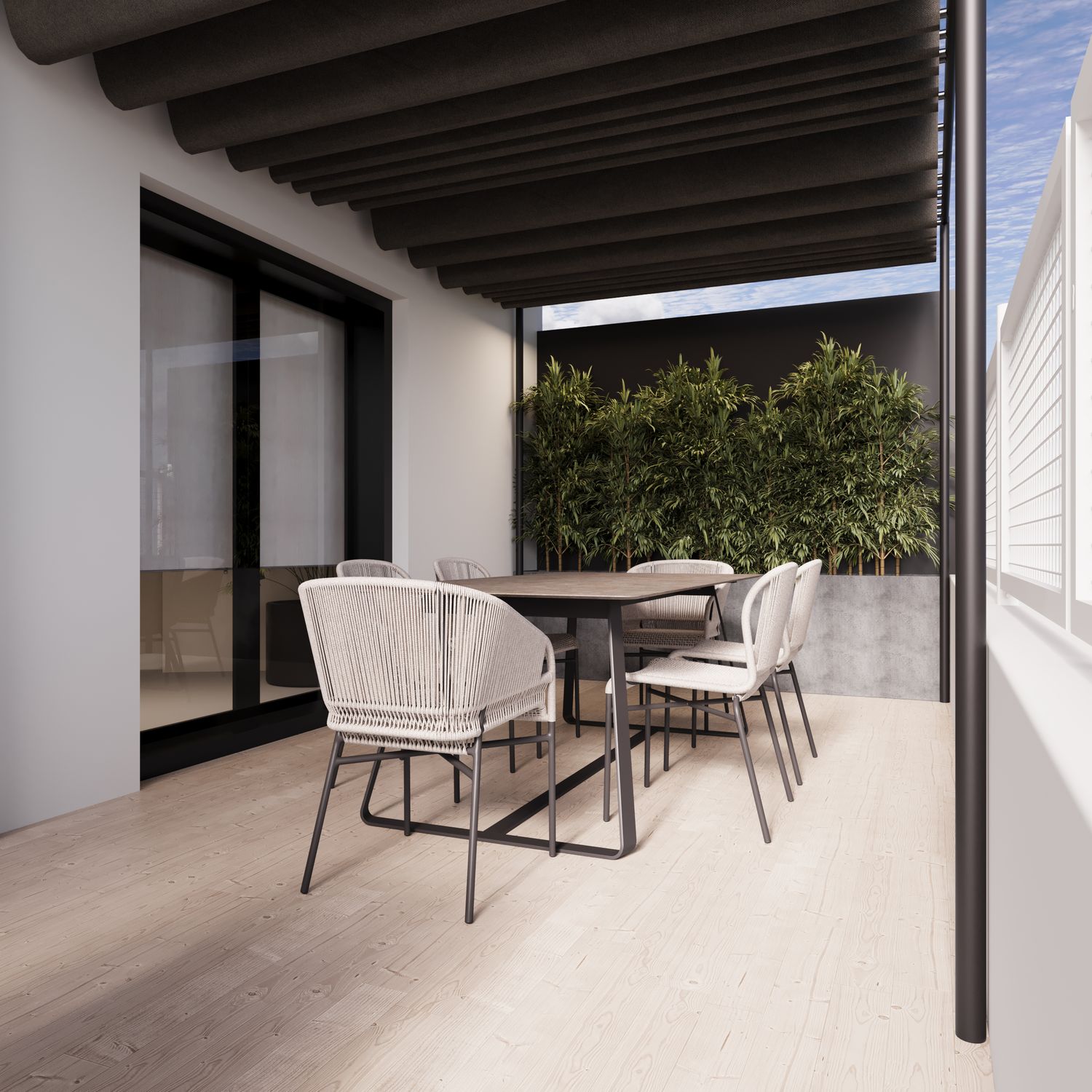 The terrace also includes a shade canopy, making the space comfortable and usable throughout the year, both in summer and winter.