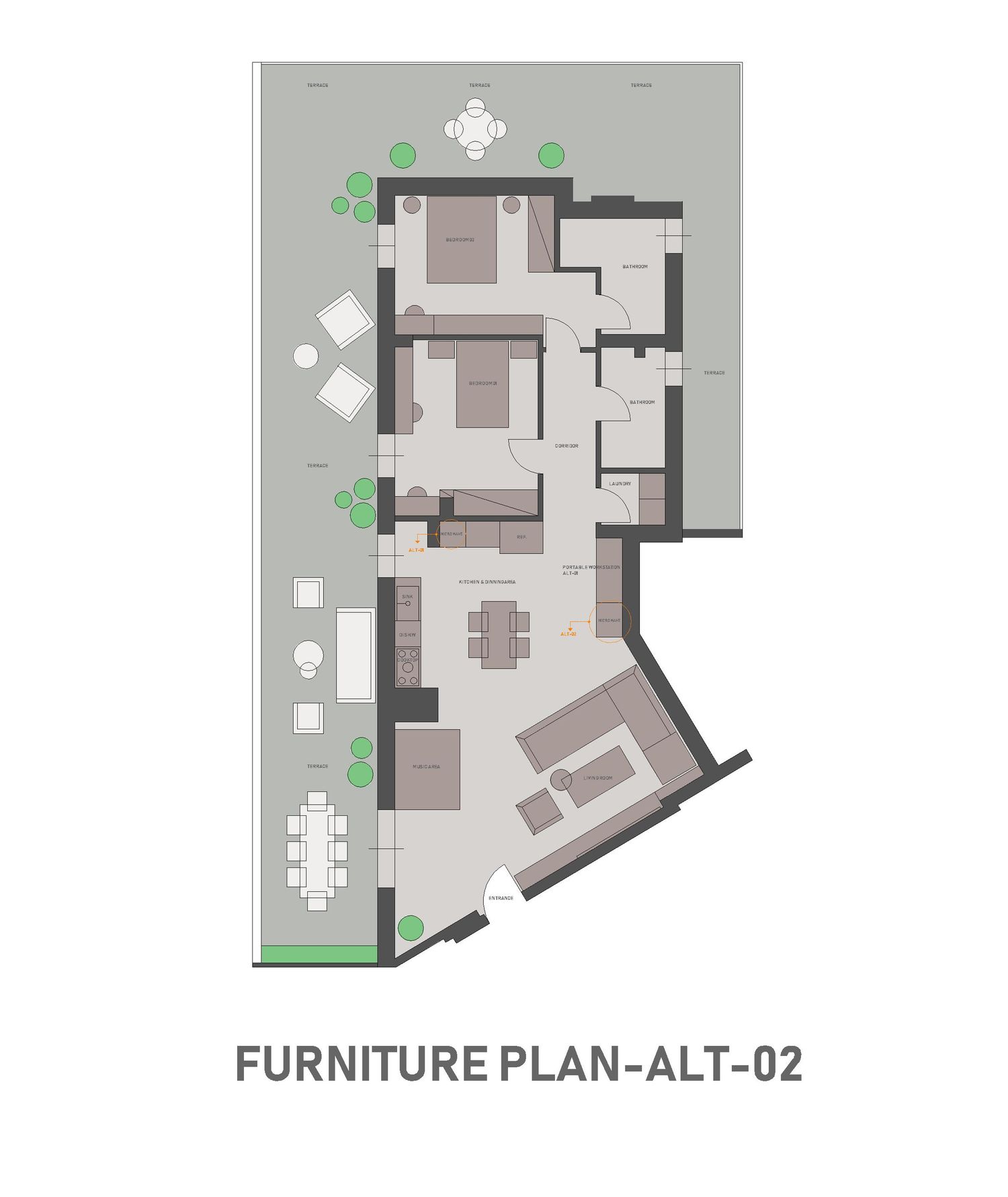 The terrace has been divided into four functional zones, subtly separated by planters. These planters help define each area while still keeping a sense of openness and continuity, and they also bring freshness and vitality to the overall space.