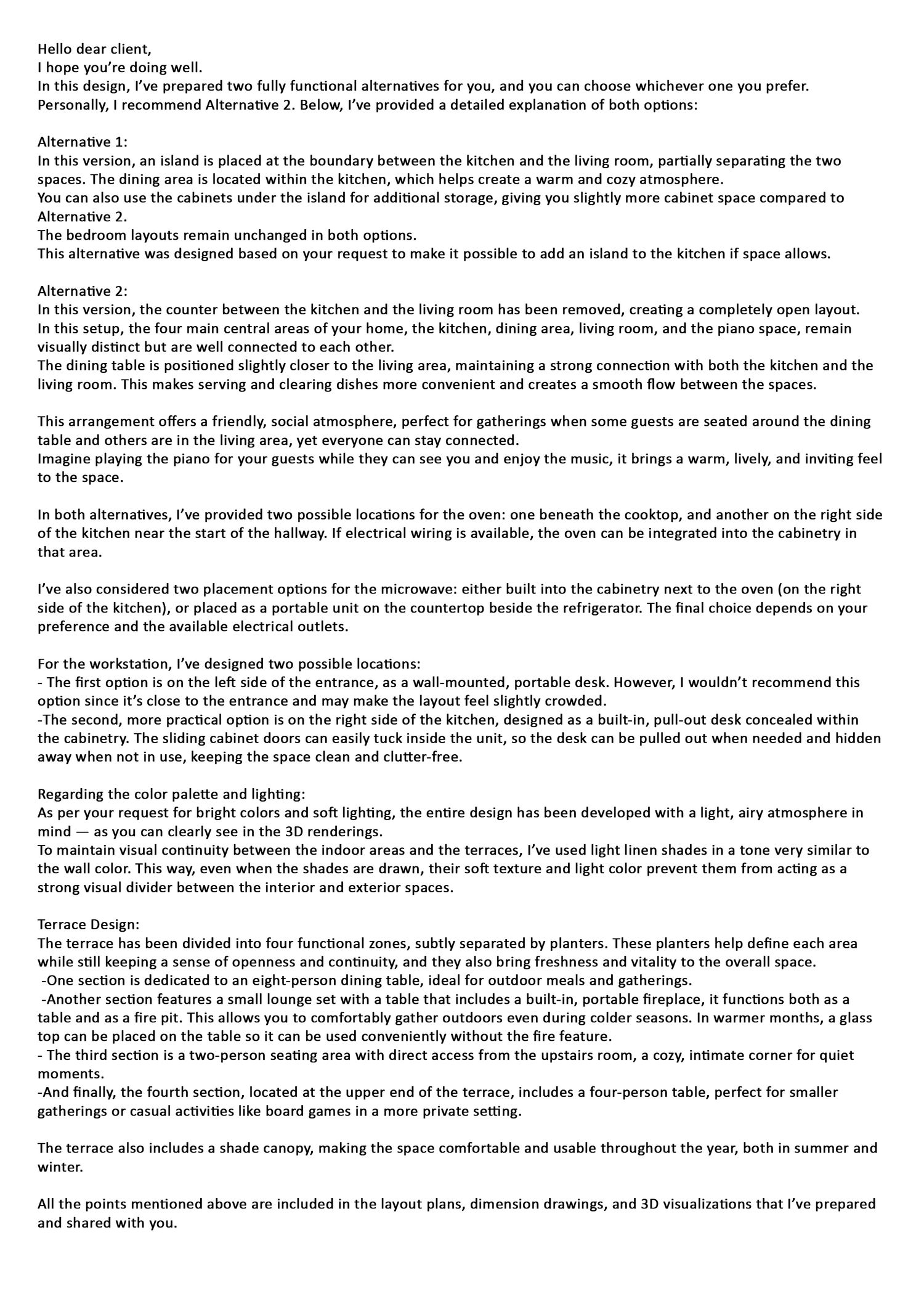All the points mentioned above are included in the layout plans, dimension drawings, and 3D visualizations that I’ve prepared and shared with you.
