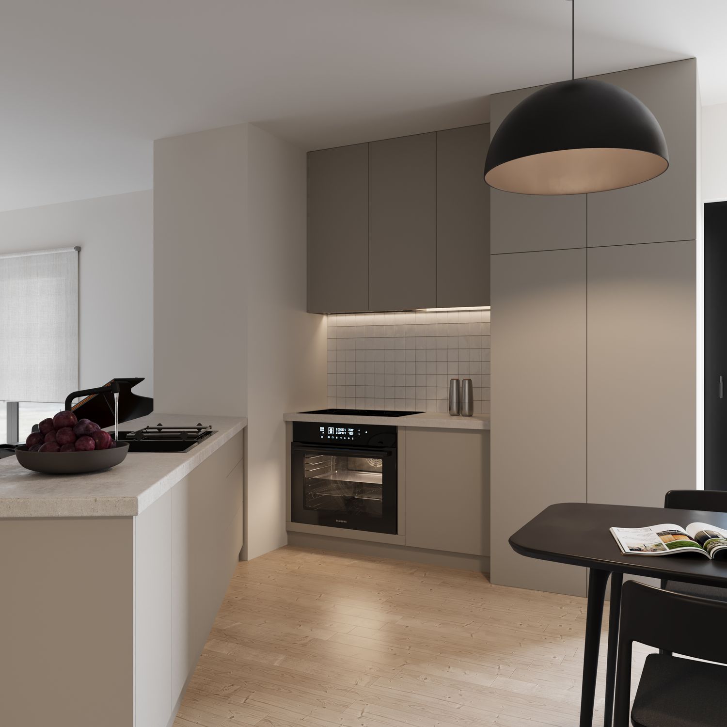 -The second, more practical option is on the right side of the kitchen, designed as a built-in, pull-out desk concealed within the cabinetry. The sliding cabinet doors can easily tuck inside the unit, so the desk can be pulled out when needed and hidden away when not in use, keeping the space clean and clutter-free.