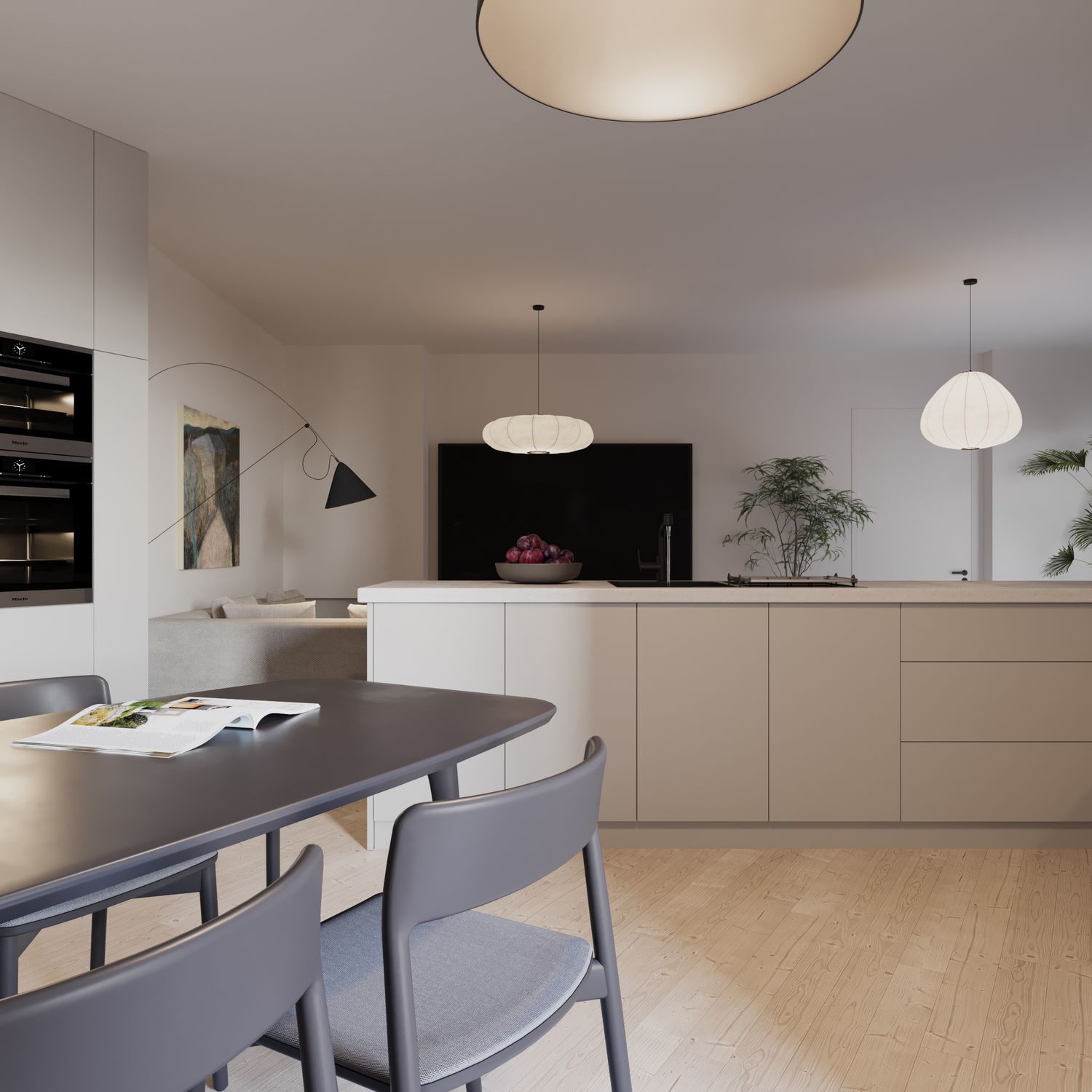 The dining table is positioned slightly closer to the living area, maintaining a strong connection with both the kitchen and the living room. This makes serving and clearing dishes more convenient and creates a smooth flow between the spaces.
