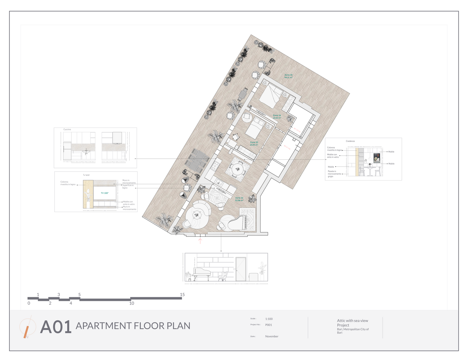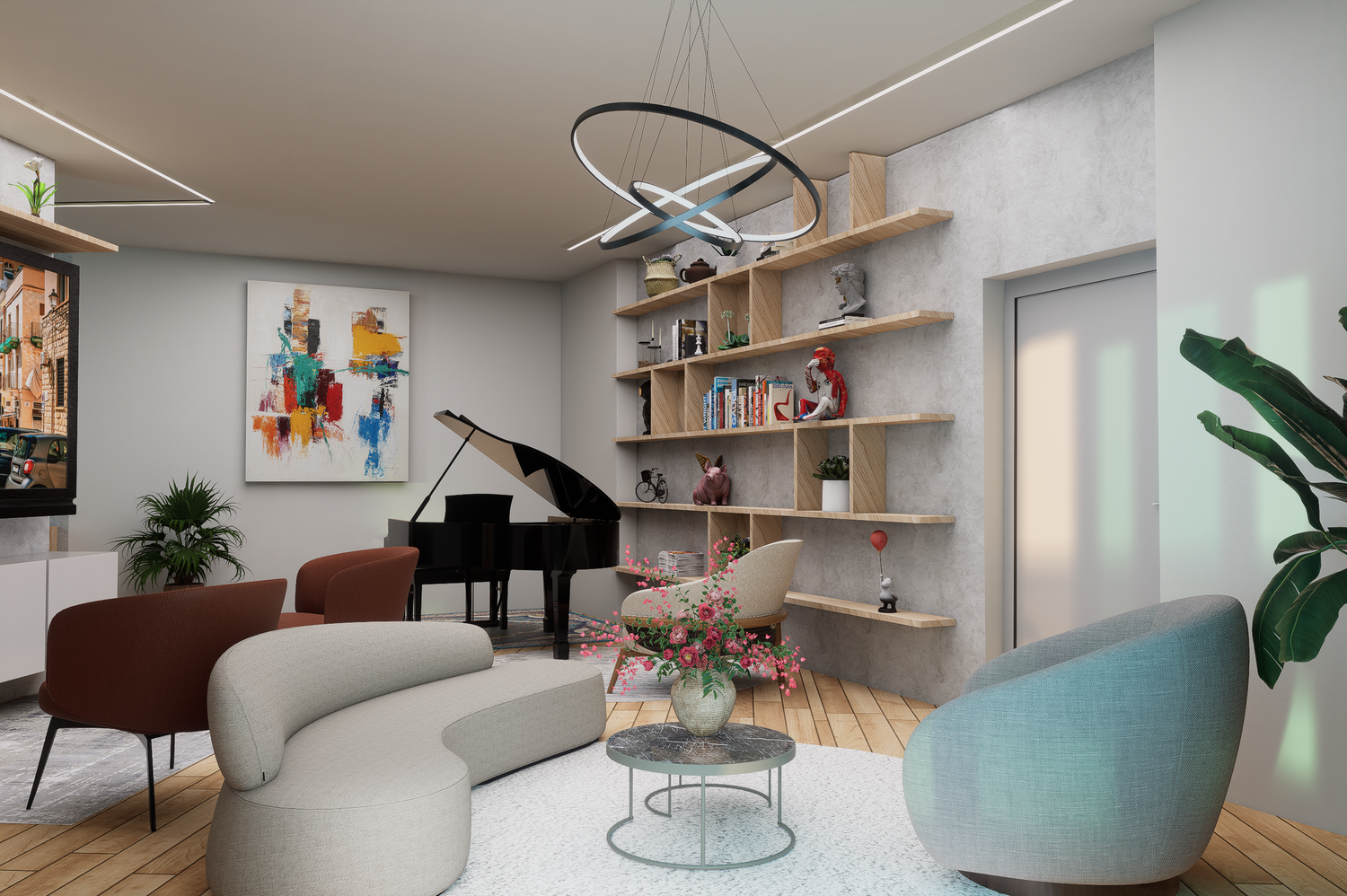 Vegetation plays a key role, both indoors and on the terrace, where vertical gardens and low plants maintain visual transparency toward the sea. The result is a harmonious, sustainable space that promotes fluidity, comfort, and aesthetic coherence—an architectural dialogue between music, light, and landscape.