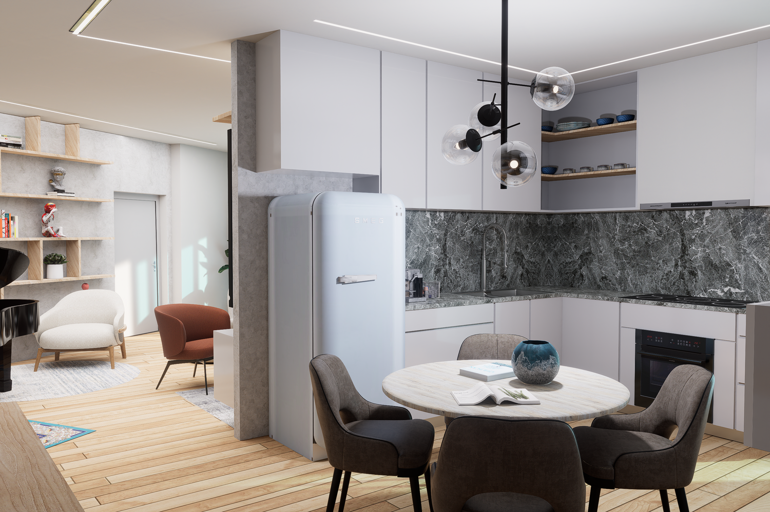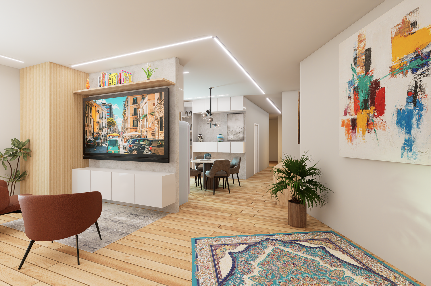 The project redefines an existing residence through openness, light, and continuity. By demolishing the walls indicated by the client, the design integrates the living room, dining area, and kitchen into a single, fluid space that frames the sea view and enhances the connection between interior and exterior. A new wall, precisely dimensioned to accommodate a 100” TV, becomes the central articulating element between living and kitchen areas, balancing openness with subtle privacy.