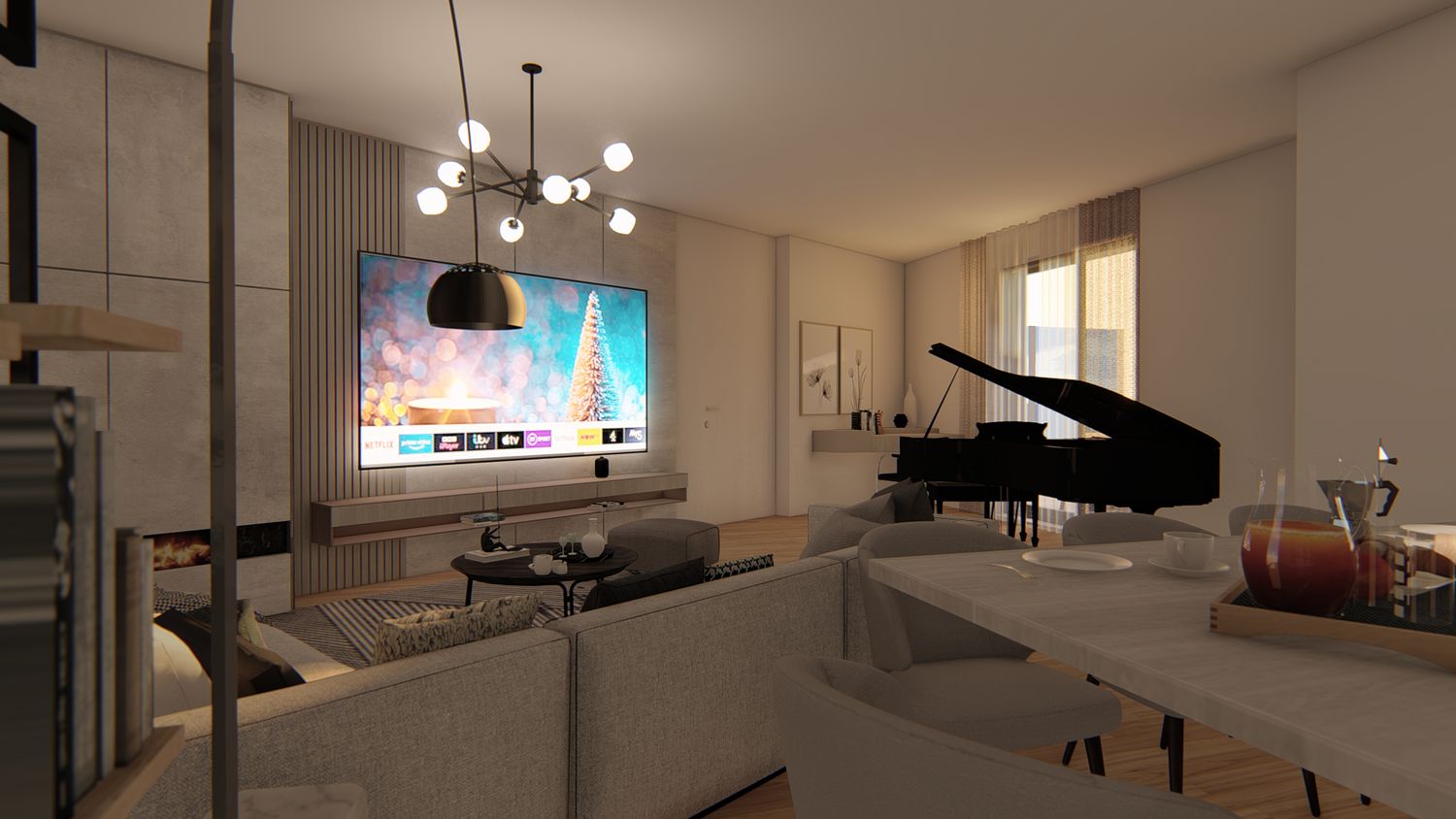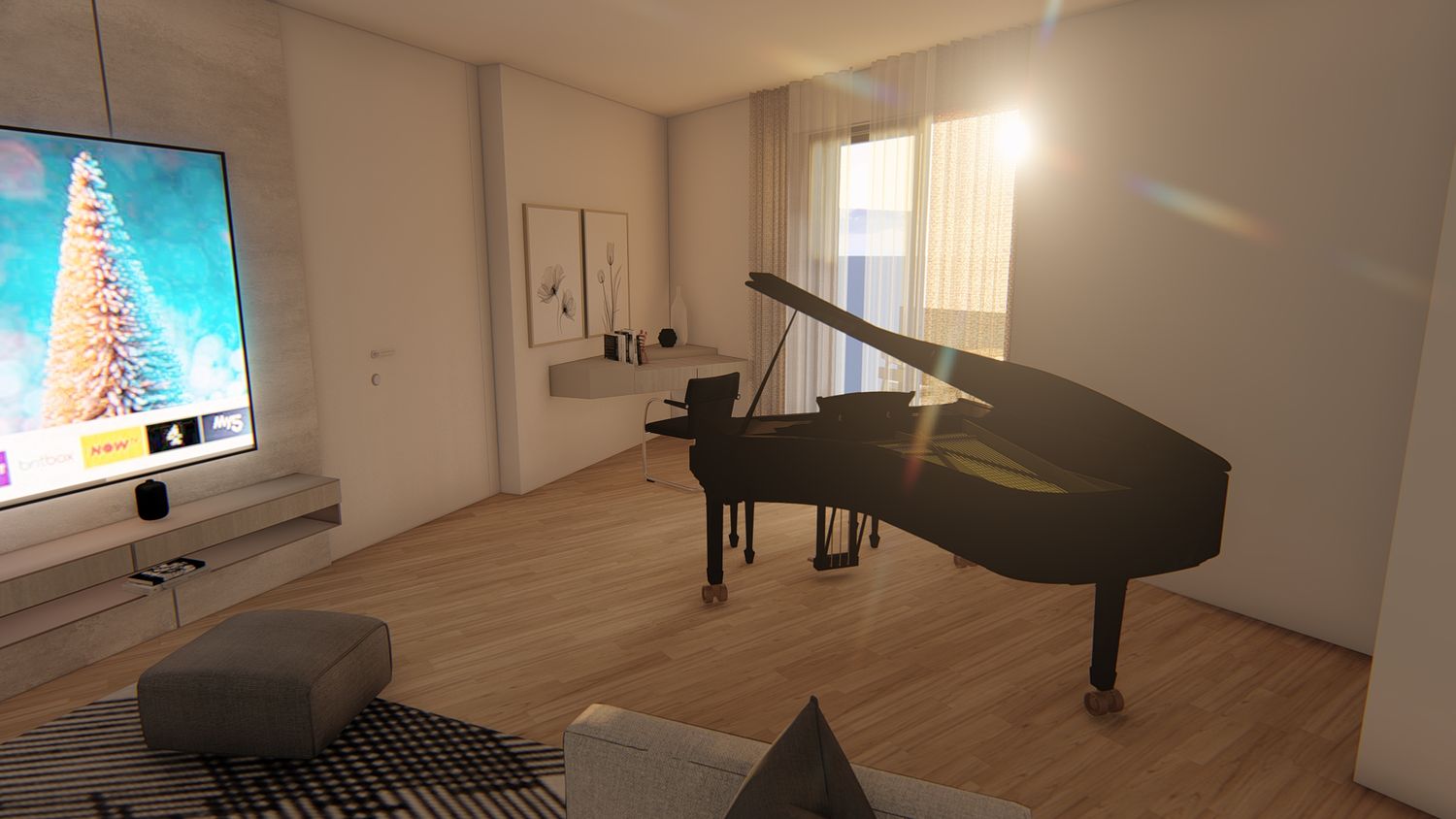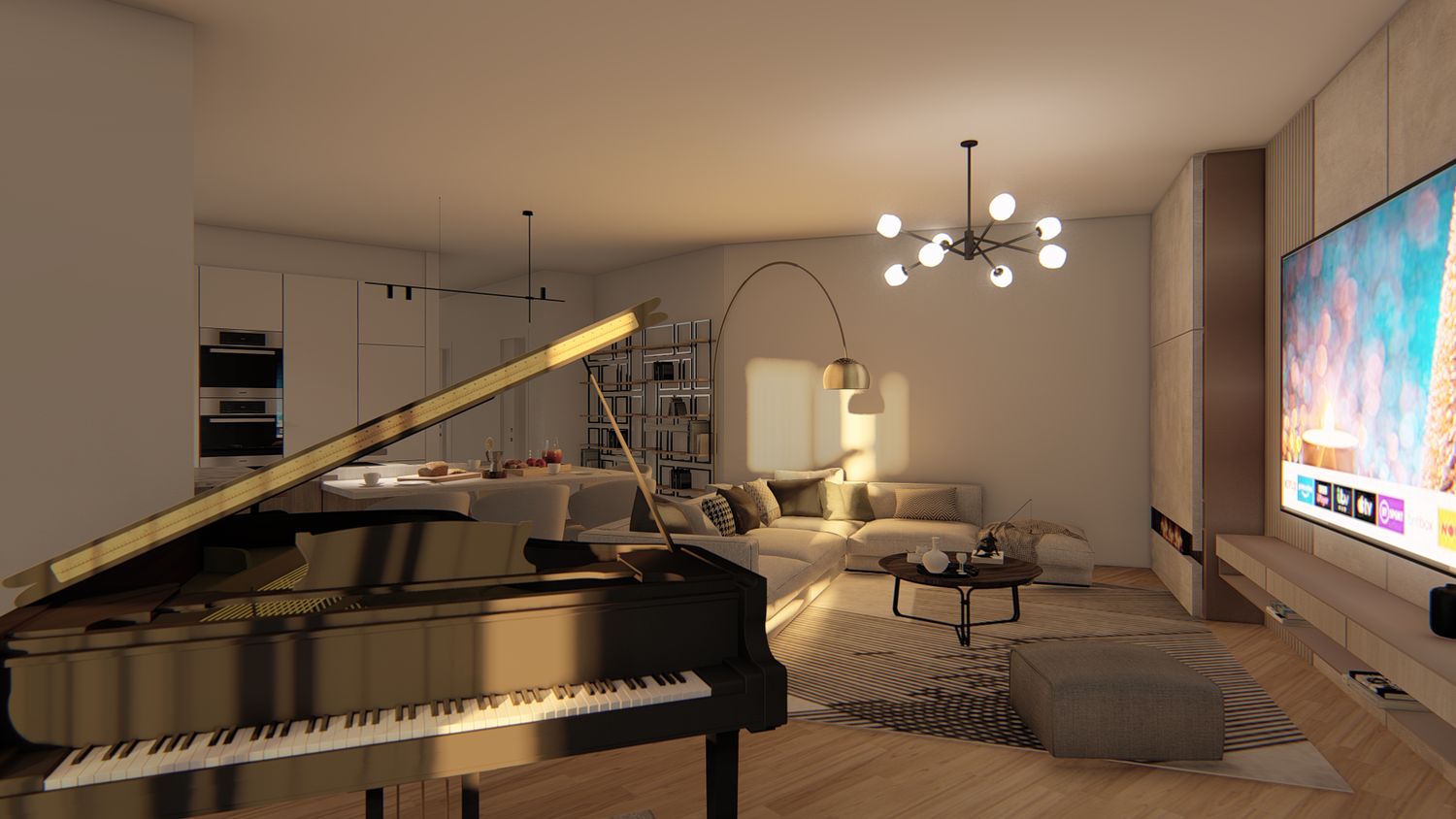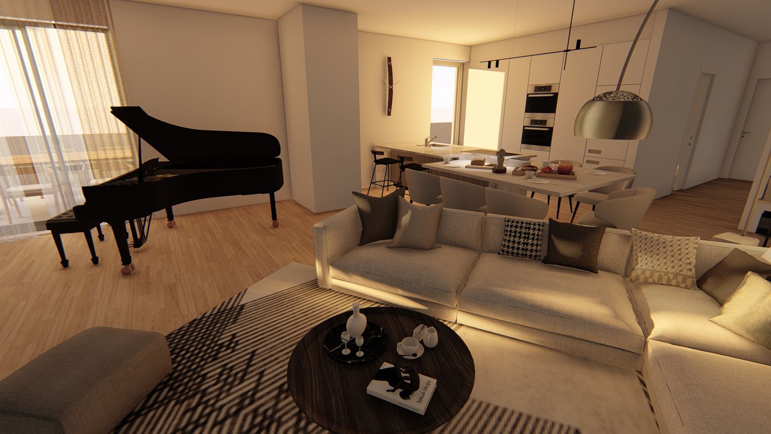 Il nostro progetto propone la demolizione della tramezzatura della terza camera, in modo da ottenere l'open space desiderato dal cliente, con una grande area living in cui il divano, posizionato obliquamente rispetto alla cucina ed all'area pranzo, dialoga con esse e con il pianoforte in modo dinamico, arredando lo spazio senza ingombrarlo in modo eccessivo.