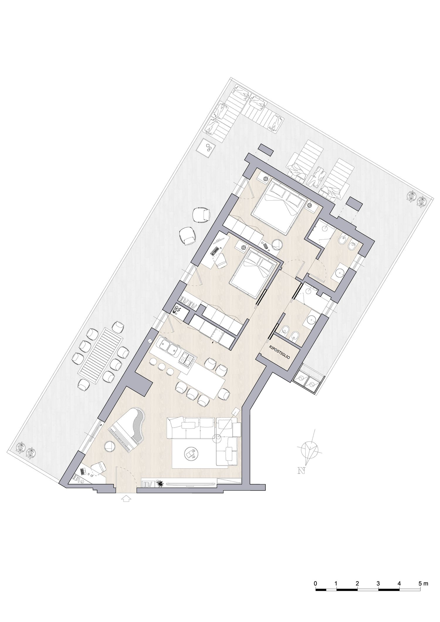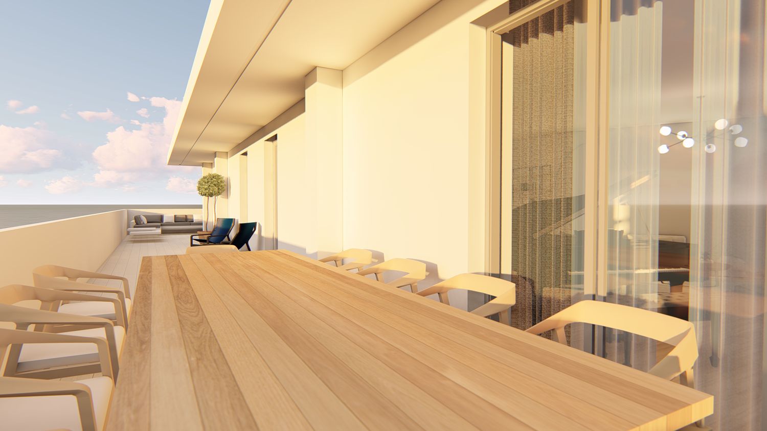 Sulla grande terrazza, l'area più prossima al soggiorno viene arredata con un ampio tavolo in alluminio e legno, perfetto per ospitare e pranzare/cenare all'aperto, mentre lo spazio accanto alle camere, affacciato verso sud/sud est, diventa un'area lounge/relax con divani e lettini, che potrà essere protetta on demand con un pergolato leggero in alluminio o legno.