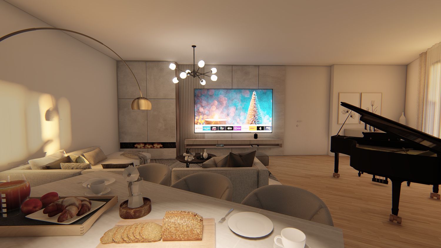 Lo spazio accanto all'ingresso è perfetto per appoggiare una parete attrezzata leggera e materica, con camino lineare a bioetanolo e spazio a sufficienza per la TV 100 pollici, che diventa protagonista della scena.