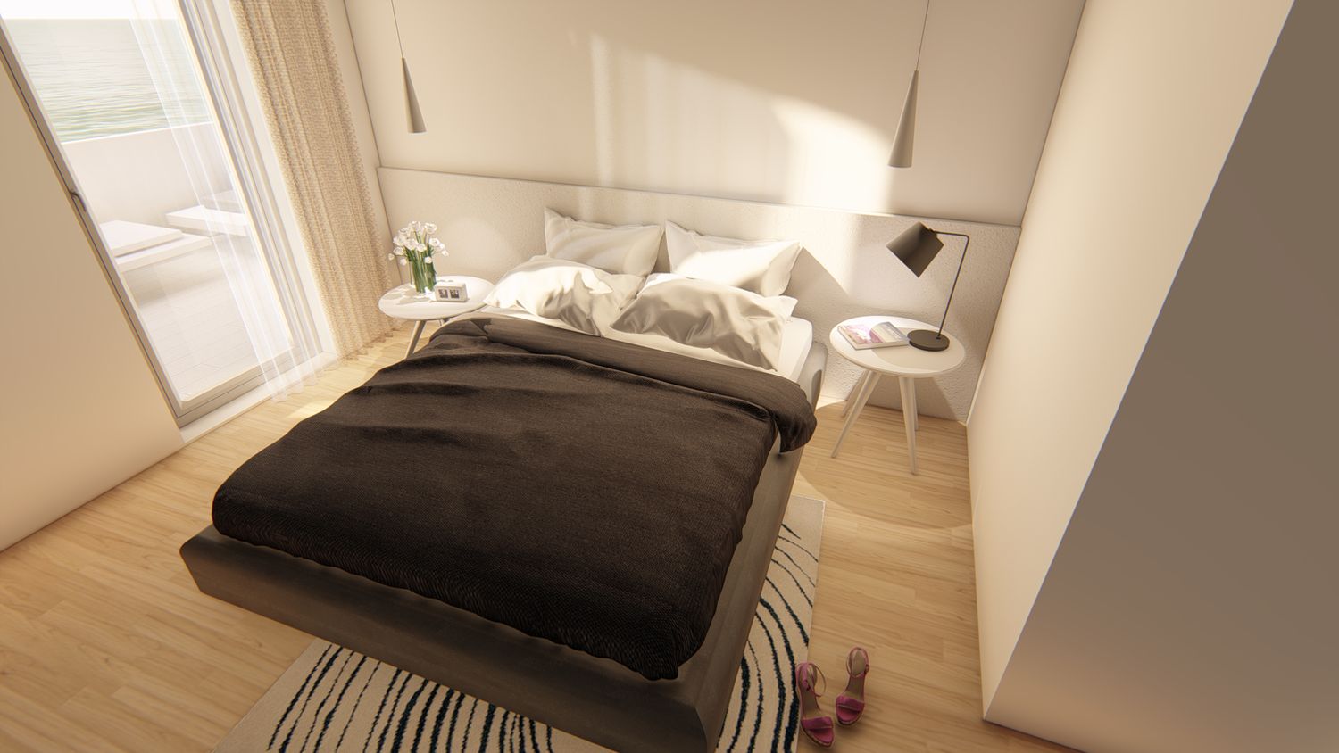 Le due camere da letto sono arredate in modo essenziale, secondo la richiesta del cliente, con letti sommier appoggiati a testate ricavate in legno o direttamente con un piccolo spessore murario, guardaroba dalle linee pulite e minimali, una scrivania per la camera singola ed un piccolo angolo vanity per la matrimoniale.