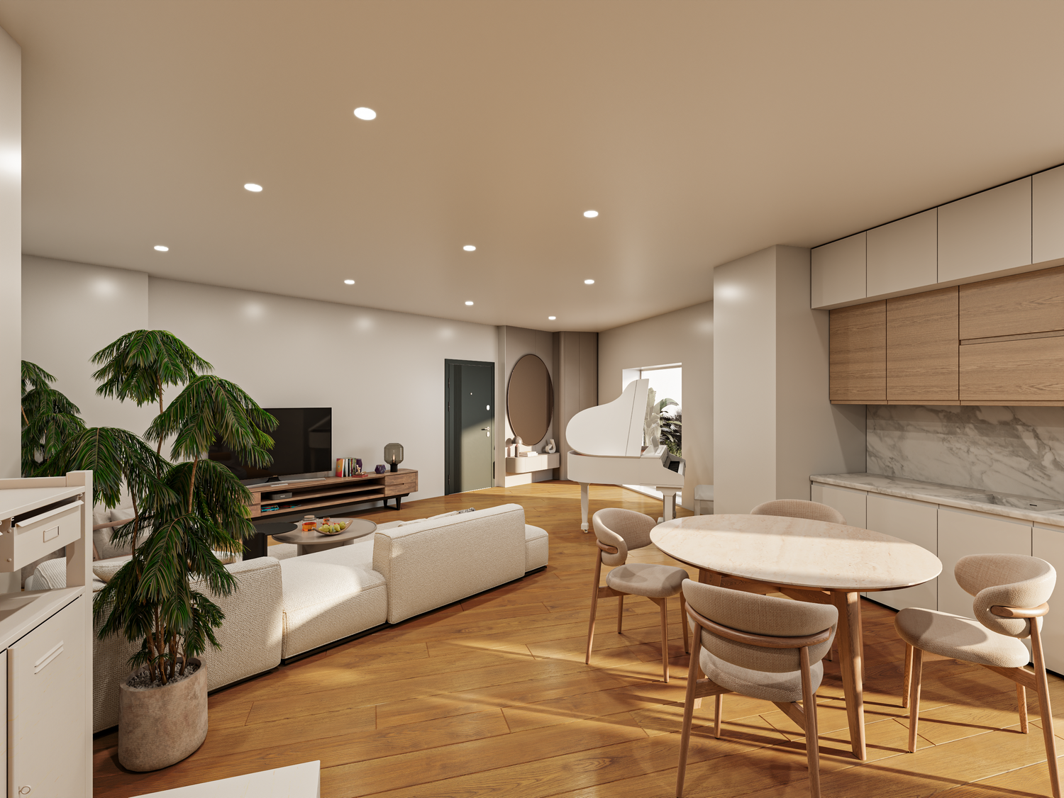Perched above the coastline, Attic with Sea View celebrates the interplay between modern architecture and nature. The design emphasizes clean, contemporary lines and an open layout that maximizes natural light and panoramic sea views. Integrated planters bring a touch of greenery indoors and soften the geometry of the space, creating a tranquil connection between the built environment and the surrounding landscape. The result is a serene retreat that balances minimalism with warmth โ a living space framed by the ocean and enriched by nature.