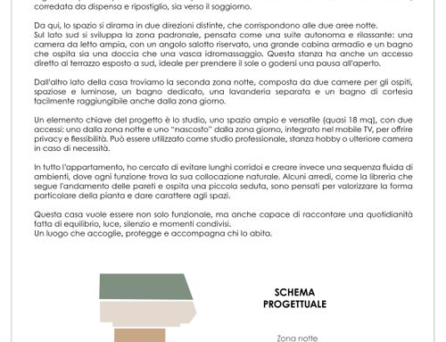 L’intero appartamento dovrà riflettere uno stile moderno, dalle linee pulite, con spazi ariosi e soluzioni funzionali. Si prediligono materiali contemporanei, finiture di qualità, soluzioni salvaspazio e un’attenta progettazione dell’illuminazione naturale e artificiale.